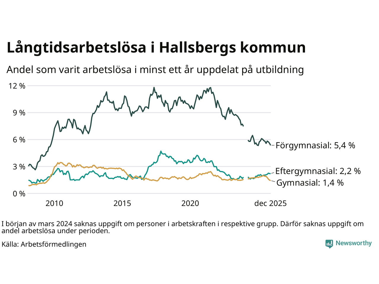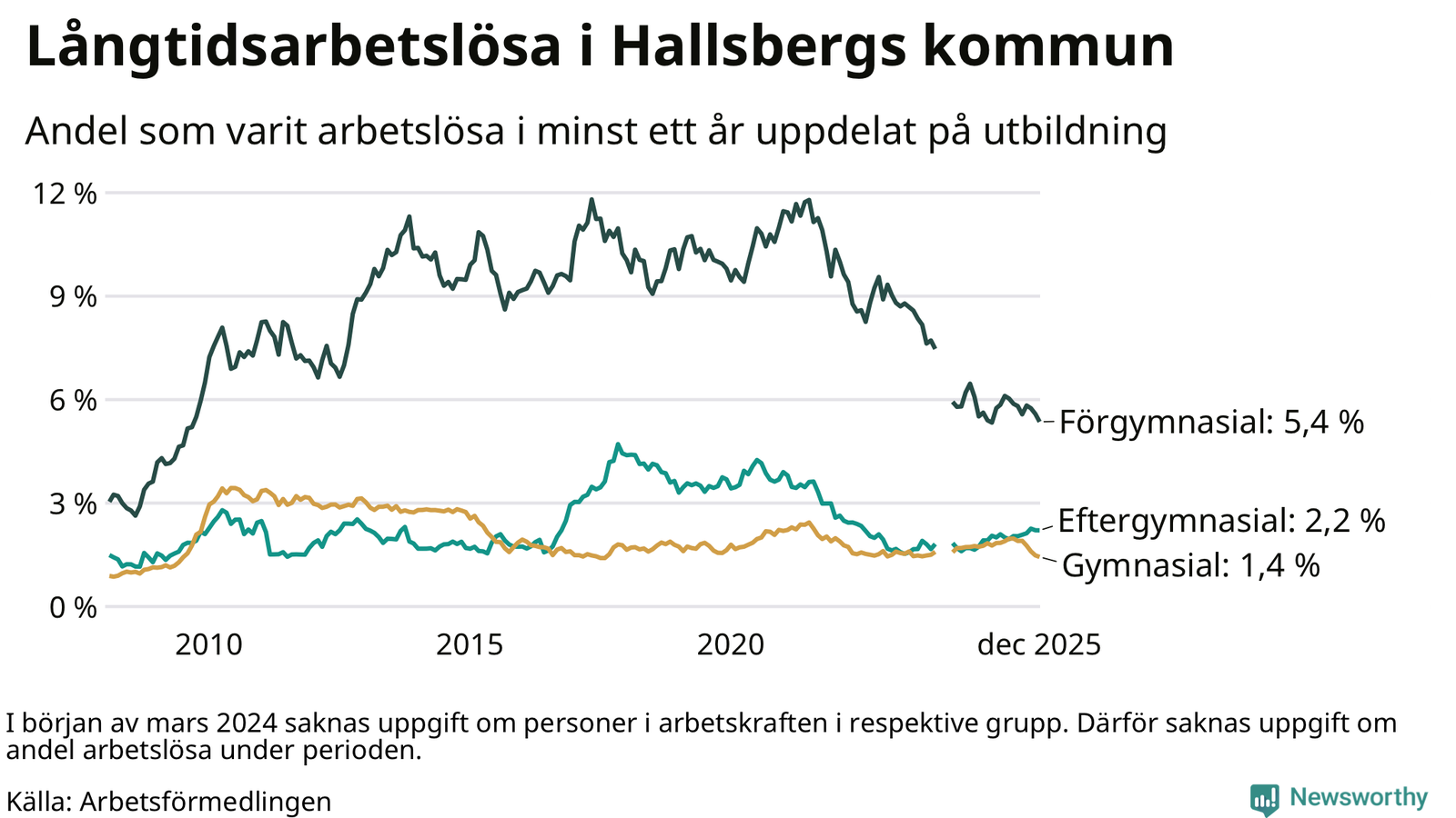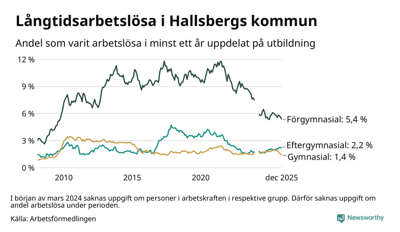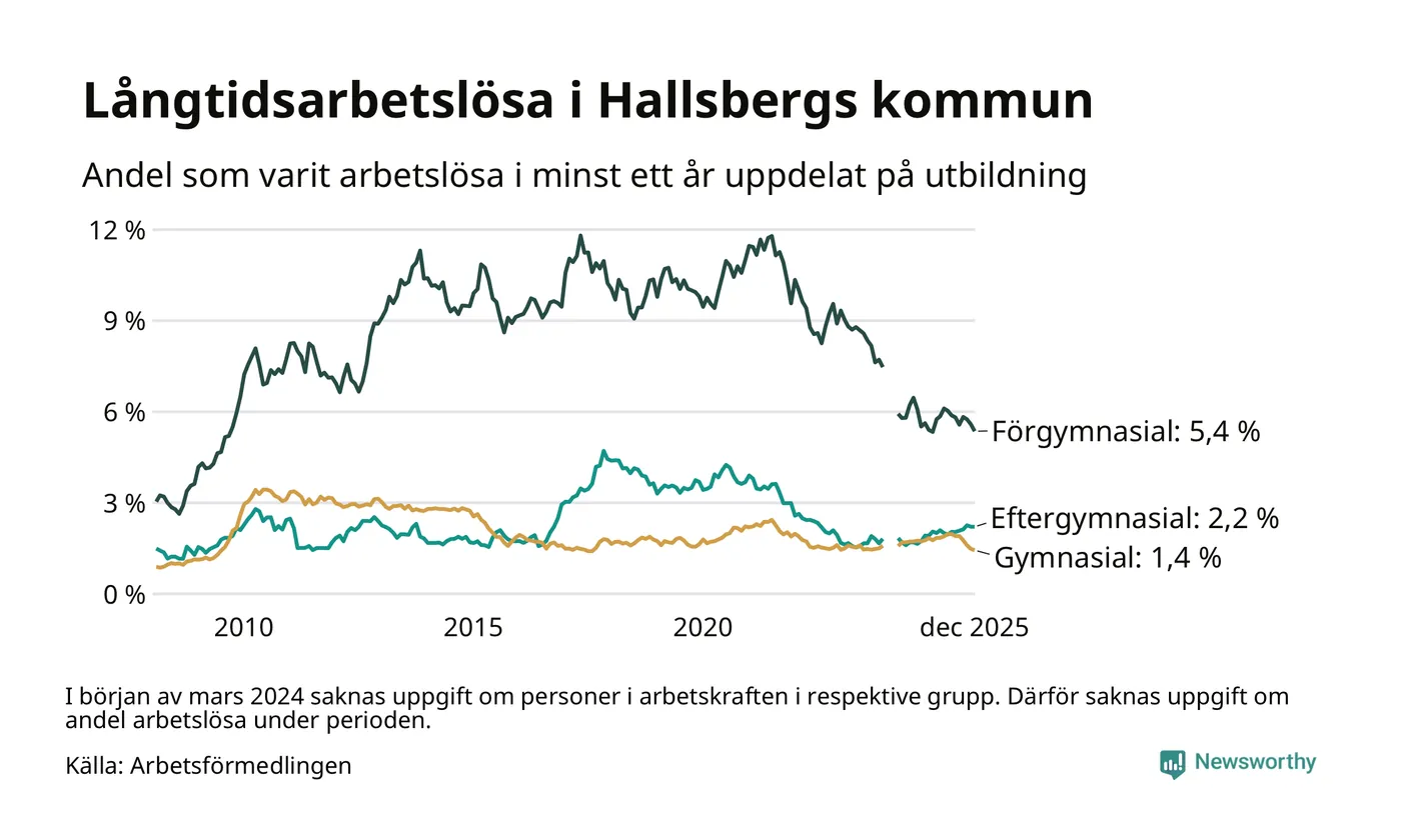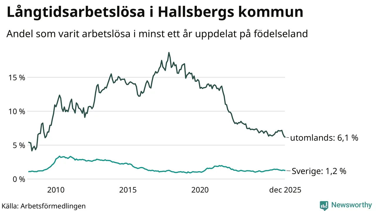 Antalet långtidsarbetslösa minskade i Hallsberg i december jämfört med månaden innan. Därmed har antalet långtidsarbetslösa minskat varje månad sedan i juni 2025.