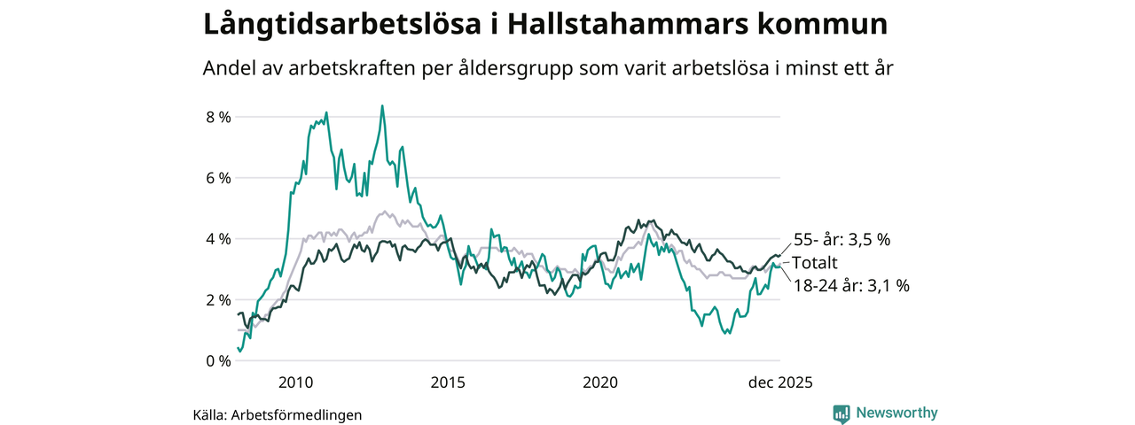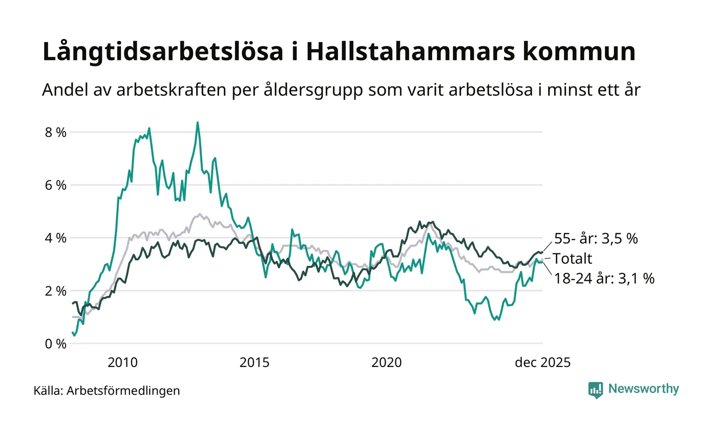 Av de 247 personerna som varit arbetslösa i mer än ett år i Hallstahammars kommun är 63 personer mellan 55 och 651 år och 22 är mellan 18 och 24 år. För den äldre gruppen är andelen arbetslösa 3,5 procent medan den i den yngre gruppen är 3,1 procent. Även i riket som helhet är långtidsarbetslösheten högre i gruppen äldre.
