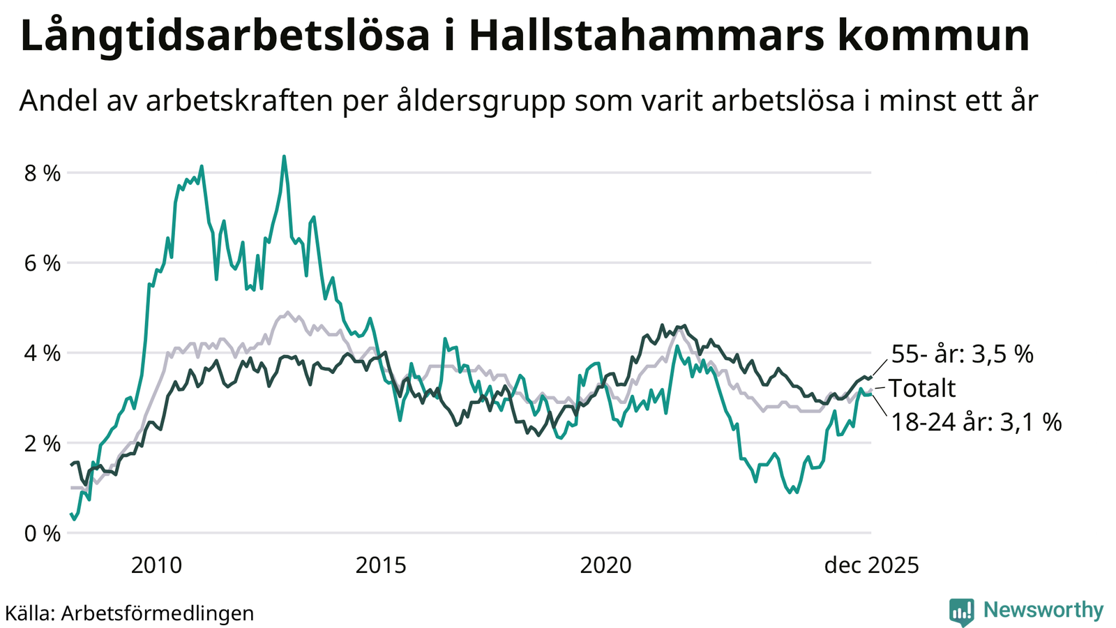 Graf: Andel arbetslösa uppdelat i åldersgrupper i Hallstahammar