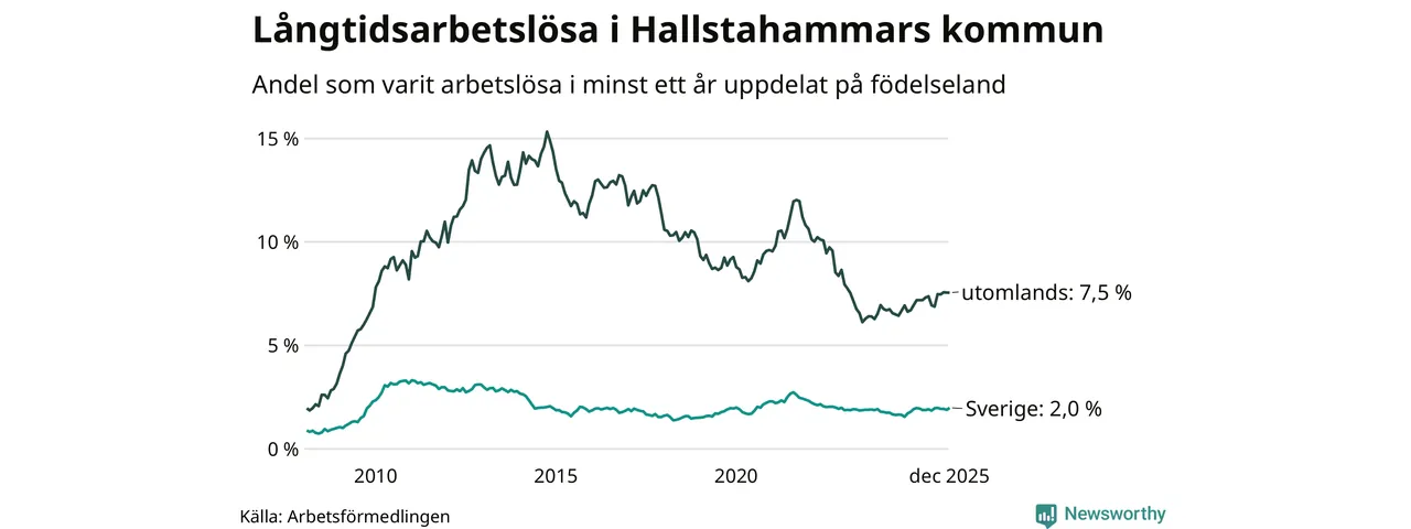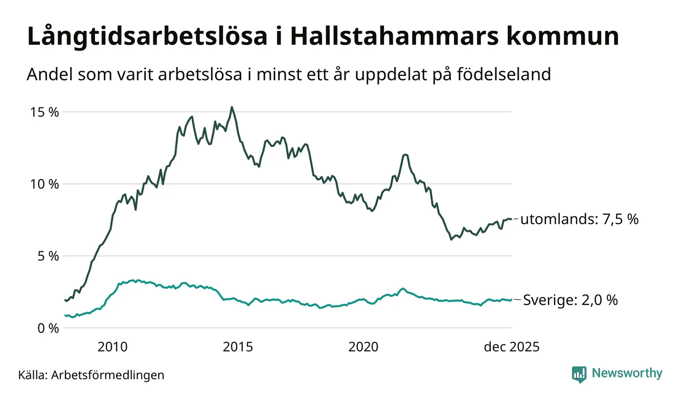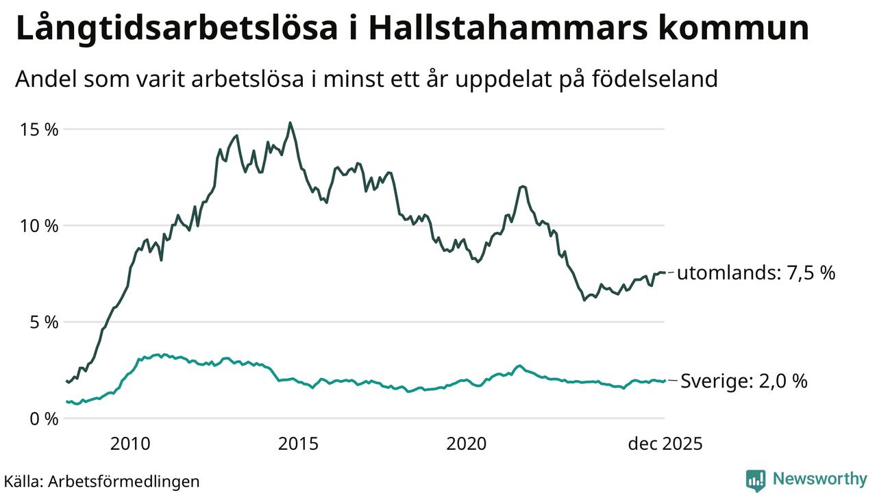 122 av de långtidsarbetslösa i Hallstahammar är födda i Sverige, medan 125 är födda utomlands. Det innebär att långtidsarbetslösheten bland Sverigefödda är 2,0 procent, medan den är fyra gånger så hög – 7,5 procent – bland födda utomlands. Även i riket som helhet är arbetslösheten högre bland utrikesfödda.