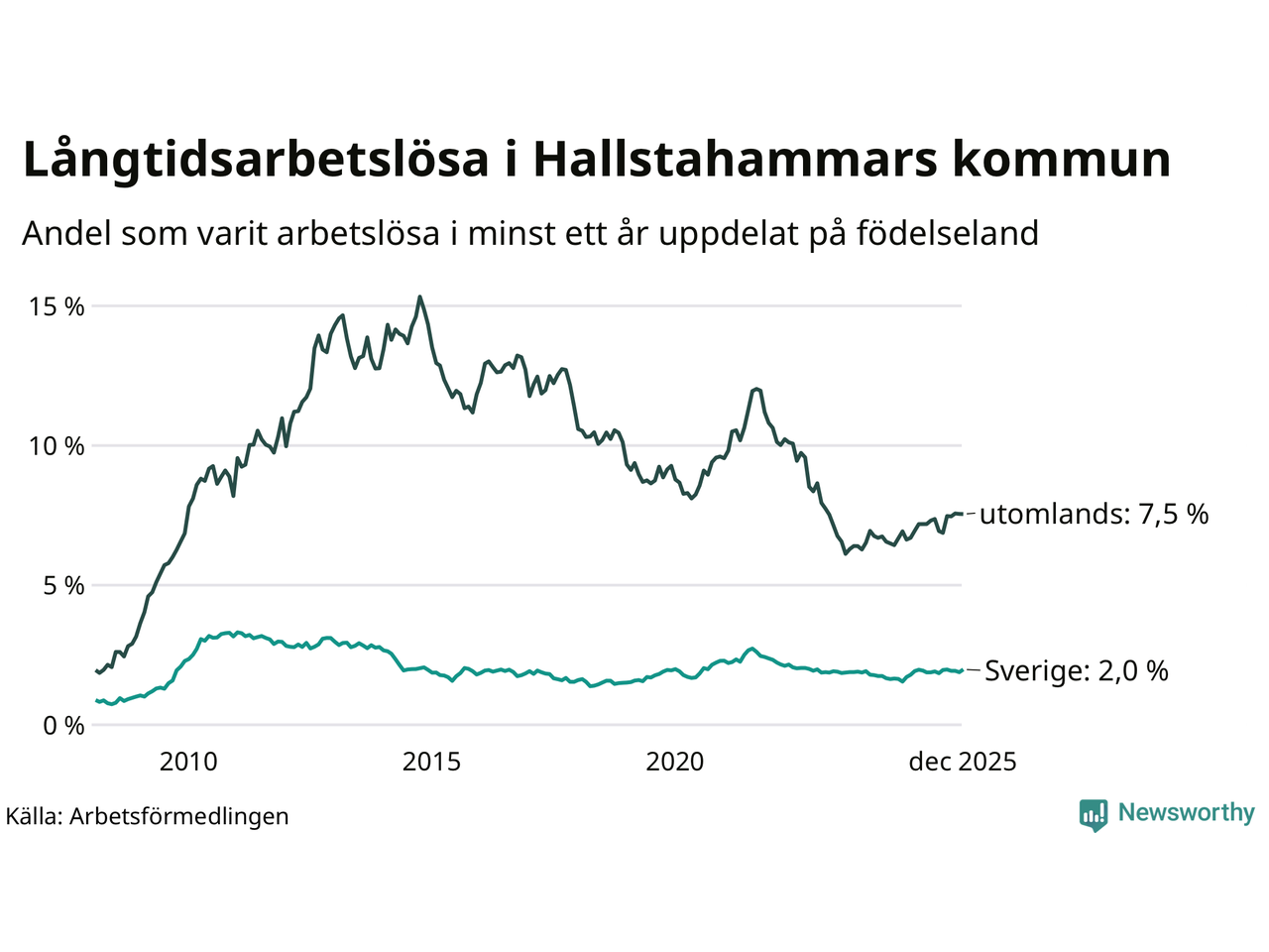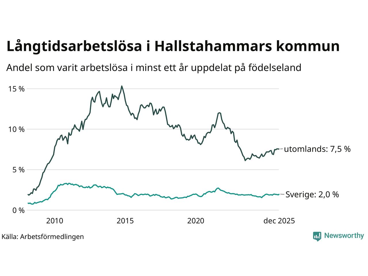 Graf: Andel arbetslösa uppdelat på födelseland i Hallstahammar