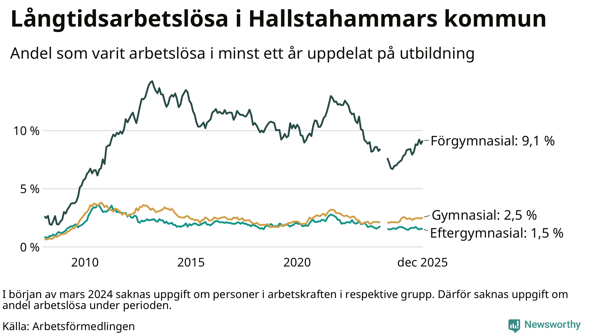 Graf över andel långtidsarbetslösa i Hallstahammar uppdelat på utbildningsnivå