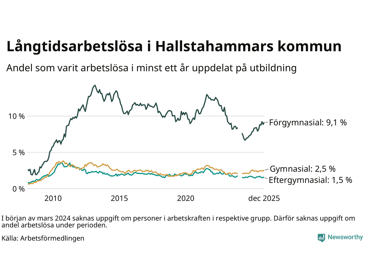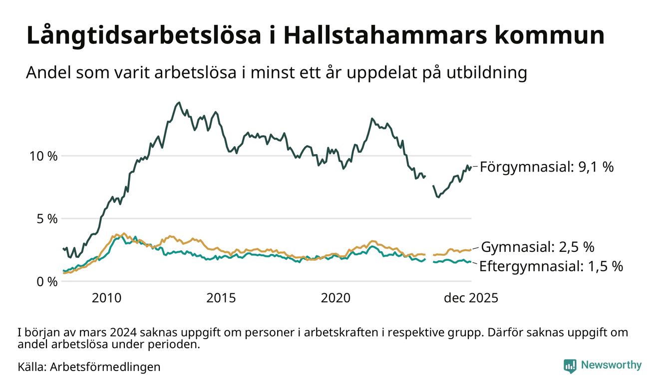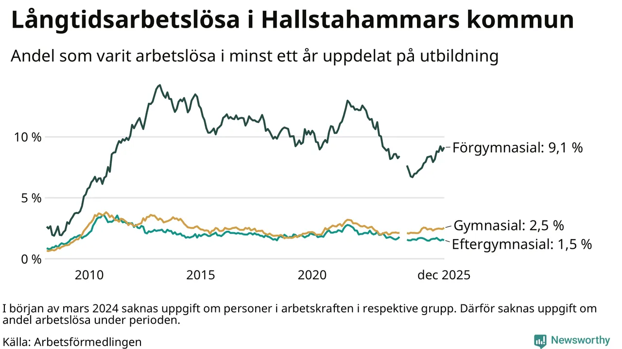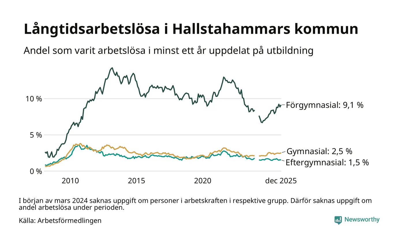 Inte sedan december 2022 har andelen långtidsarbetslösa varit så hög i Hallstahammar. Det visar Arbetsförmedlingens senaste månadsstatistik.