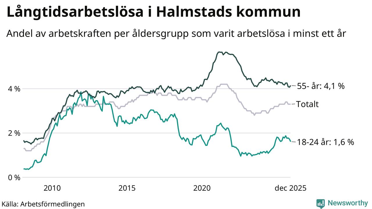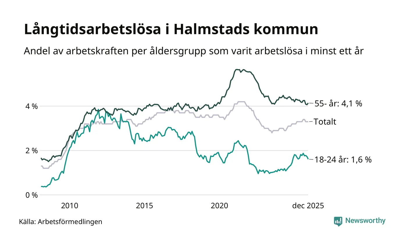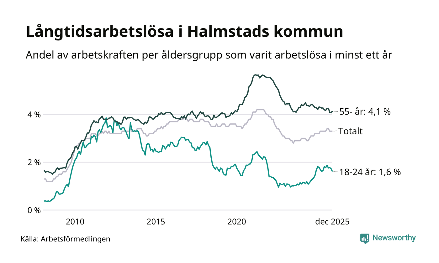 Av de 1 762 personerna som varit arbetslösa i mer än ett år i Halmstads kommun är 463 personer mellan 55 och 651 år och 100 är mellan 18 och 24 år. För den äldre gruppen är andelen arbetslösa 4,1 procent medan den i den yngre gruppen är 1,6 procent. Även i riket som helhet är långtidsarbetslösheten högre i gruppen äldre.
