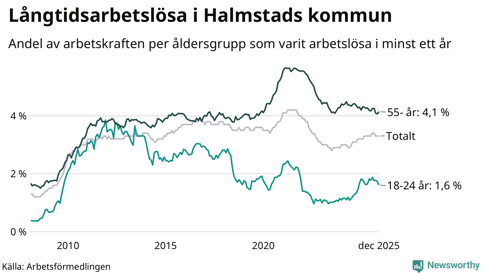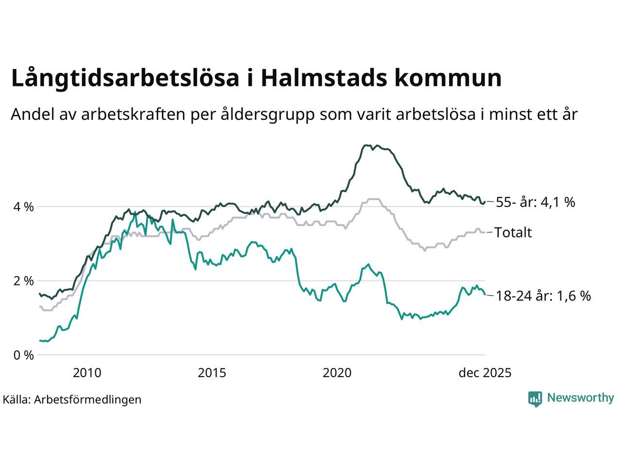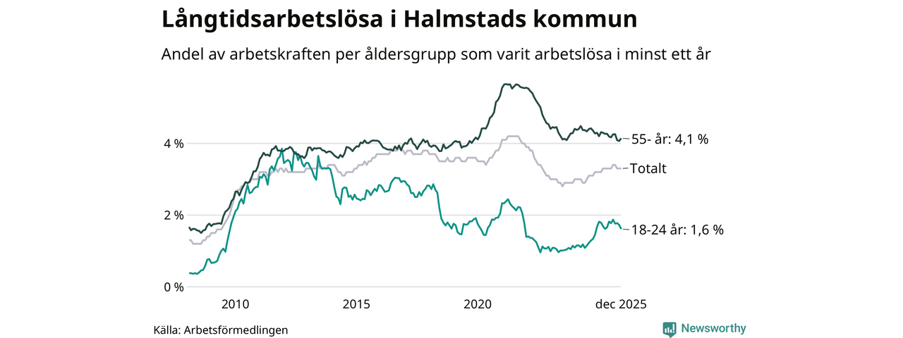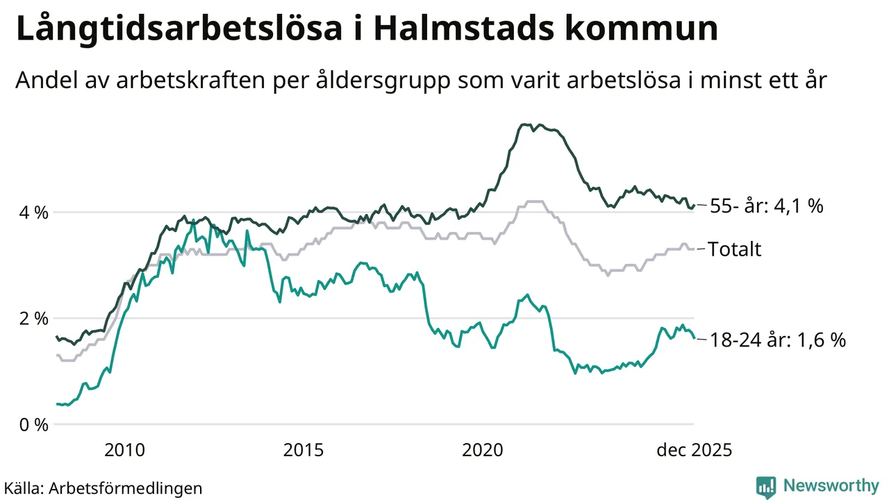 Av de 1 762 personerna som varit arbetslösa i mer än ett år i Halmstads kommun är 463 personer mellan 55 och 651 år och 100 är mellan 18 och 24 år. För den äldre gruppen är andelen arbetslösa 4,1 procent medan den i den yngre gruppen är 1,6 procent. Även i riket som helhet är långtidsarbetslösheten högre i gruppen äldre.