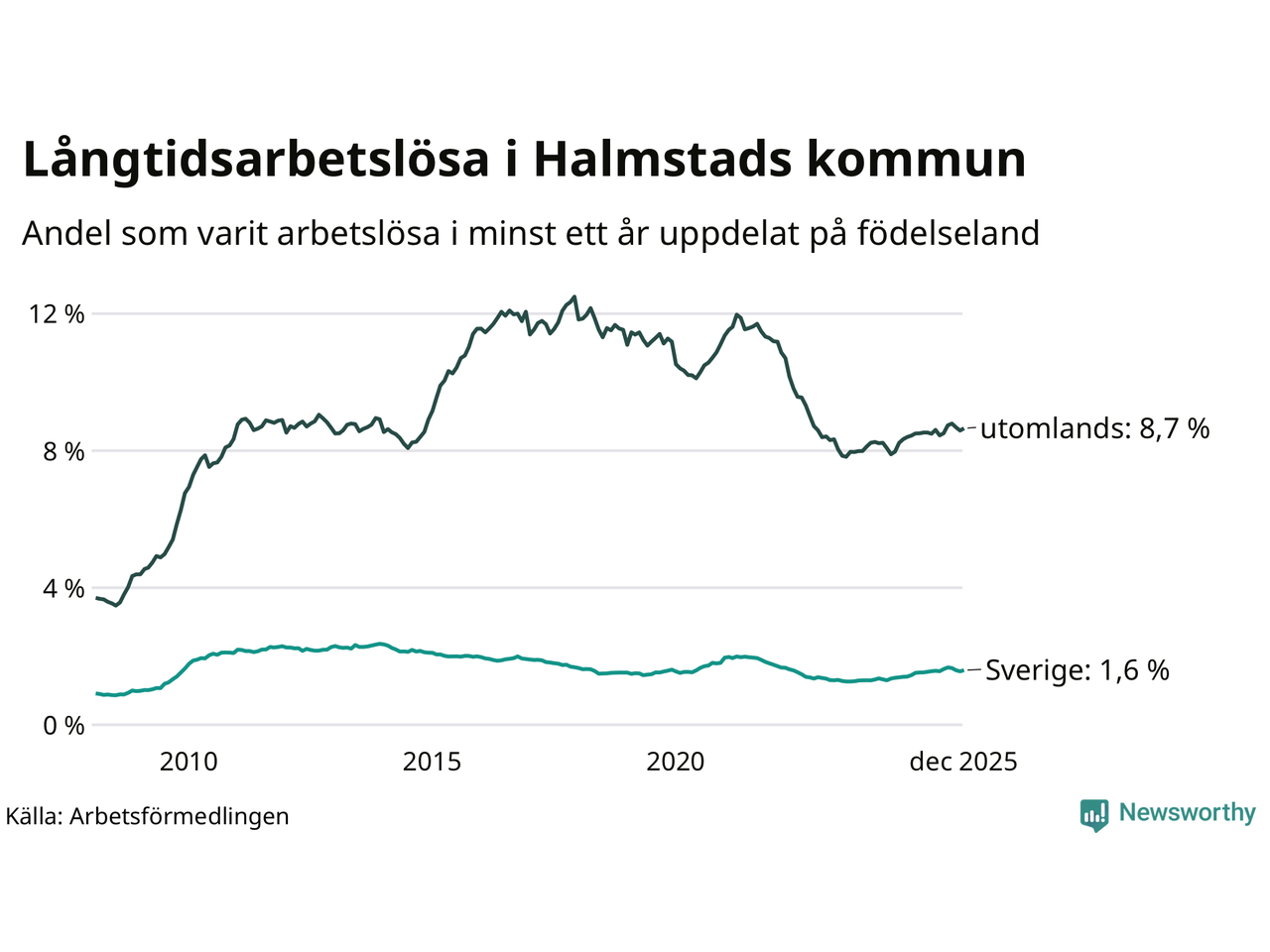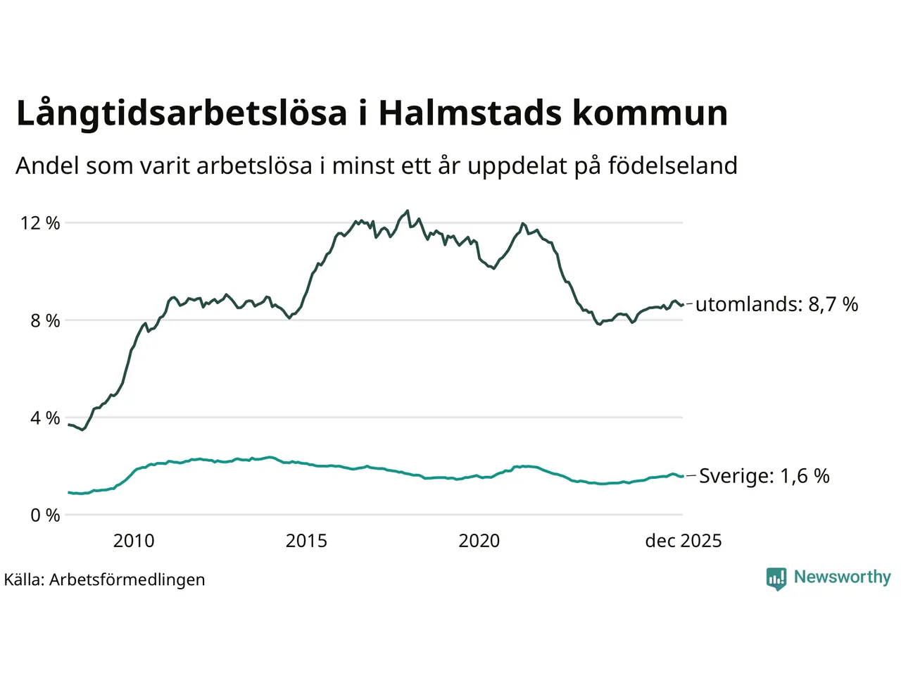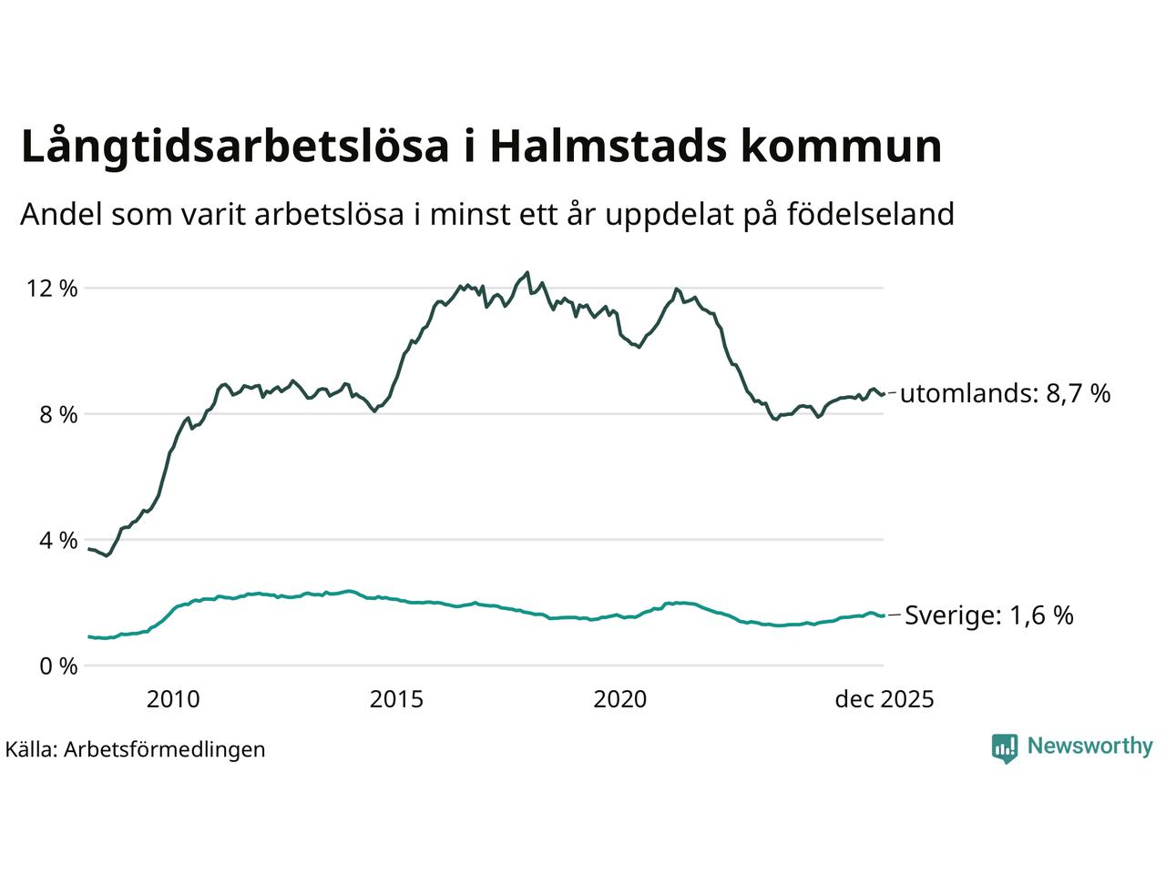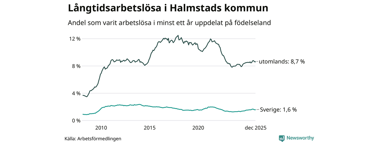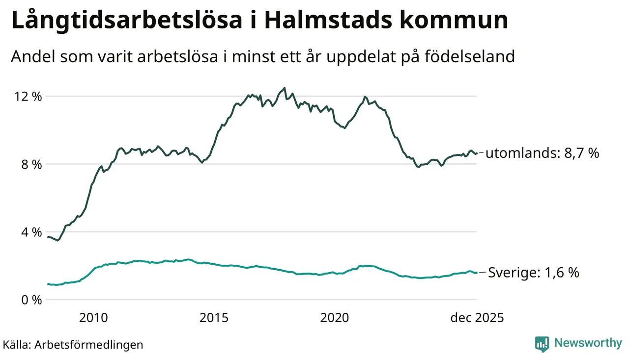 633 av de långtidsarbetslösa i Halmstad är födda i Sverige, medan 1 129 är födda utomlands. Det innebär att långtidsarbetslösheten bland Sverigefödda är 1,6 procent, medan den är fem gånger så hög – 8,7 procent – bland födda utomlands. Även i riket som helhet är arbetslösheten högre bland utrikesfödda.