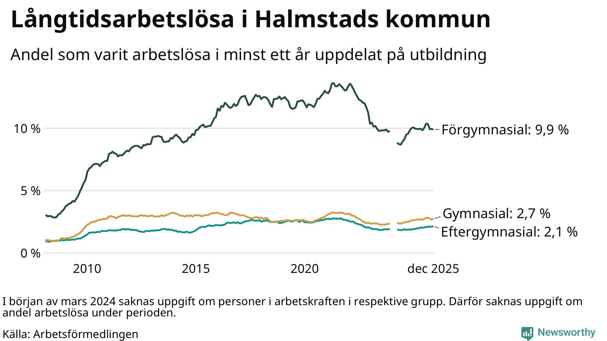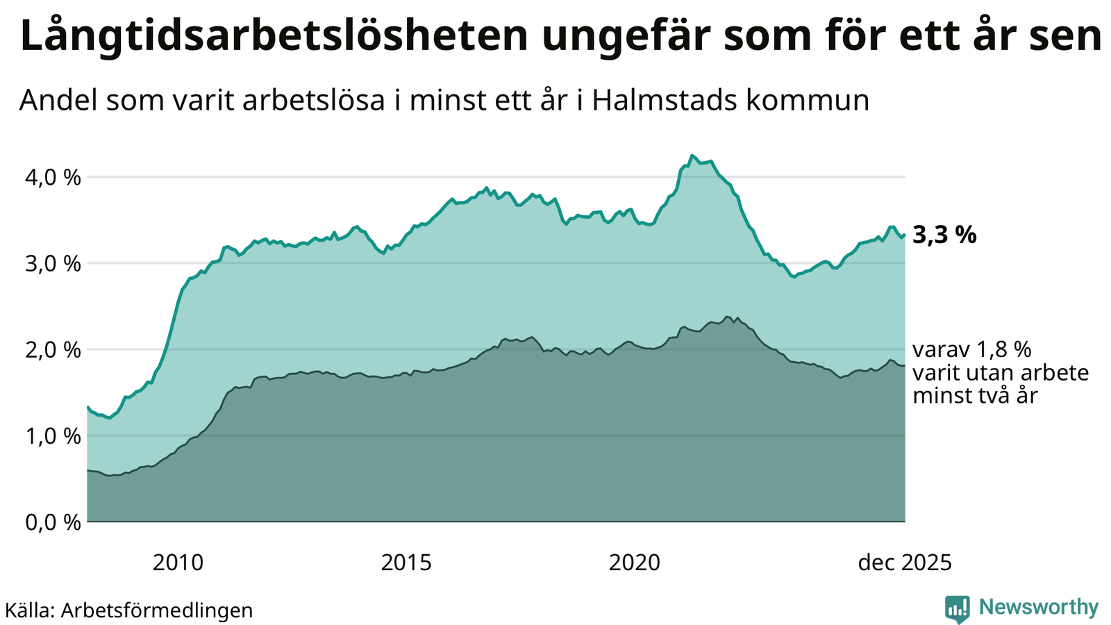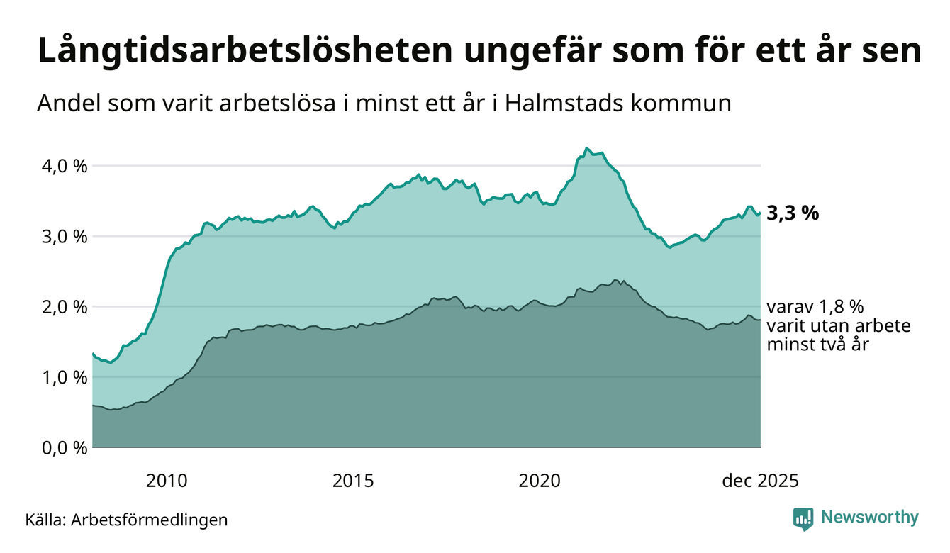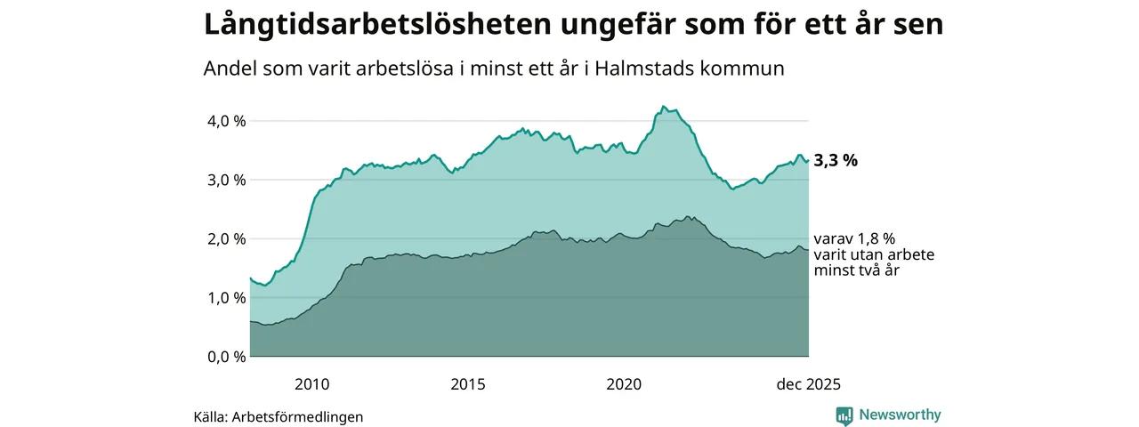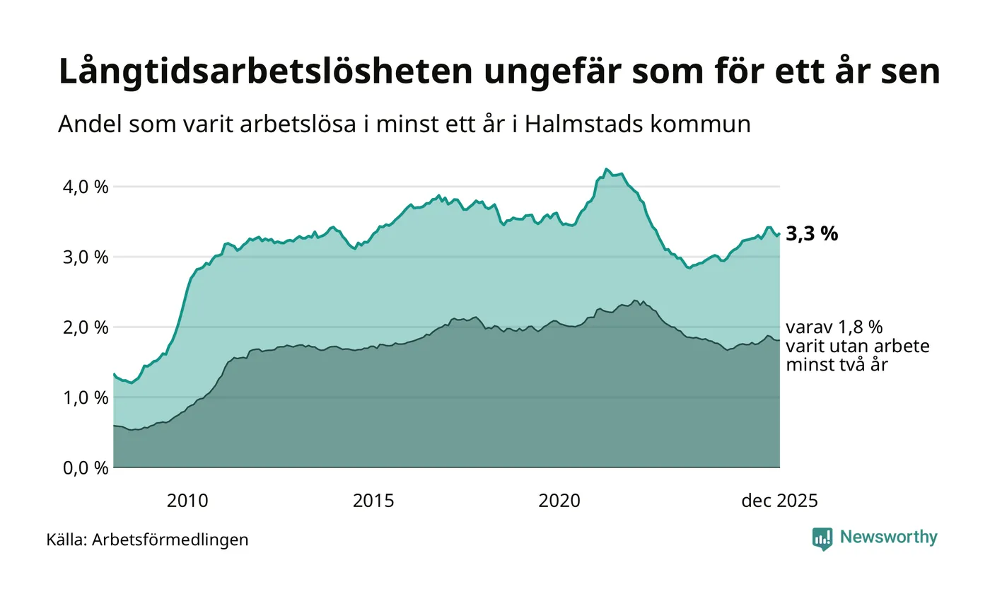 I december hade 1 762 Halmstadsbor varit arbetslösa i minst ett år, vilket är 22 fler än månaden innan. 1 762 personer motsvarar 3,3 procent av arbetskraften i kommunen – andelen långtidsarbetslösa är ungefär på samma nivå som för ett år sedan.