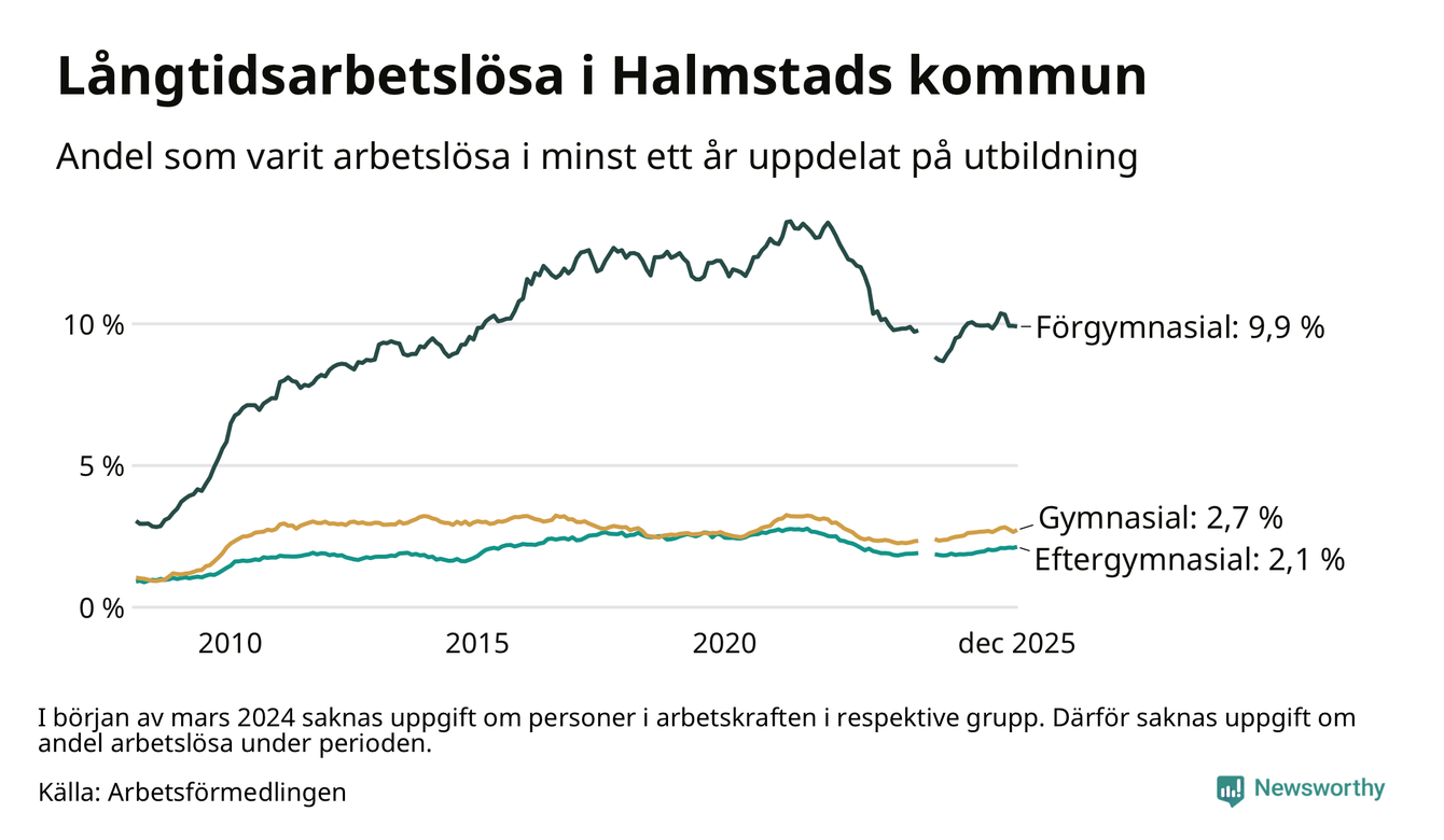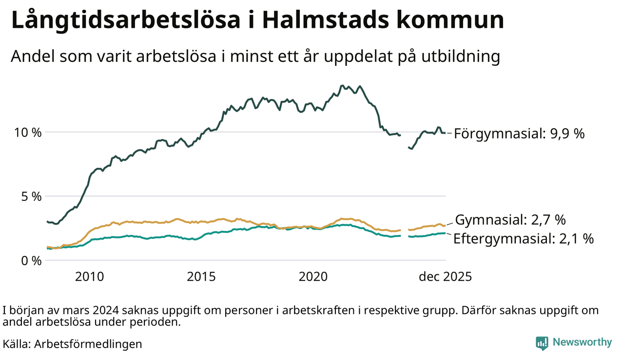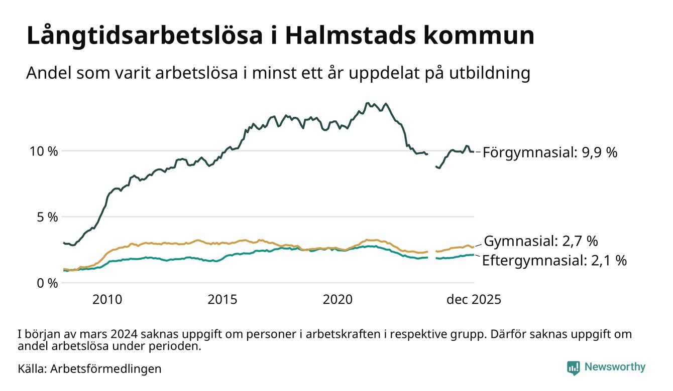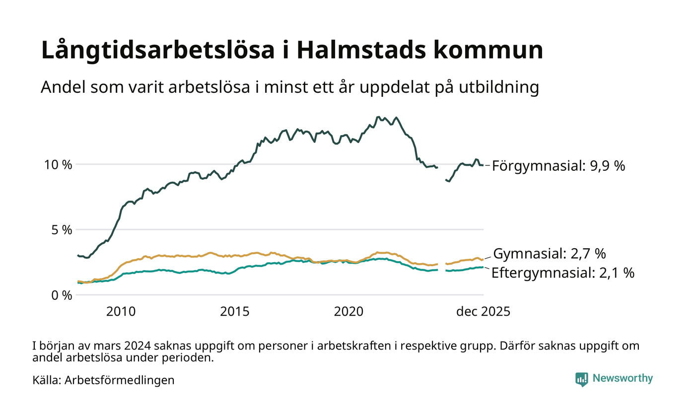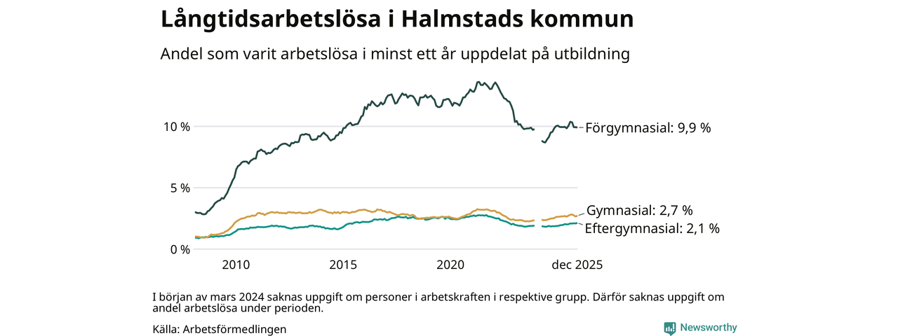 Andelen långtidsarbetslösa i Halmstad är den näst högsta i Hallands län, bara i Hylte är andelen högre 4,5 procent.I Kungsbacka finns länets lägsta långtidsarbetslöshet, 1,1 procent. I Halland som helhet hade 3 706 personer (2,2 procent) varit arbetslösa i minst ett år i december. Det är 19 personer fler än månaden innan.