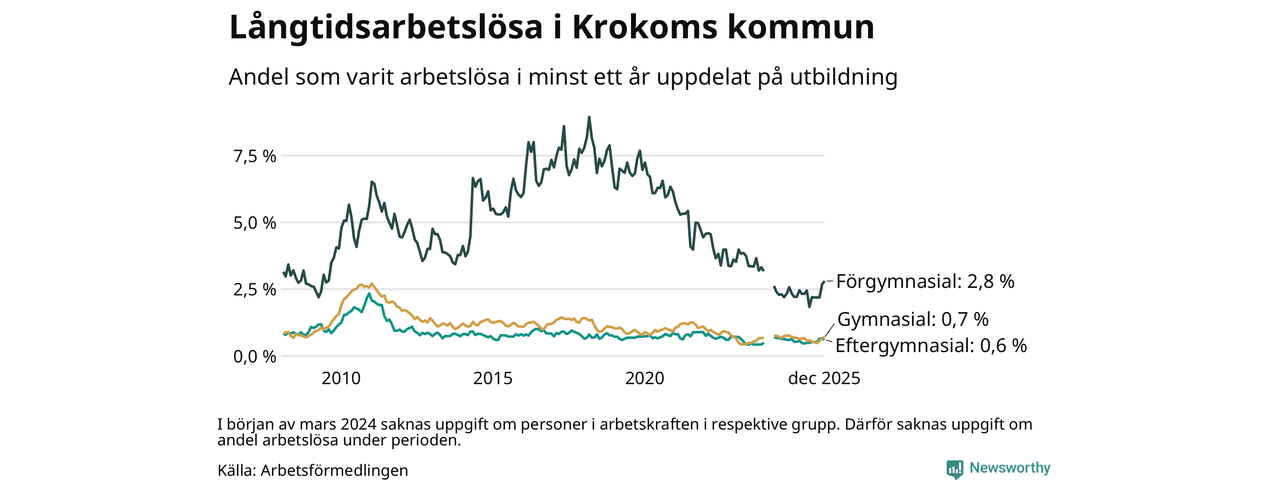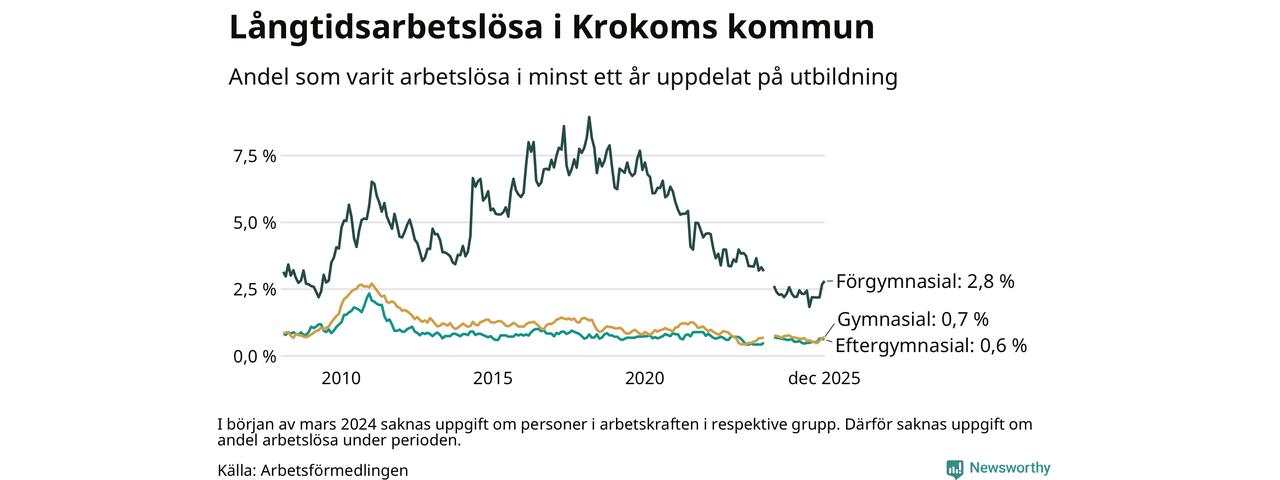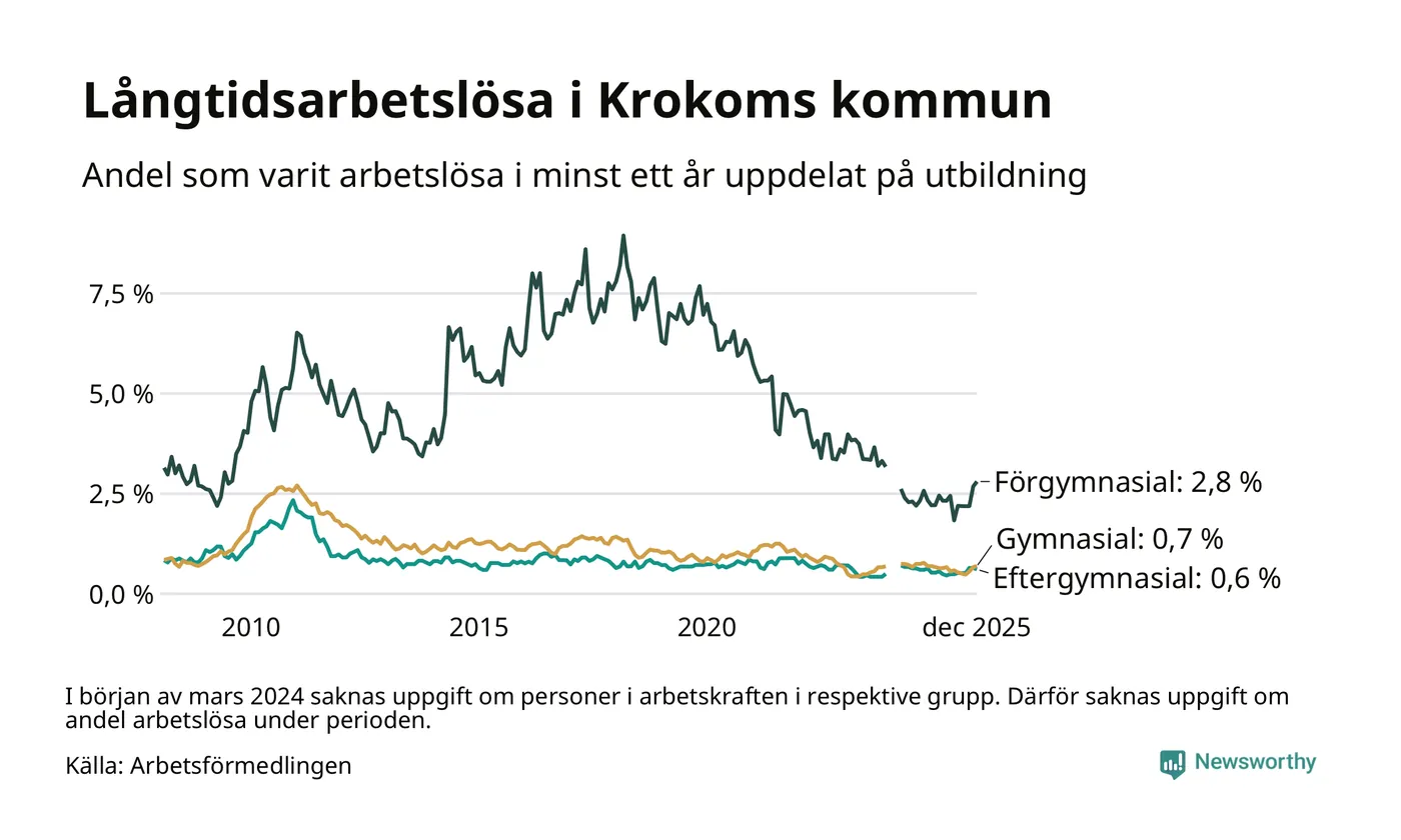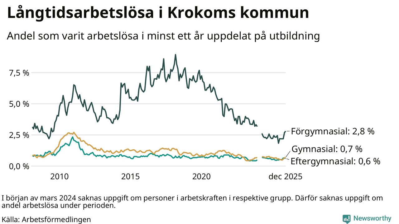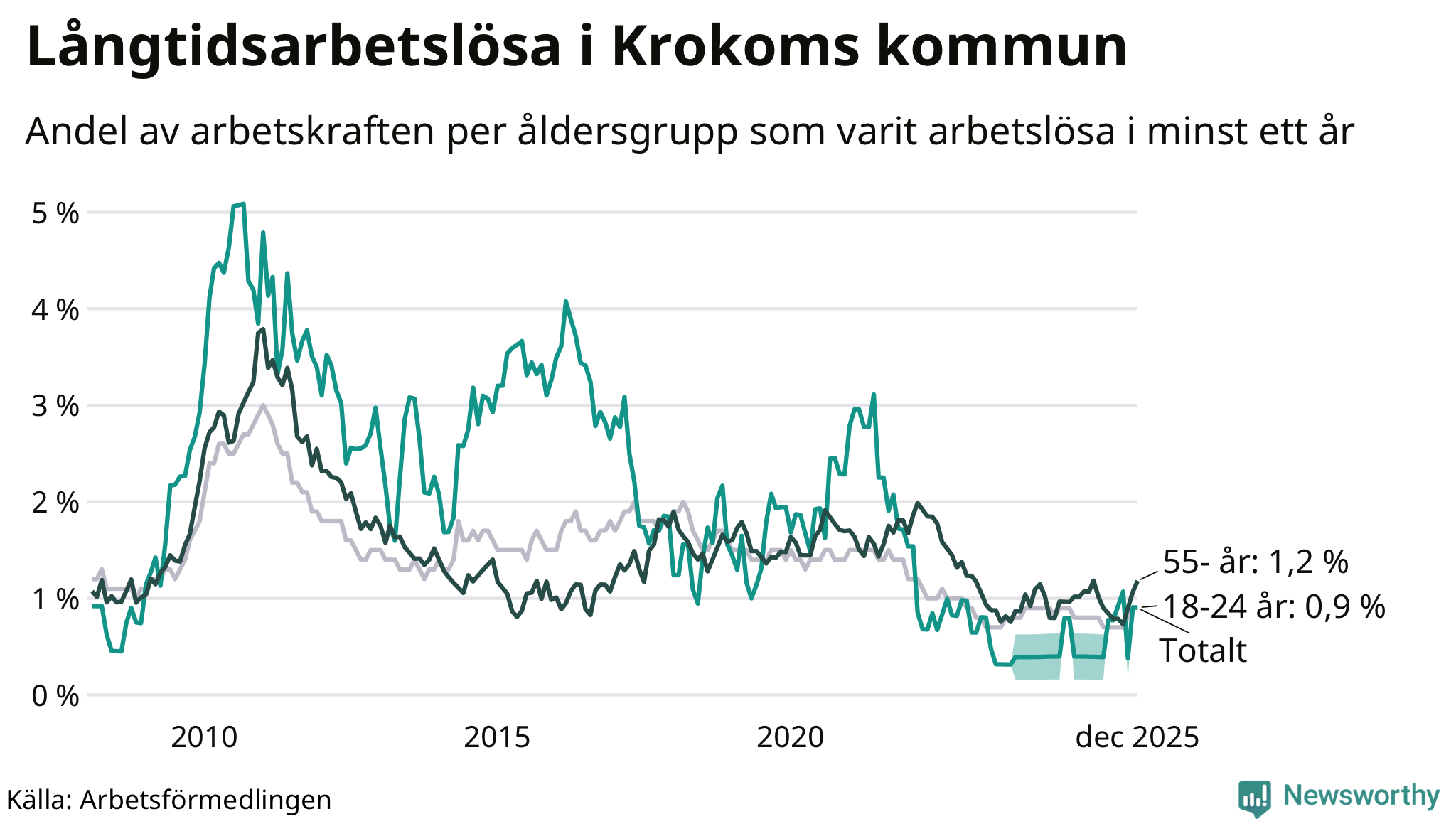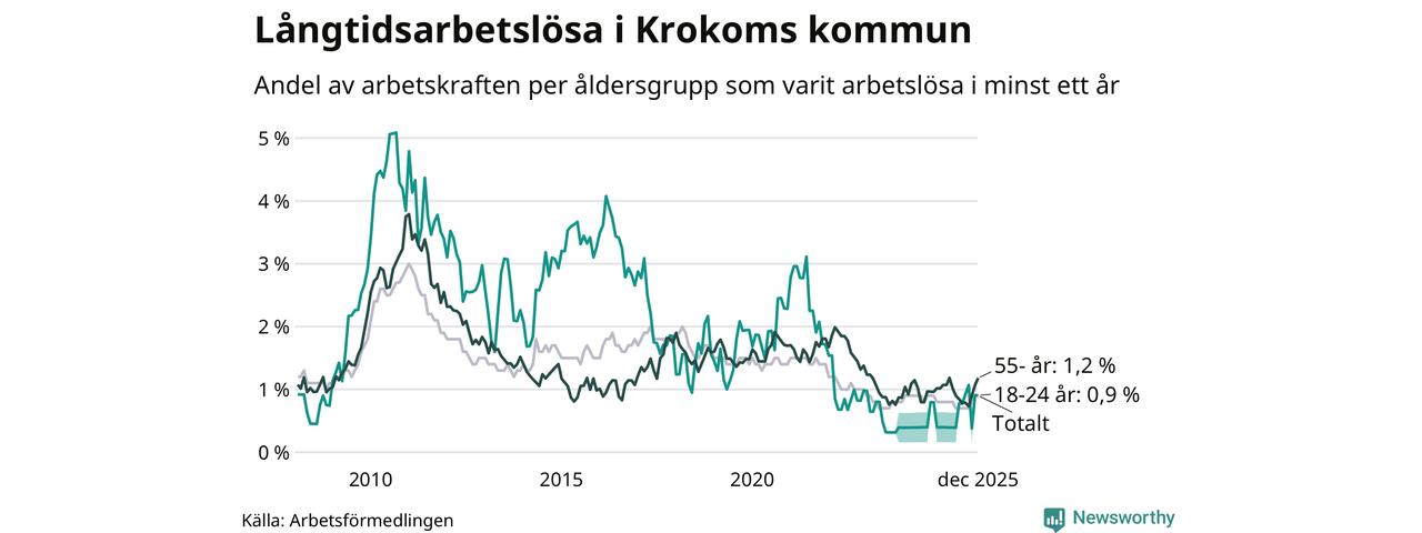 Av de 68 personerna som varit arbetslösa i mer än ett år i Krokoms kommun är 21 personer mellan 55 och 651 år och sex är mellan 18 och 24 år. För den äldre gruppen är andelen arbetslösa 1,2 procent medan den i den yngre gruppen är 0,9 procent. Även i riket som helhet är långtidsarbetslösheten högre i gruppen äldre.