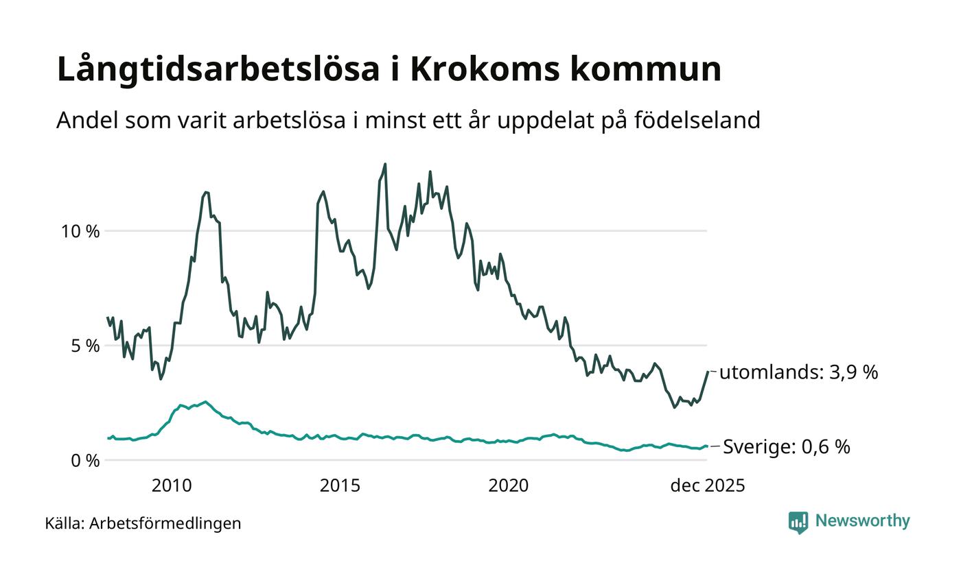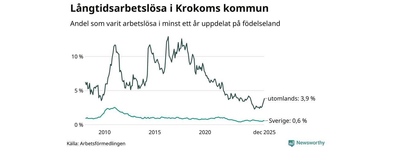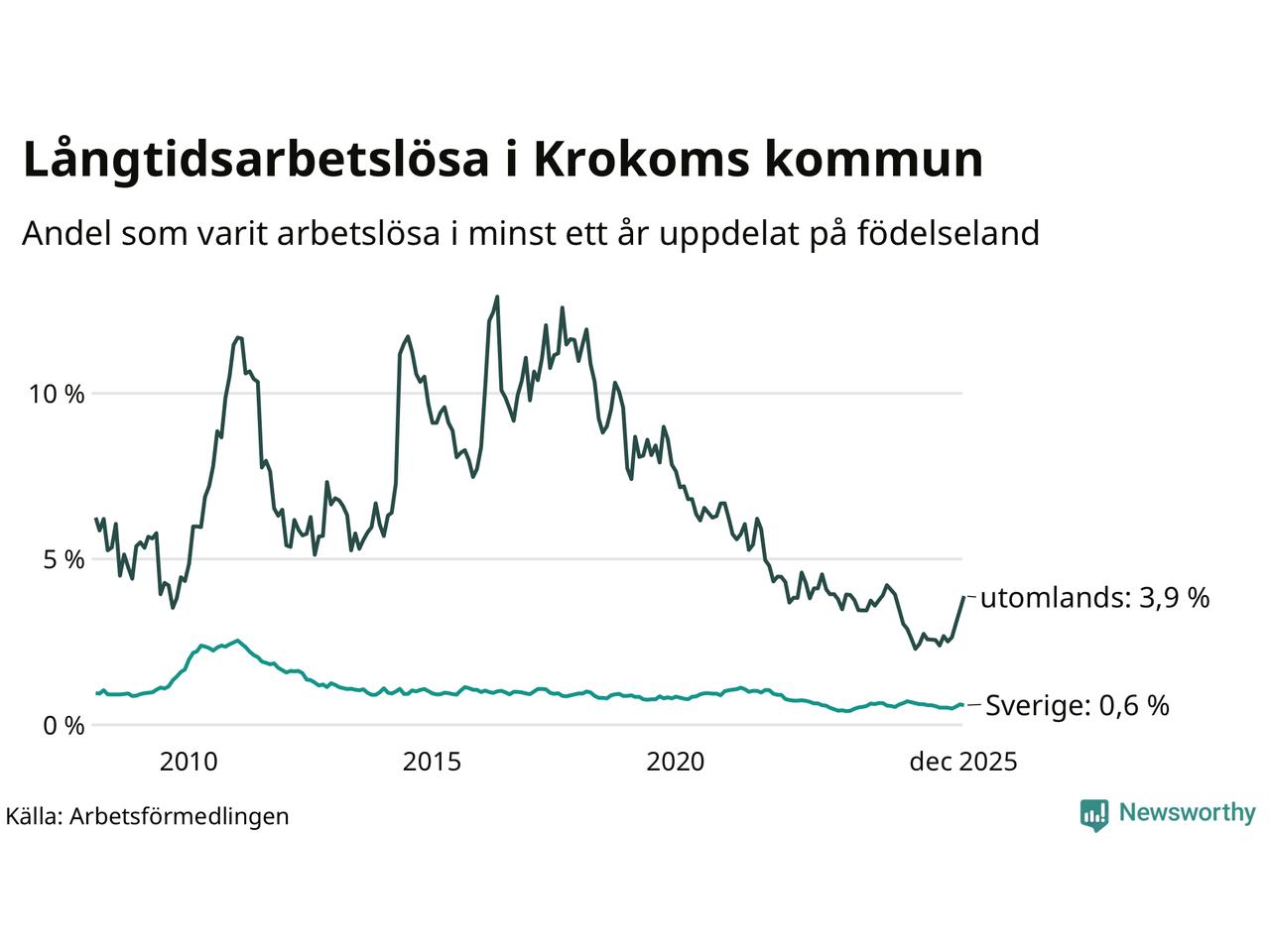 41 av de långtidsarbetslösa i Krokom är födda i Sverige, medan 27 är födda utomlands. Det innebär att långtidsarbetslösheten bland Sverigefödda är 0,6 procent, medan den är sju gånger så hög – 3,9 procent – bland födda utomlands. Även i riket som helhet är arbetslösheten högre bland utrikesfödda.