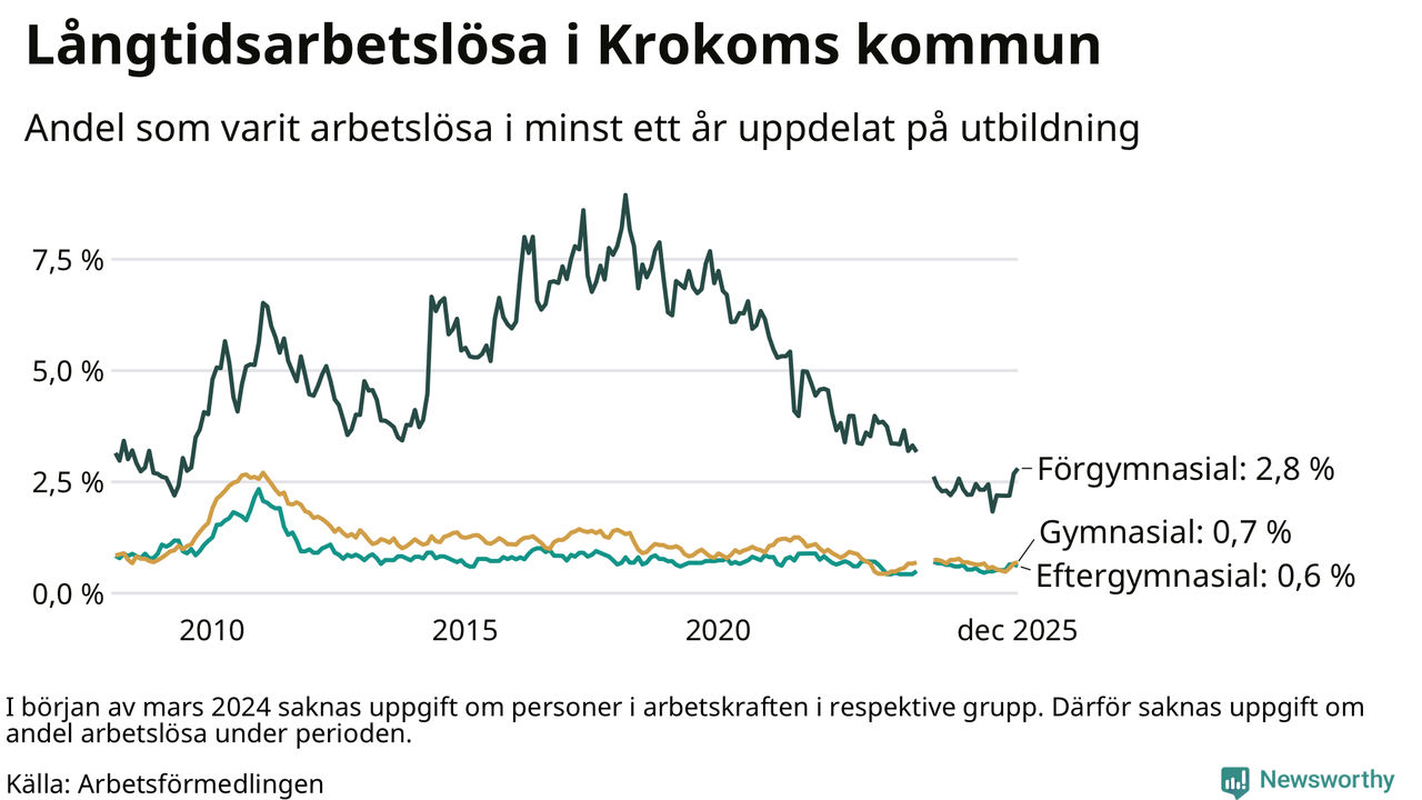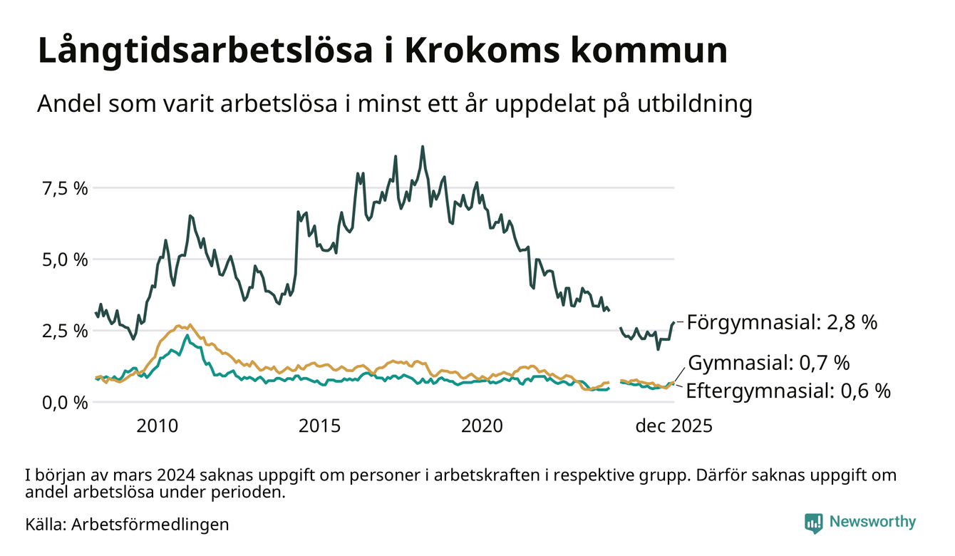 | Andel arbetslösa i minst två år | 0,4 % | 0,7 % | 1,5 % |