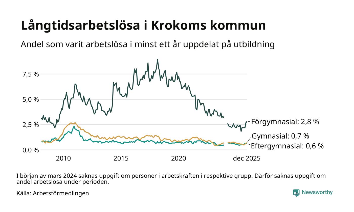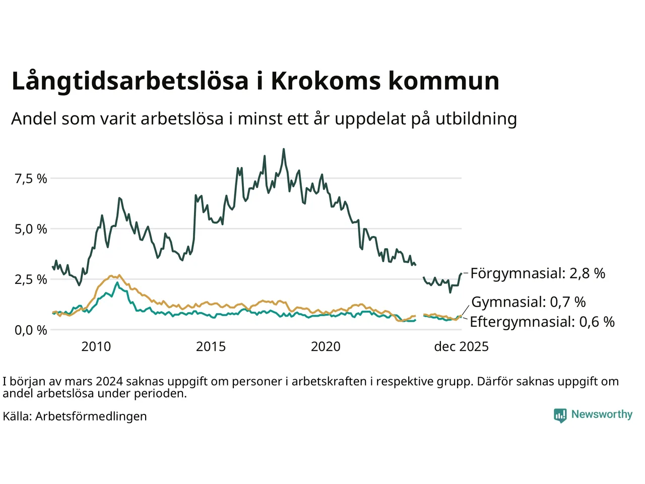 I december hade 68 Krokombor varit arbetslösa i minst ett år, vilket är en fler än månaden innan. 68 personer motsvarar 0,9 procent av arbetskraften i kommunen – andelen långtidsarbetslösa är ungefär på samma nivå som för ett år sedan. Krokom tillhör de kommuner som har lägst andel långtidsarbetslösa i hela landet just nu.