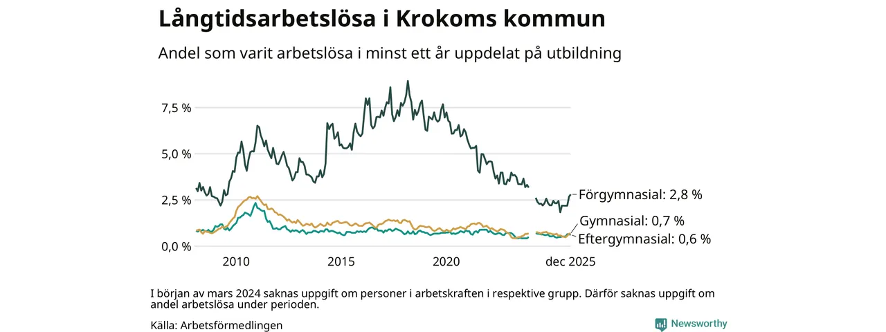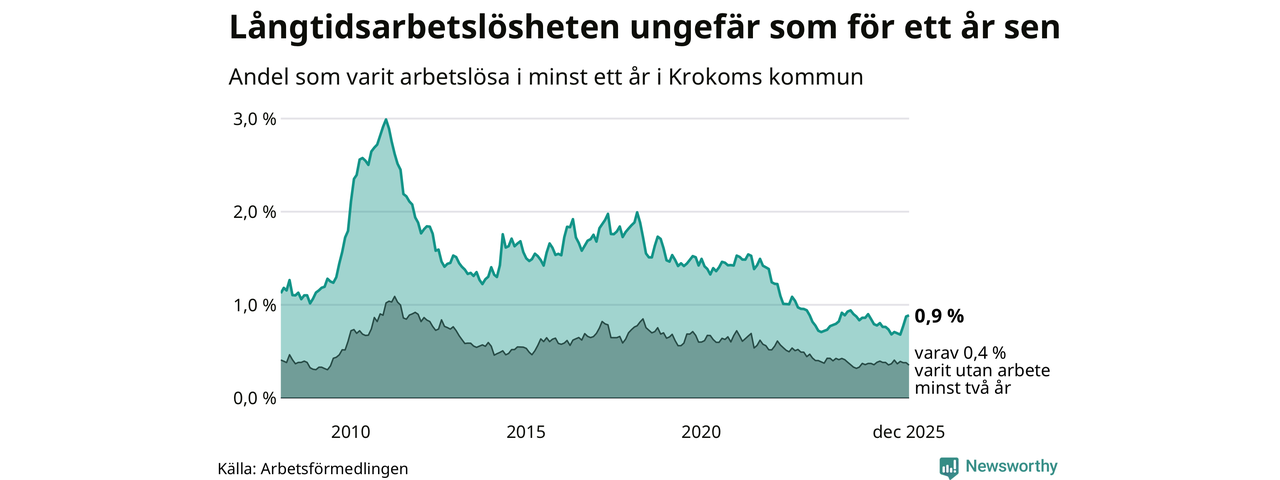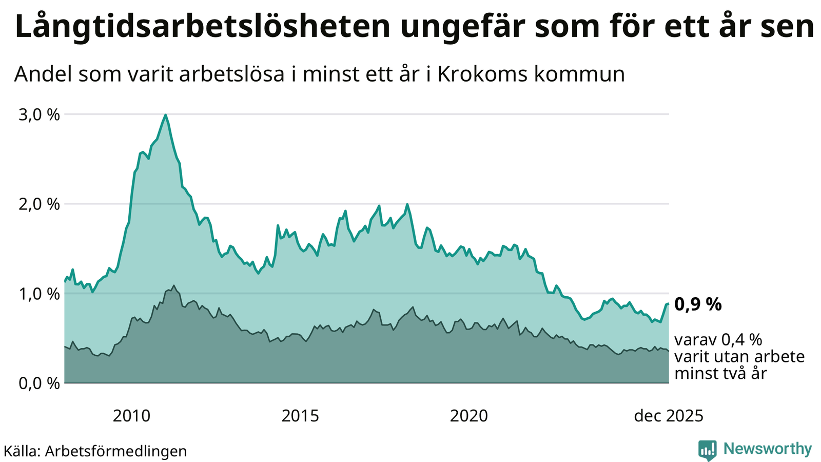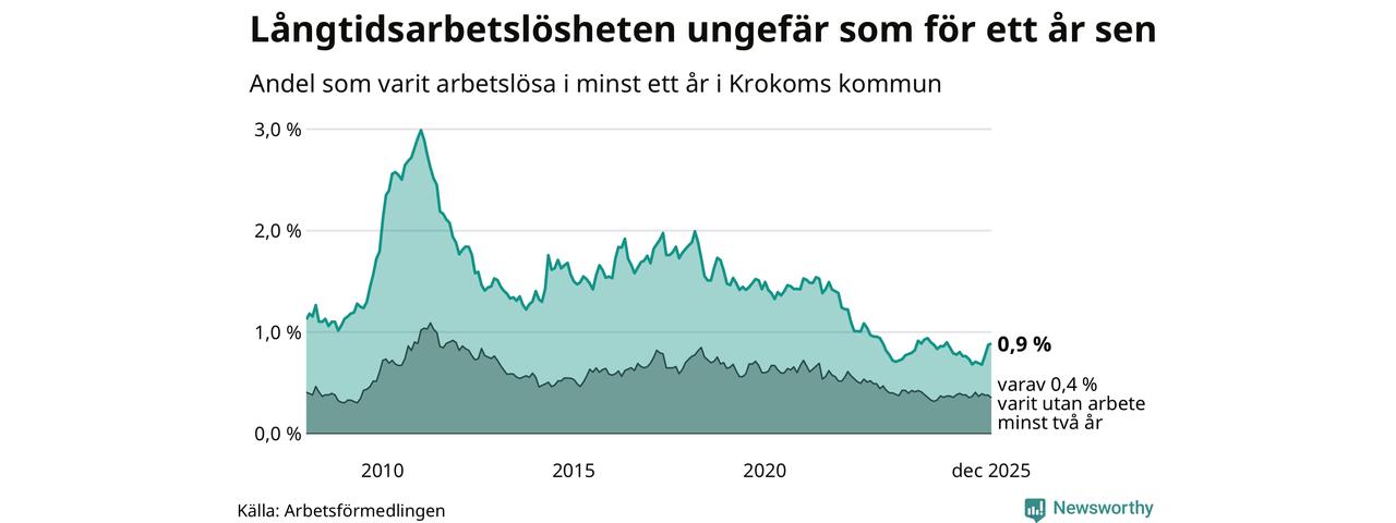 Andelen som varit utan arbete i minst ett år i Krokom var ungefär lika stor i december jämfört med samma månad för ett år sedan. Det visar Arbetsfömedlingens senaste månadsstatistik.