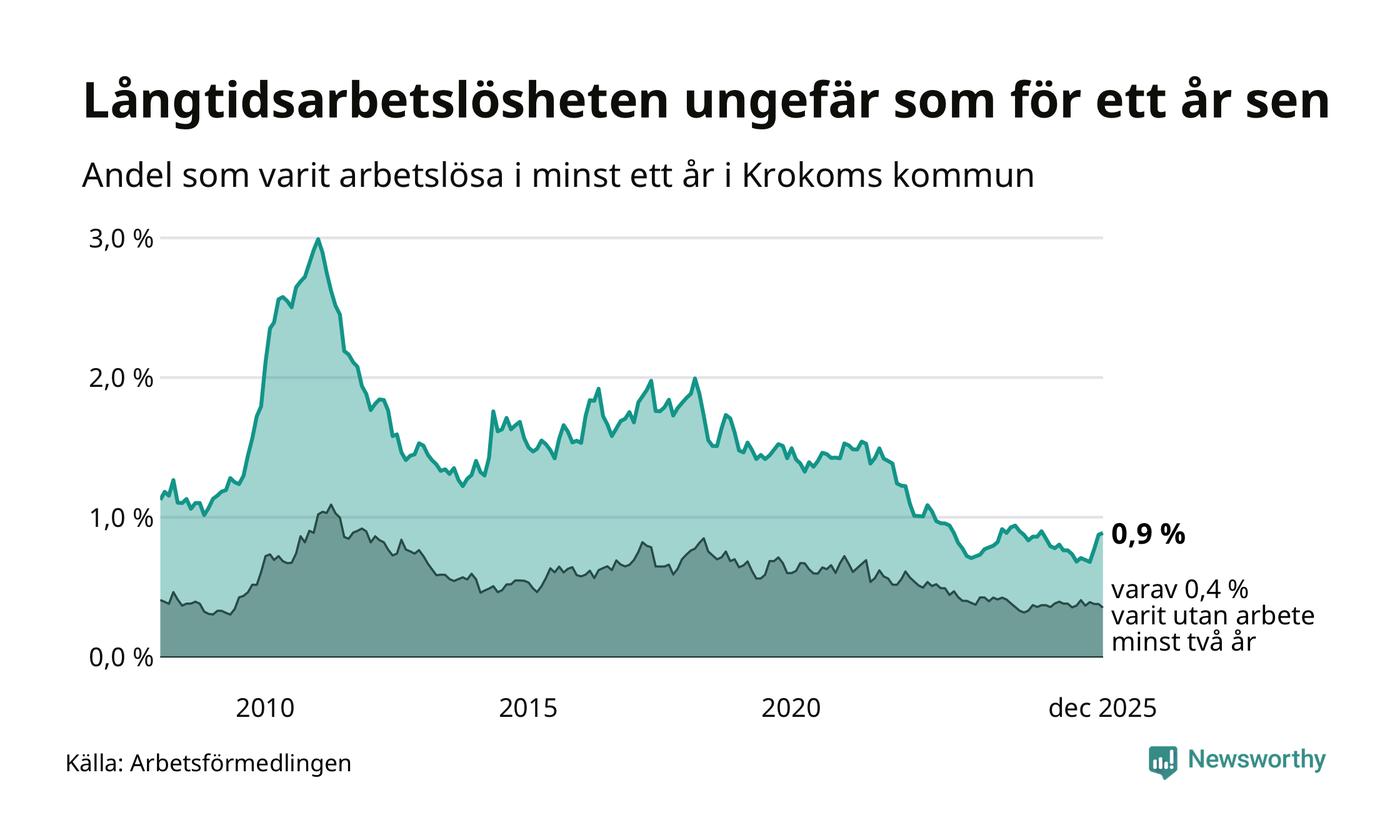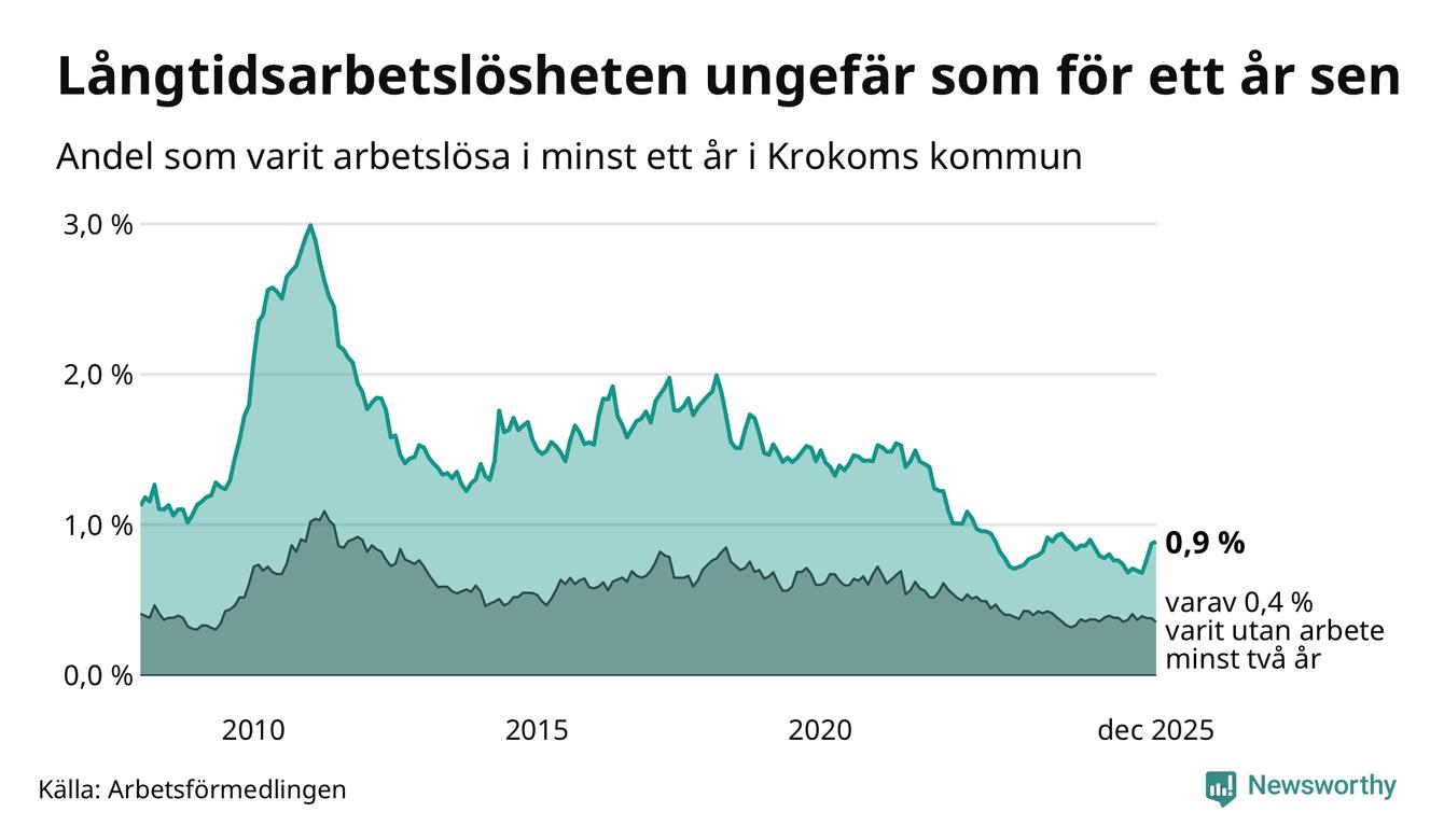 Andelen långtidsarbetslösa i Krokom är den lägsta i Jämtlands län. I Strömsund och Ragunda finns länets högsta långtidsarbetslöshet, 1,9 procent. I Jämtland som helhet hade 918 personer (1,4 procent) varit arbetslösa i minst ett år i december. Det är fem personer färre än månaden innan.