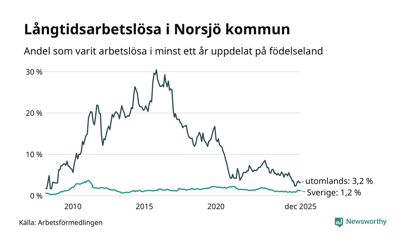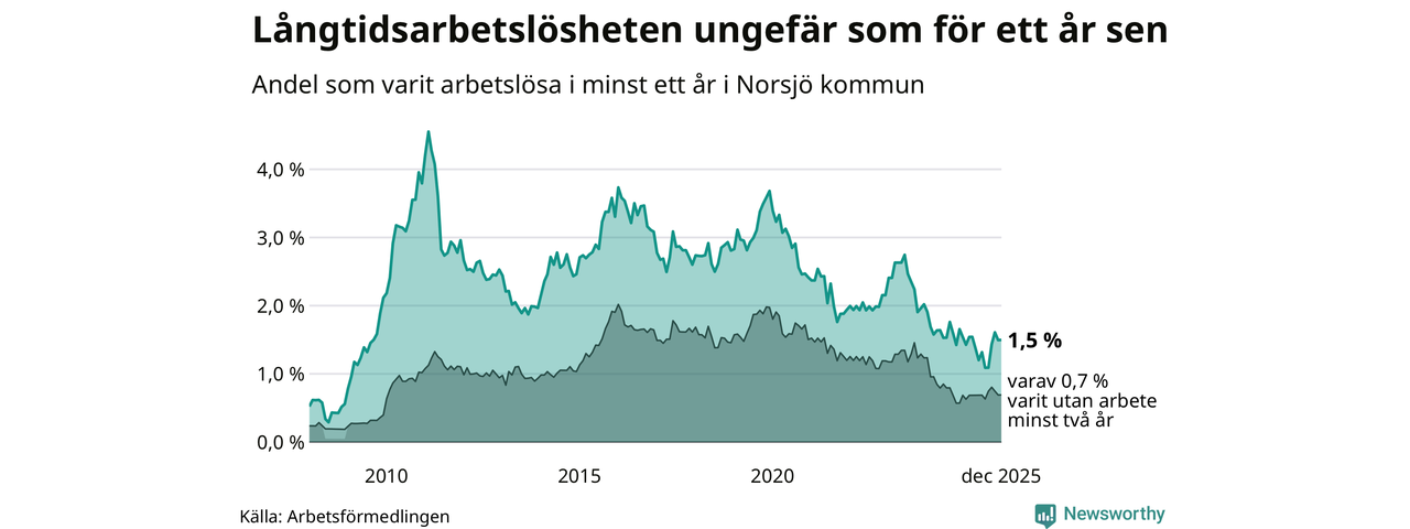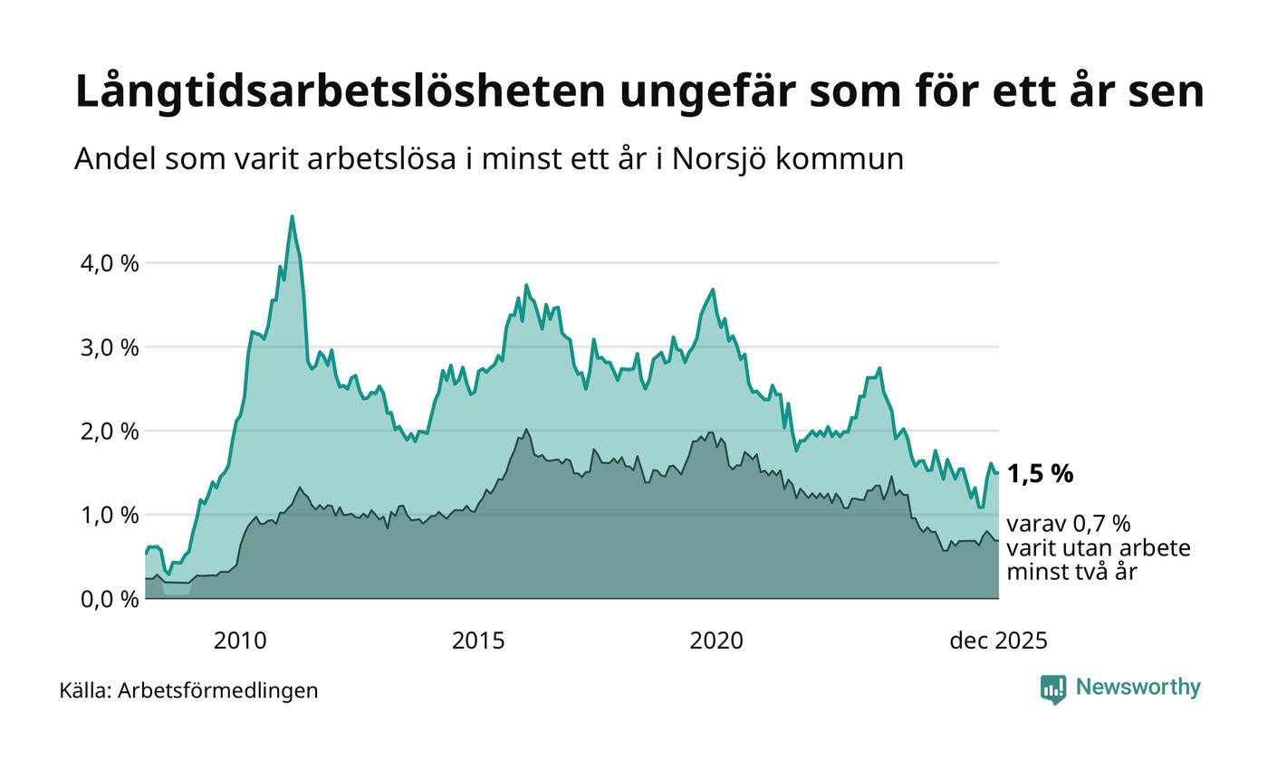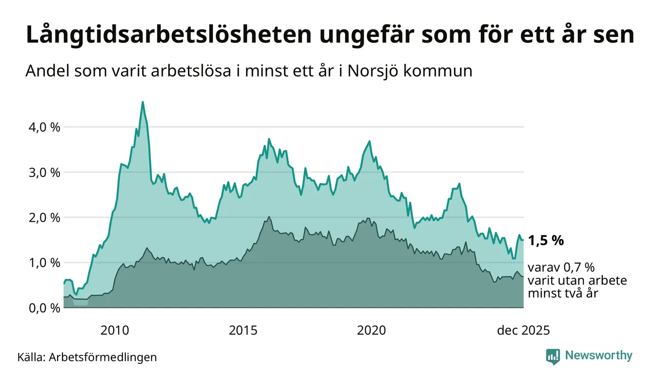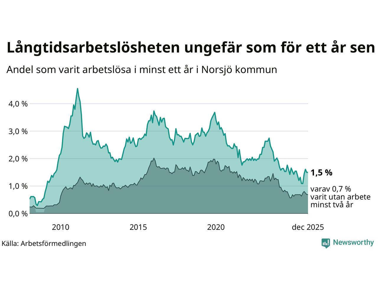 I december hade 26 Norsjöbor varit arbetslösa i minst ett år, vilket är lika många som månaden innan. 26 personer motsvarar 1,5 procent av arbetskraften i kommunen – andelen långtidsarbetslösa är ungefär på samma nivå som för ett år sedan.