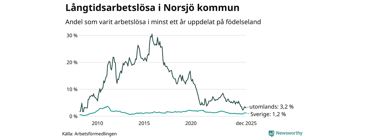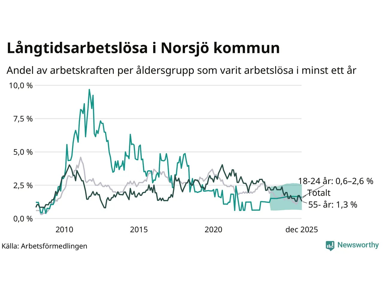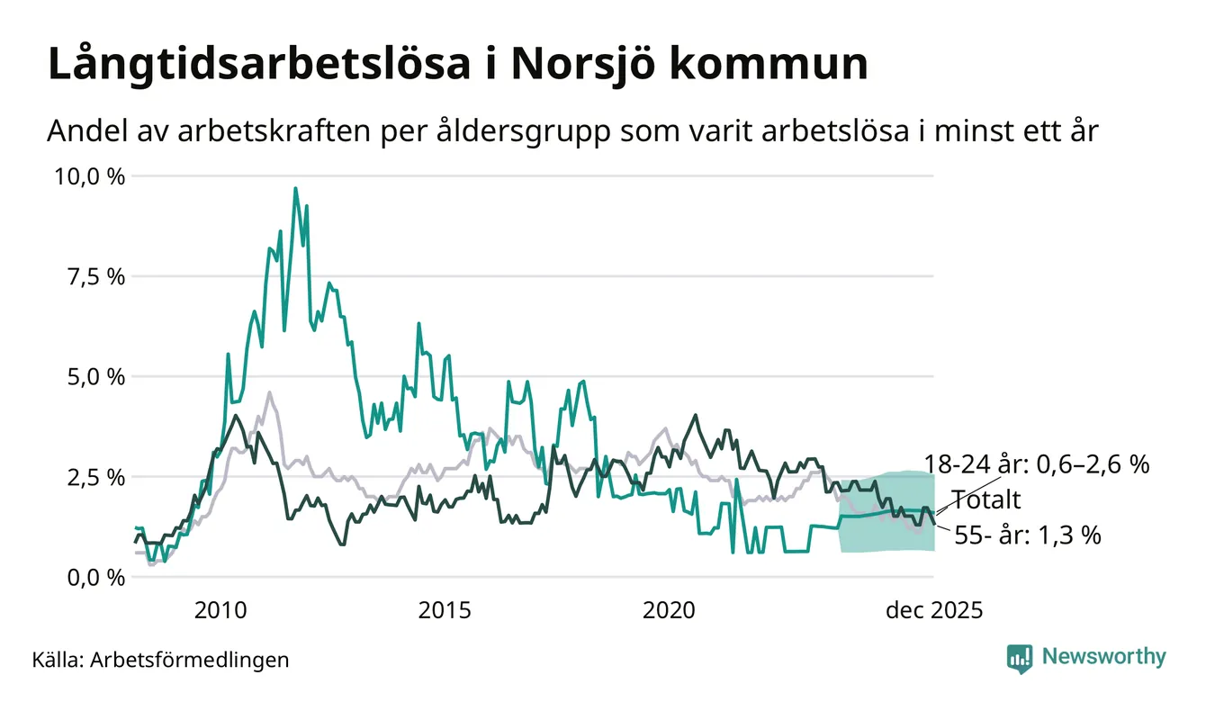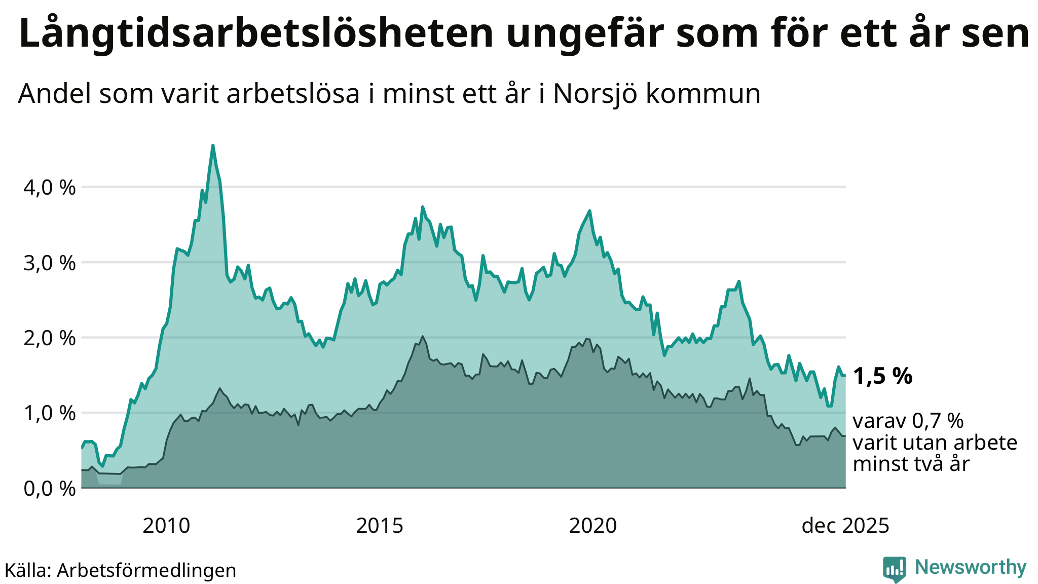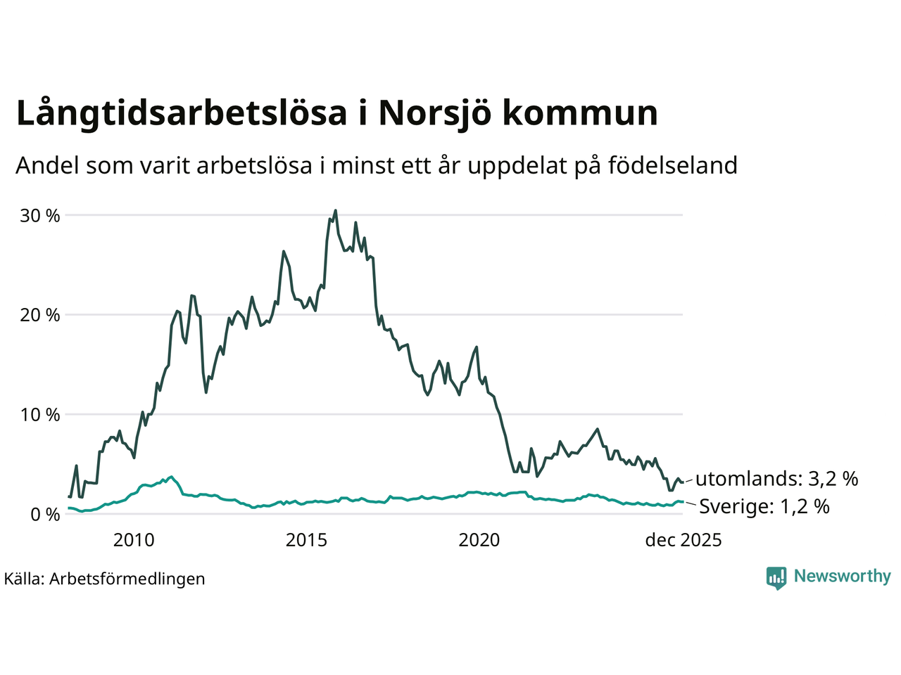 I december hade 26 Norsjöbor varit arbetslösa i minst ett år, vilket är lika många som månaden innan. 26 personer motsvarar 1,5 procent av arbetskraften i kommunen – andelen långtidsarbetslösa är ungefär på samma nivå som för ett år sedan.