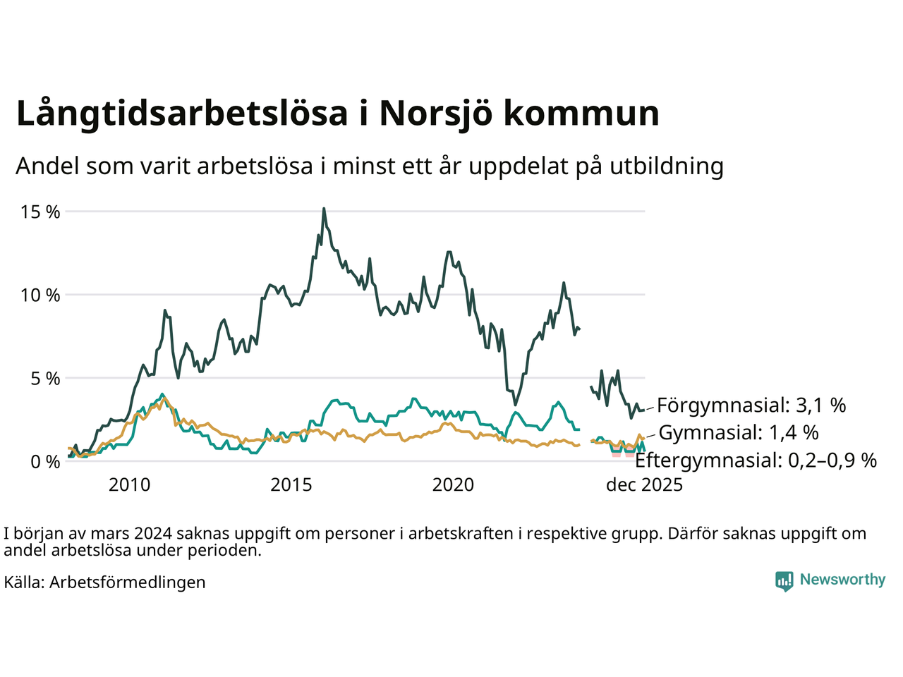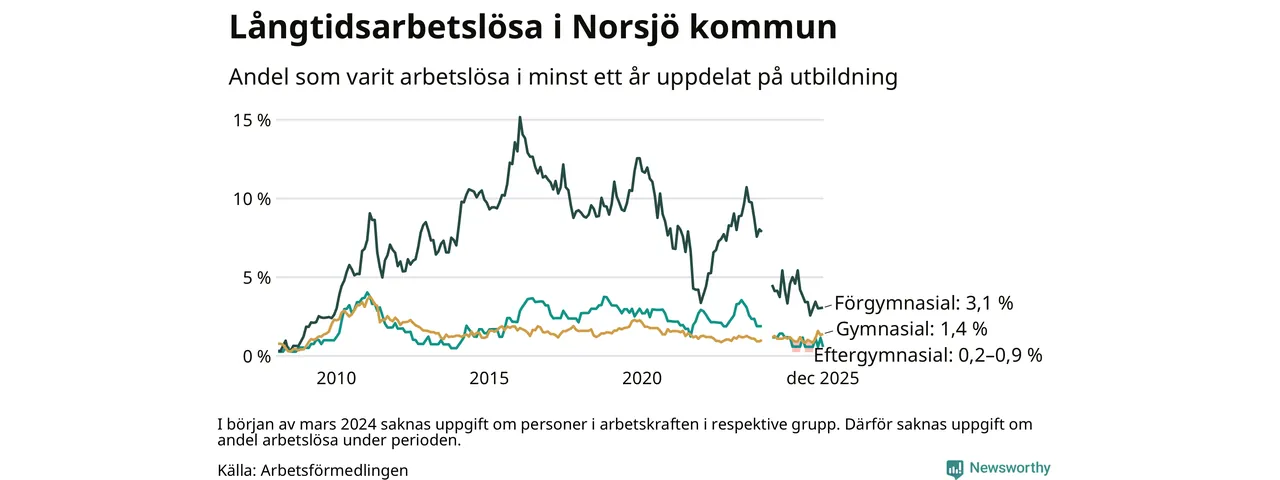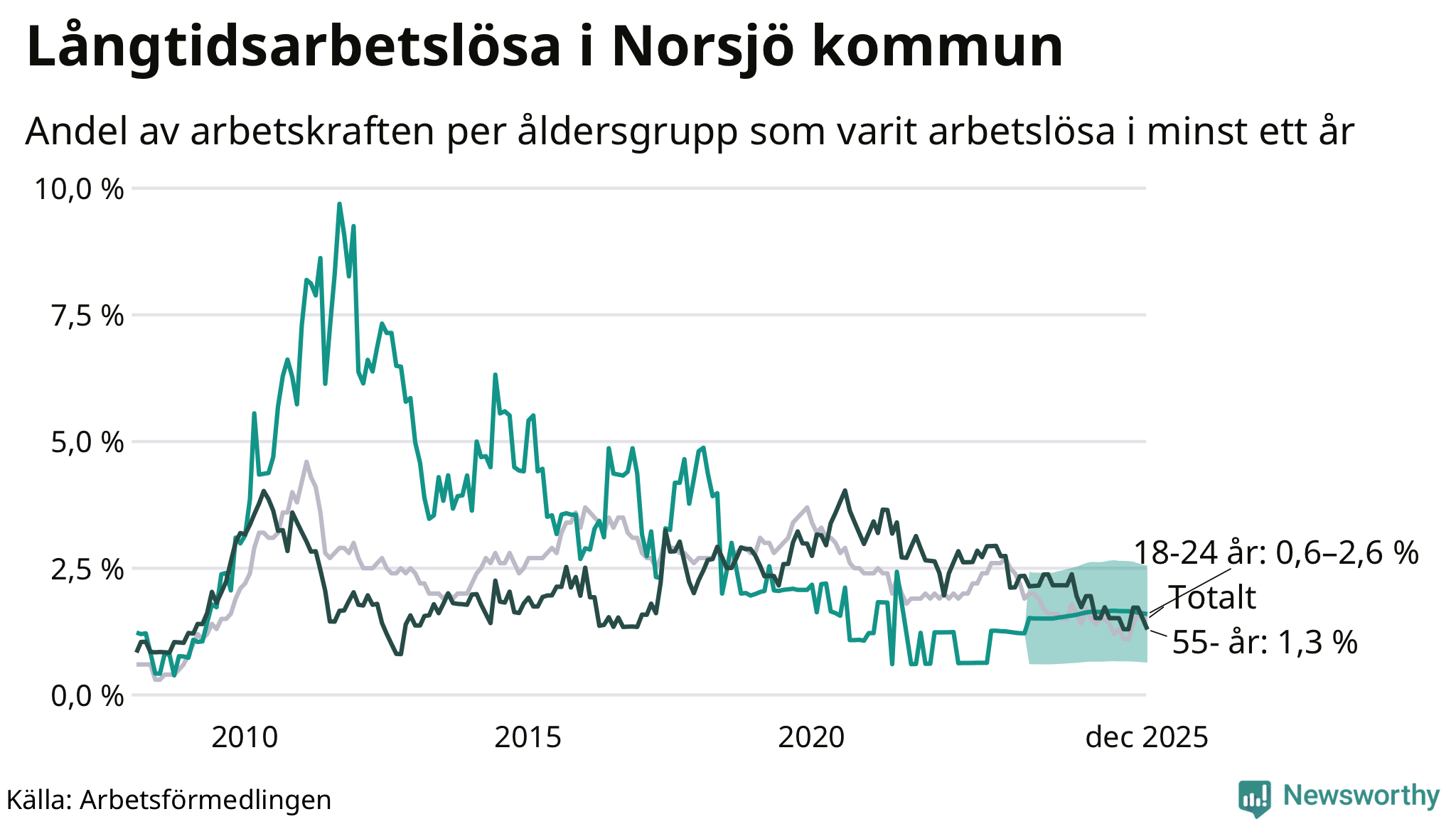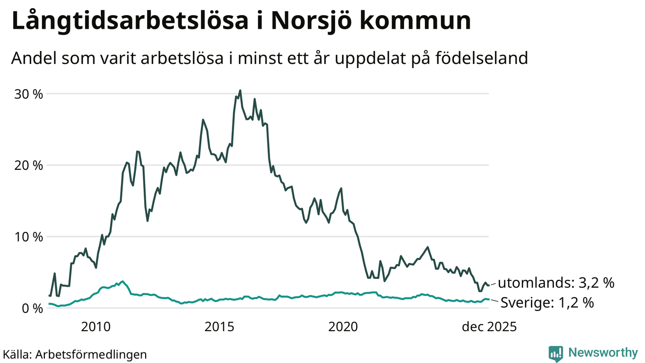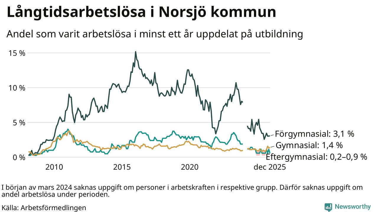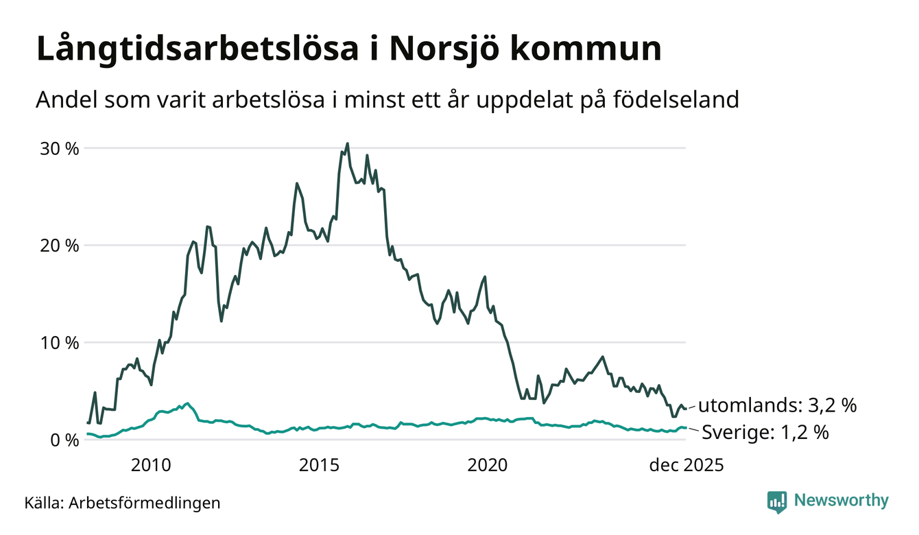 I december hade 26 Norsjöbor varit arbetslösa i minst ett år, vilket är lika många som månaden innan. 26 personer motsvarar 1,5 procent av arbetskraften i kommunen – andelen långtidsarbetslösa är ungefär på samma nivå som för ett år sedan.