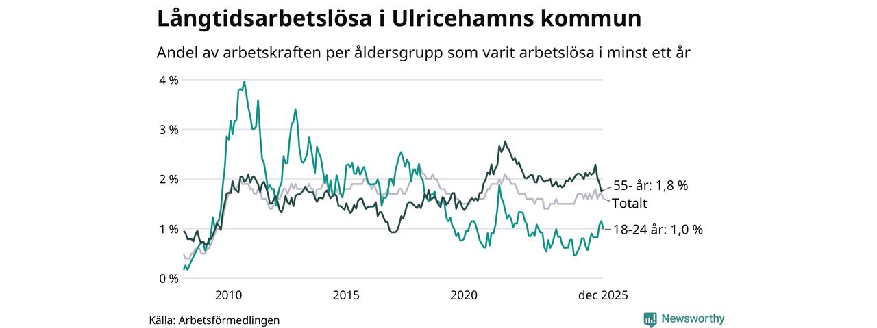 Av de 200 personerna som varit arbetslösa i mer än ett år i Ulricehamns kommun är 53 personer mellan 55 och 651 år och tolv är mellan 18 och 24 år. För den äldre gruppen är andelen arbetslösa 1,8 procent medan den i den yngre gruppen är 1,0 procent. Även i riket som helhet är långtidsarbetslösheten högre i gruppen äldre.