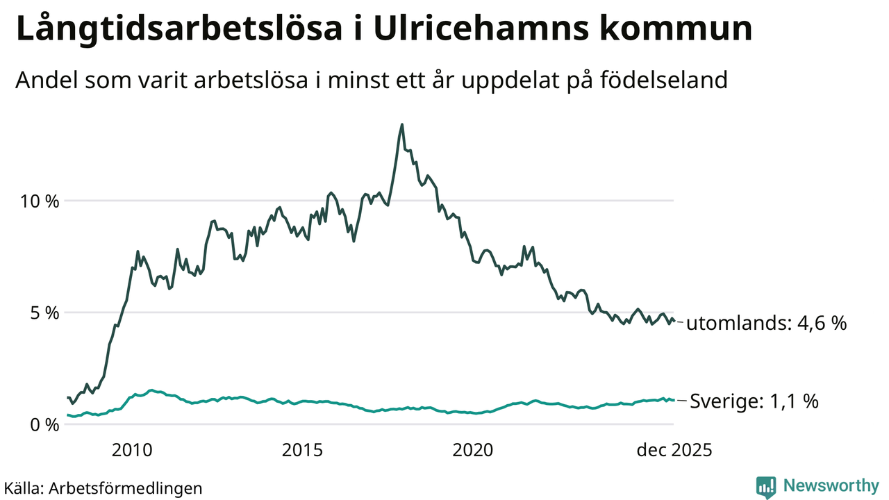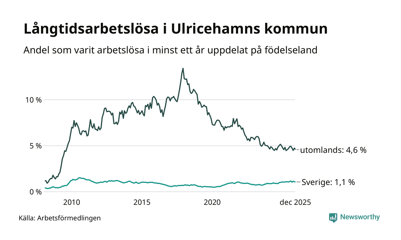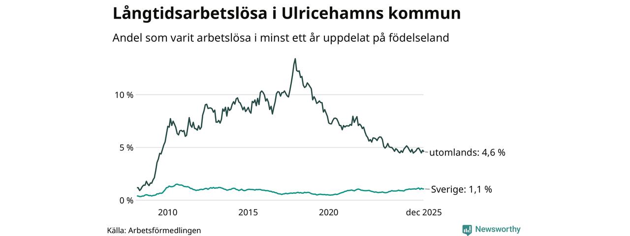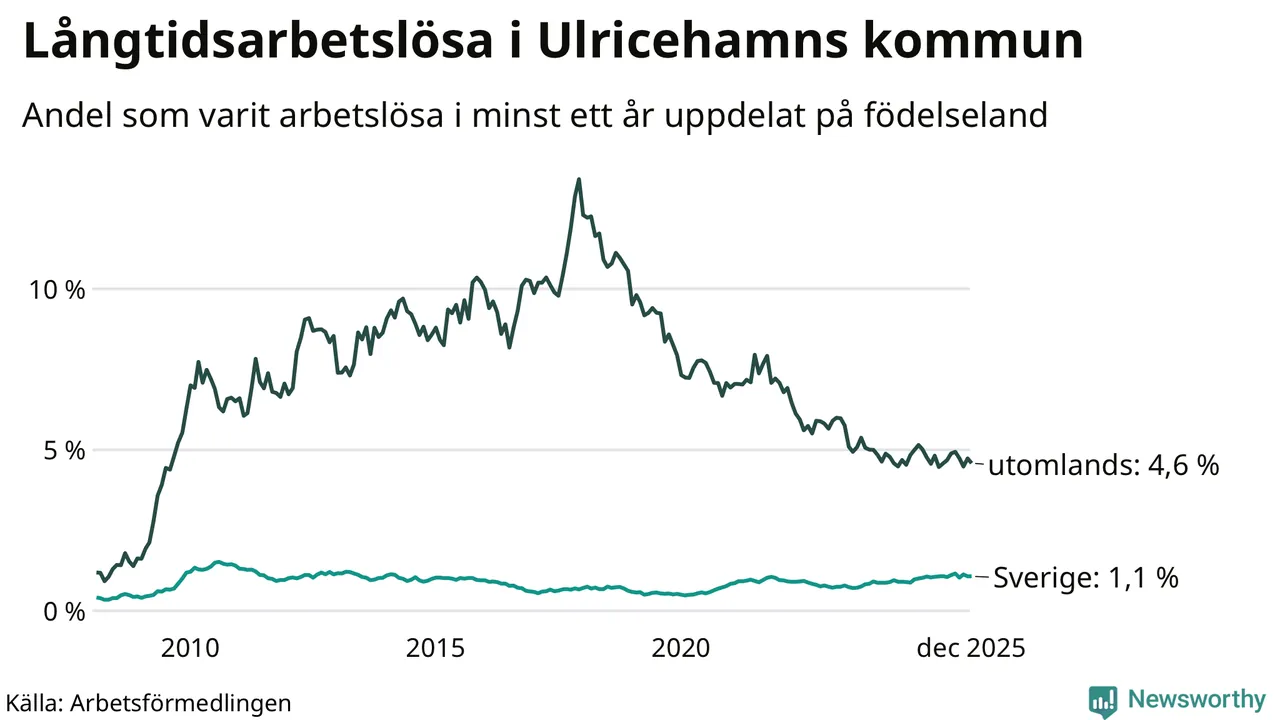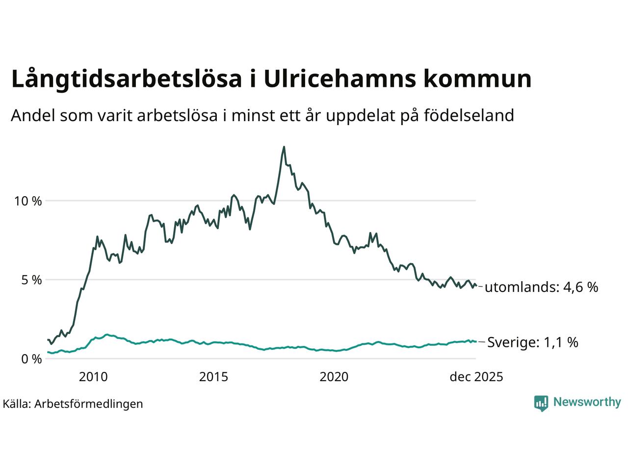 109 av de långtidsarbetslösa i Ulricehamn är födda i Sverige, medan 91 är födda utomlands. Det innebär att långtidsarbetslösheten bland Sverigefödda är 1,1 procent, medan den är fyra gånger så hög – 4,6 procent – bland födda utomlands. Även i riket som helhet är arbetslösheten högre bland utrikesfödda.