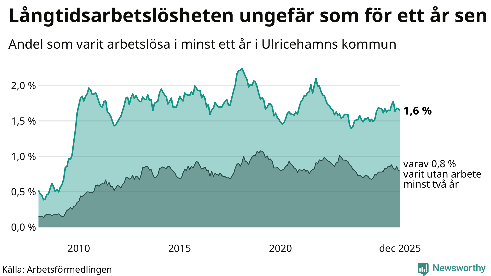 | Andel arbetslösa i minst två år | 0,8 % | 1,3 % | 1,5 % |