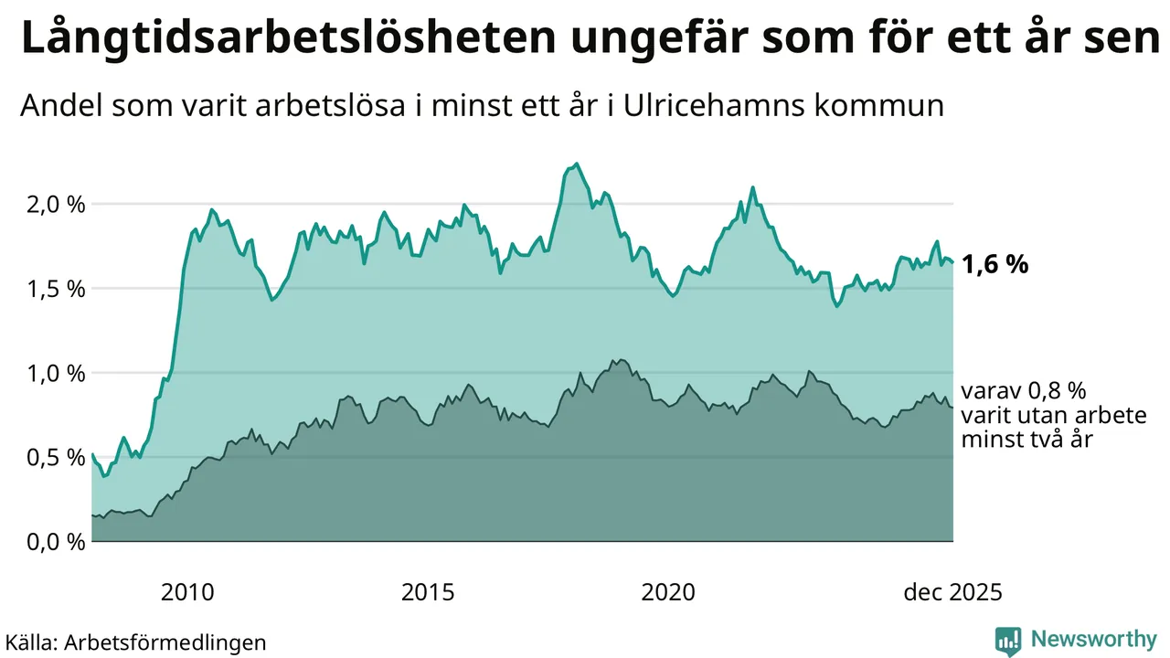 I december hade 200 Ulricehamnsbor varit arbetslösa i minst ett år, vilket är tre färre än månaden innan. 200 personer motsvarar 1,6 procent av arbetskraften i kommunen – andelen långtidsarbetslösa är ungefär på samma nivå som för ett år sedan.
