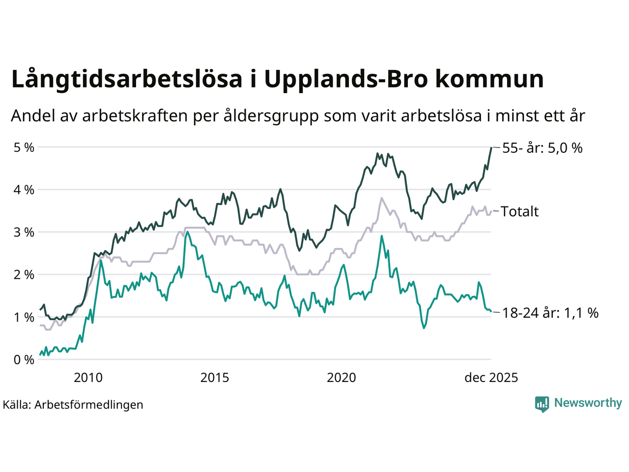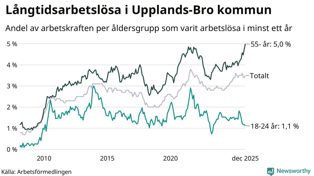 Av de 586 personerna som varit arbetslösa i mer än ett år i Upplands-Bro kommun är 150 personer mellan 55 och 651 år och 20 är mellan 18 och 24 år. För den äldre gruppen är andelen arbetslösa 5,0 procent medan den i den yngre gruppen är 1,1 procent. Även i riket som helhet är långtidsarbetslösheten högre i gruppen äldre.