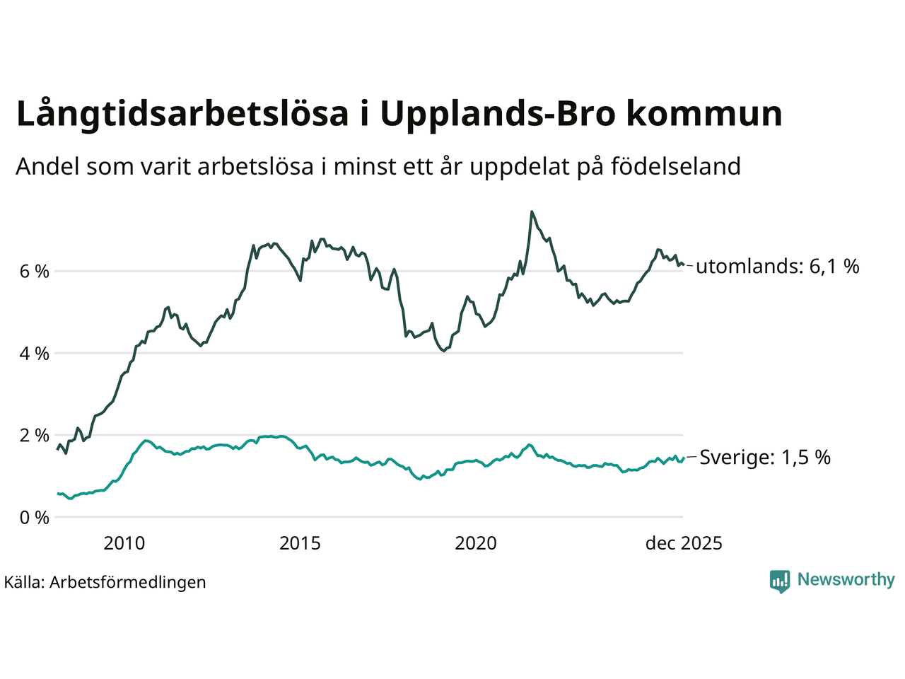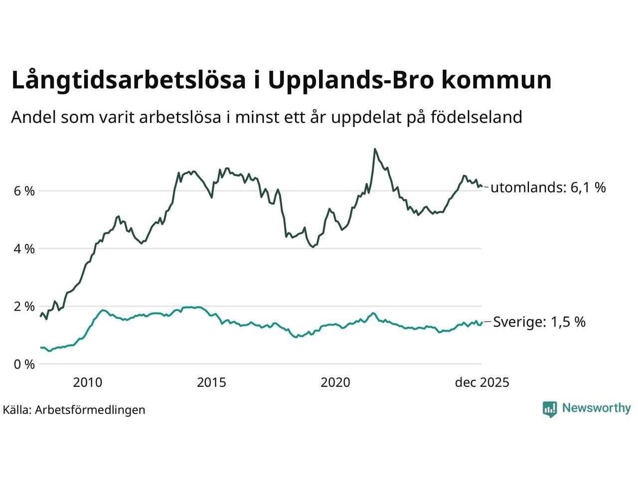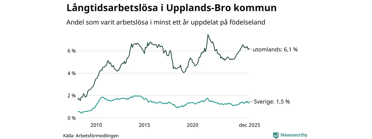 141 av de långtidsarbetslösa i Upplands-Bro är födda i Sverige, medan 445 är födda utomlands. Det innebär att långtidsarbetslösheten bland Sverigefödda är 1,5 procent, medan den är fyra gånger så hög – 6,1 procent – bland födda utomlands. Även i riket som helhet är arbetslösheten högre bland utrikesfödda.