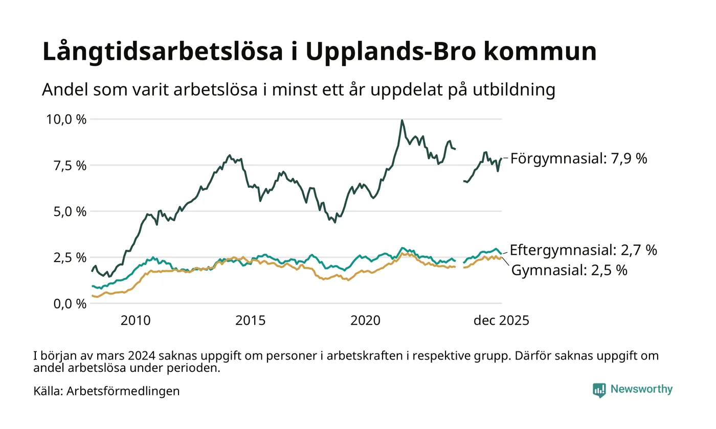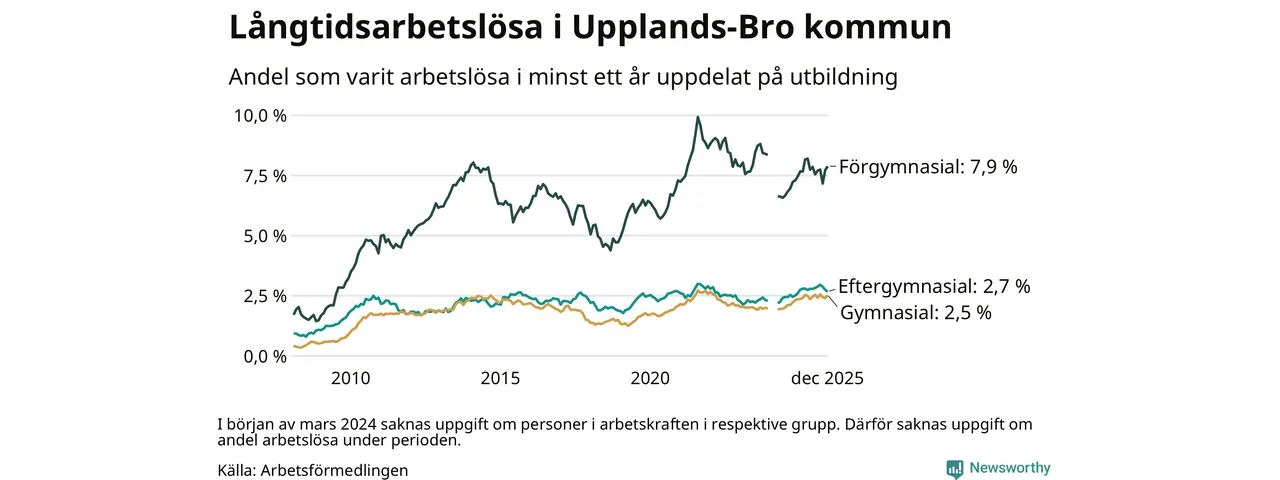 Andelen som varit utan arbete i minst ett år i Upplands-Bro var högre i december jämfört med samma månad för ett år sedan. Det visar Arbetsfömedlingens senaste månadsstatistik.