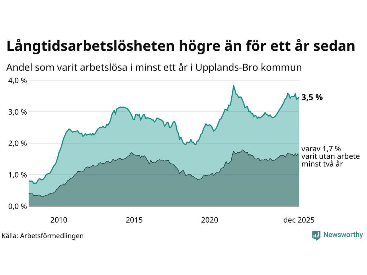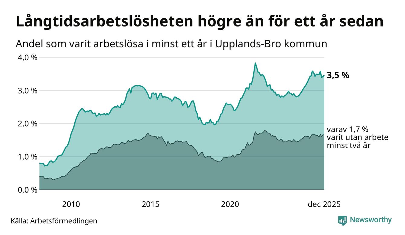 I december hade 586 Upplands-Brobor varit arbetslösa i minst ett år, vilket är åtta fler än månaden innan. 586 personer motsvarar 3,5 procent av arbetskraften i kommunen – andelen långtidsarbetslösa är 0,2 procentenheter högre än samma månad för ett år sedan.