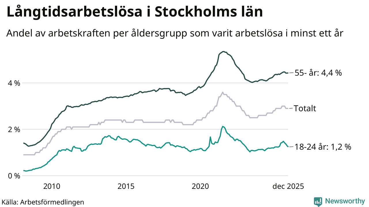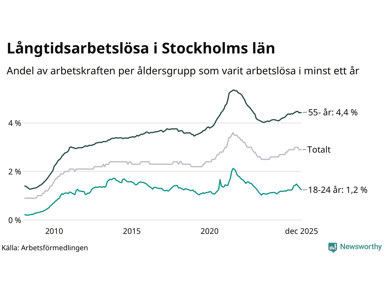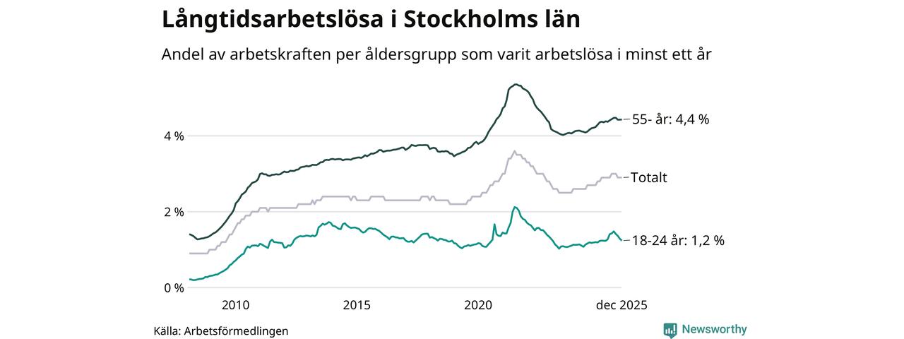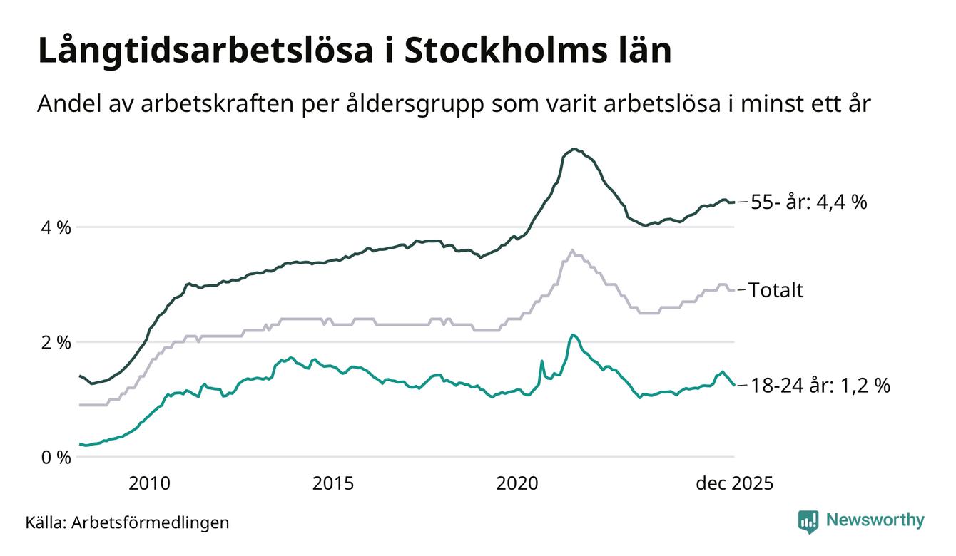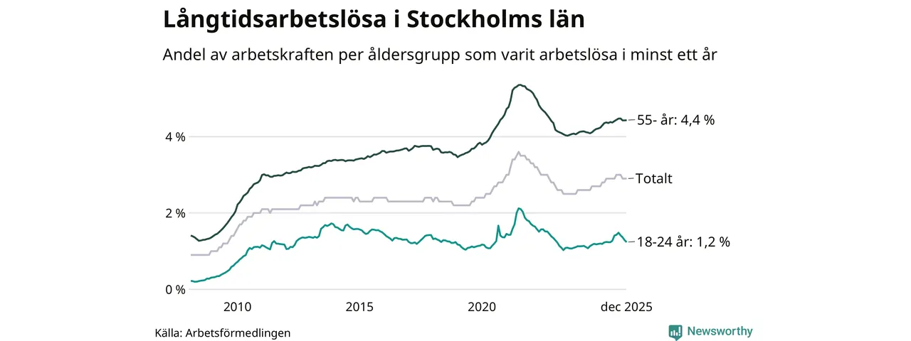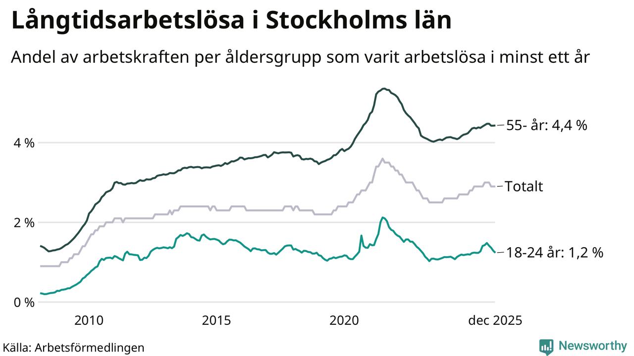 Av de 37 814 personerna som varit arbetslösa i mer än ett år i Stockholms län är 11 211 personer mellan 55 och 651 år och 1 425 är mellan 18 och 24 år. För den äldre gruppen är andelen arbetslösa 4,4 procent medan den i den yngre gruppen är 1,2 procent. Även i riket som helhet är långtidsarbetslösheten högre i gruppen äldre.