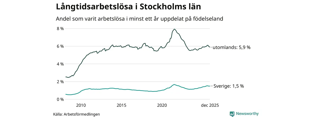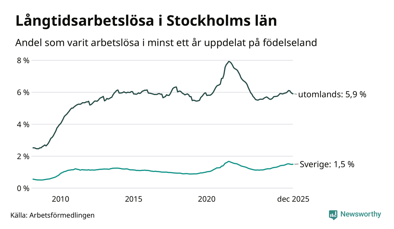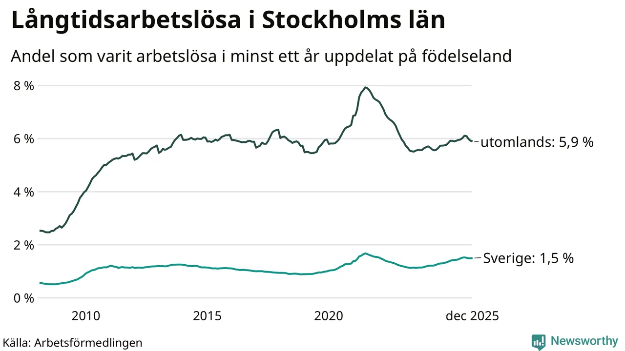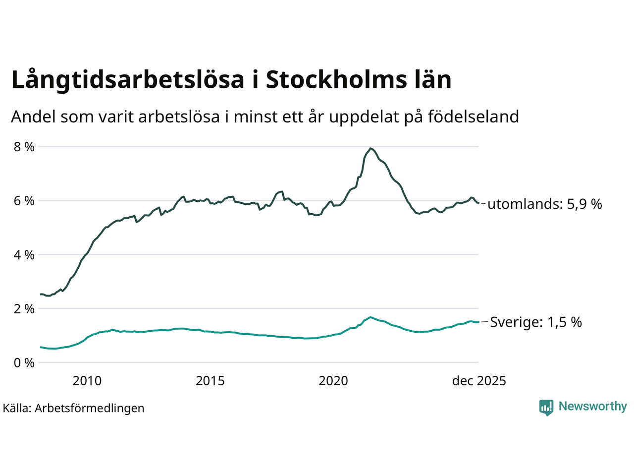 13 140 av de långtidsarbetslösa i Stockholms län är födda i Sverige och mellan 24 675 och 24 678 är födda utomlands. Det innebär att långtidsarbetslösheten bland Sverigefödda är 1,5 procent, medan den ligger på 5,9 procent för utlandsfödda.