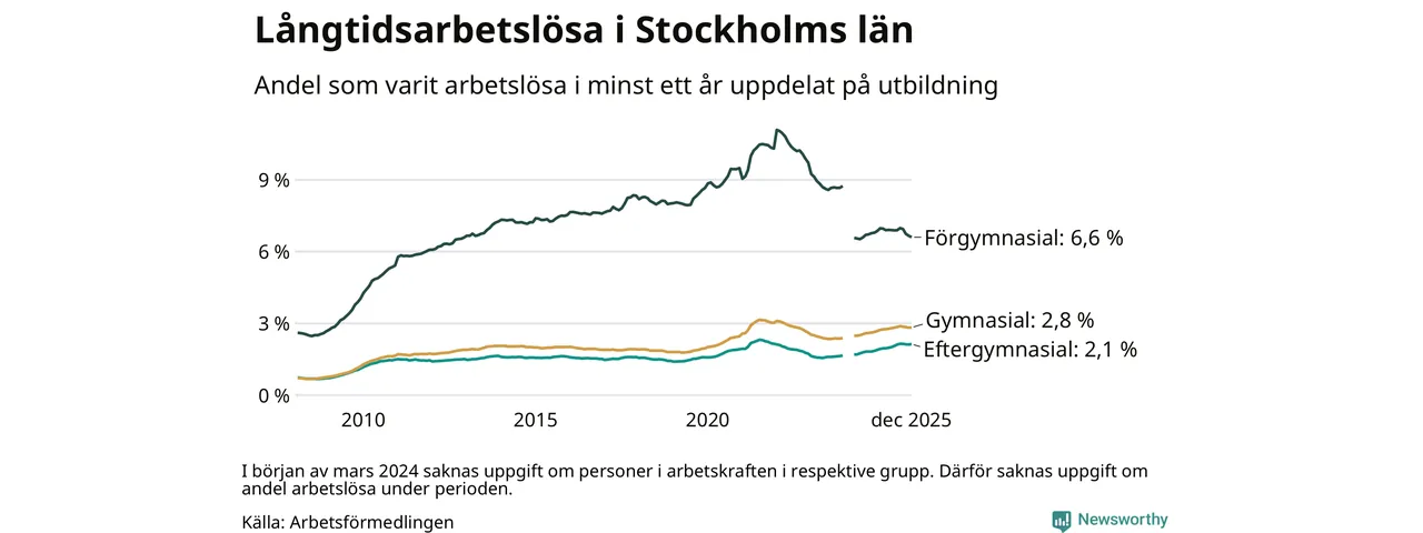 Graf över andel långtidsarbetslösa i Stockholms län uppdelat på utbildningsnivå