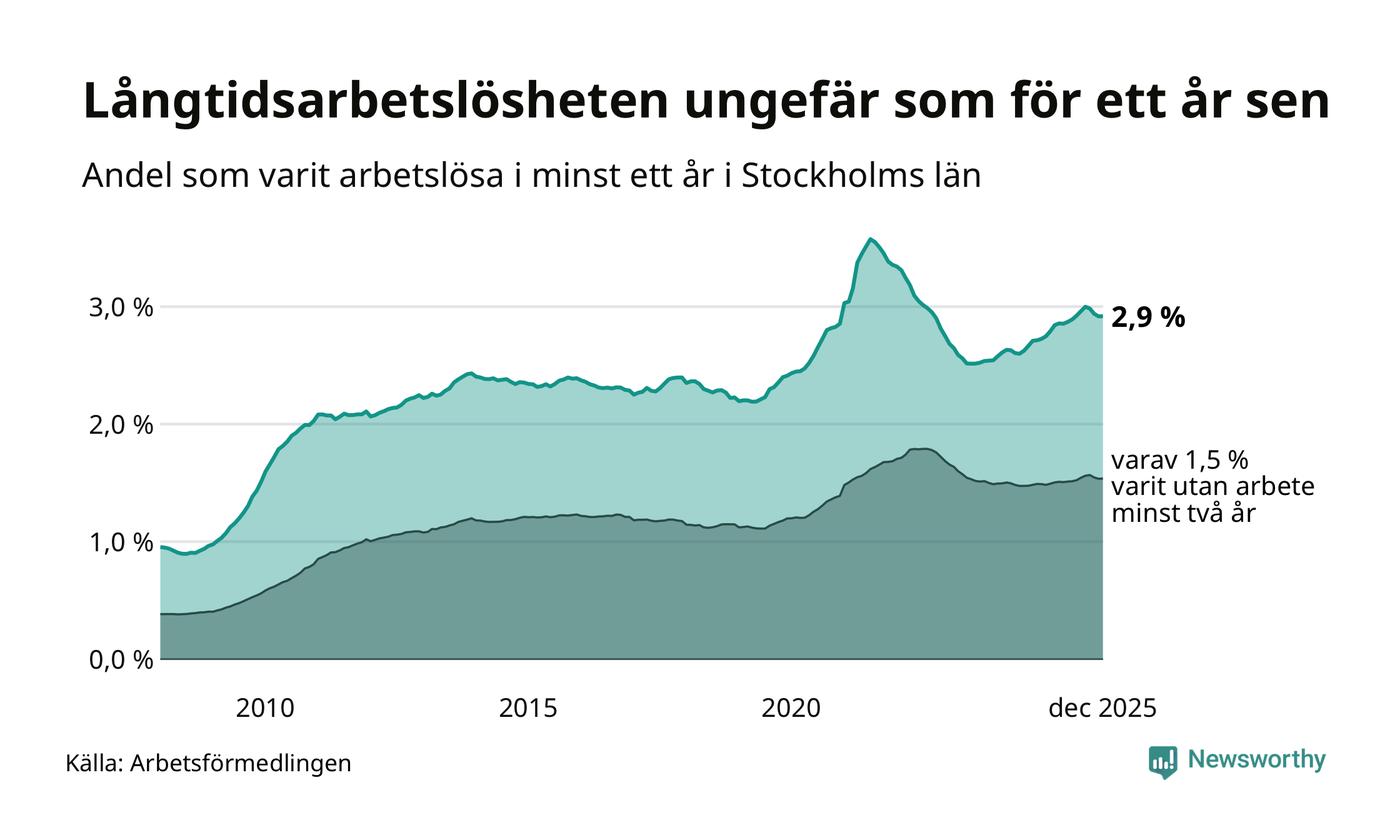 Andelen som varit utan arbete i minst ett år i Stockholms län var ungefär lika stor i december jämfört med samma månad för ett år sedan. Det visar Arbetsfömedlingens senaste månadsstatistik.