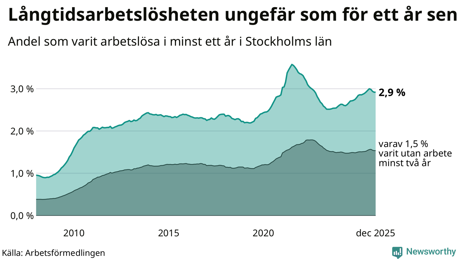 Totalt i riket hade omkring 152 000 personer varit utan arbete i minst ett år i december. Det motsvarar 2,9 procent av arbetskraften, vilket är ungefär lika stor andel som för ett år sedan.