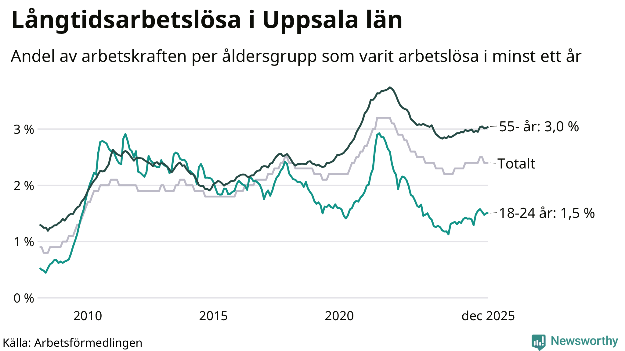 | Andel arbetslösa i minst två år | 1,2 % | 1,5 % |