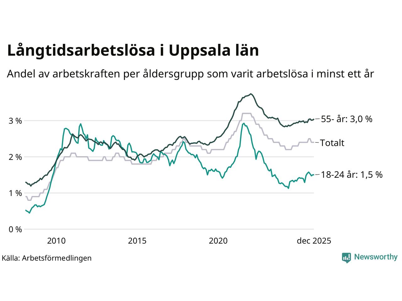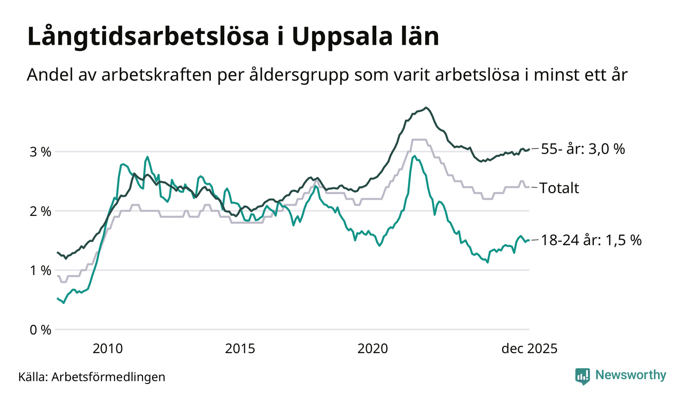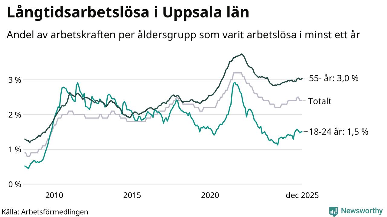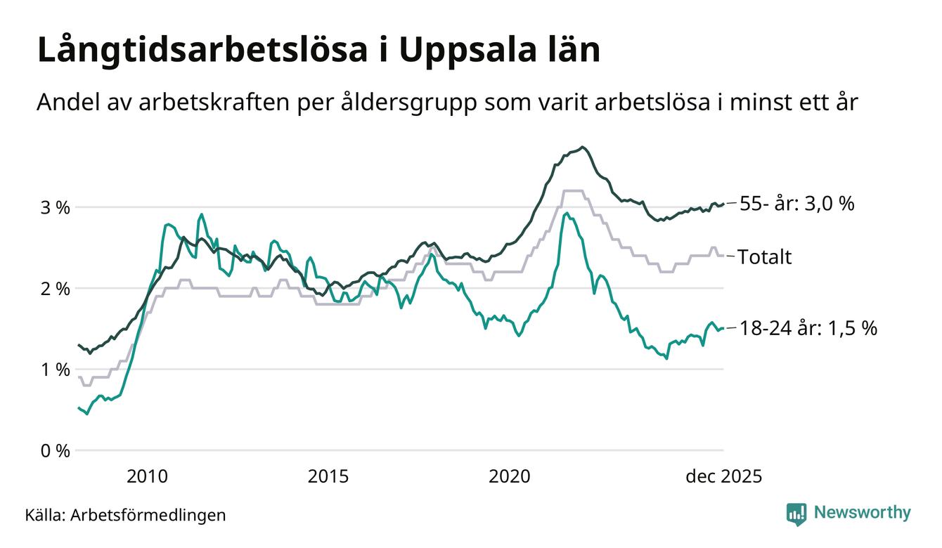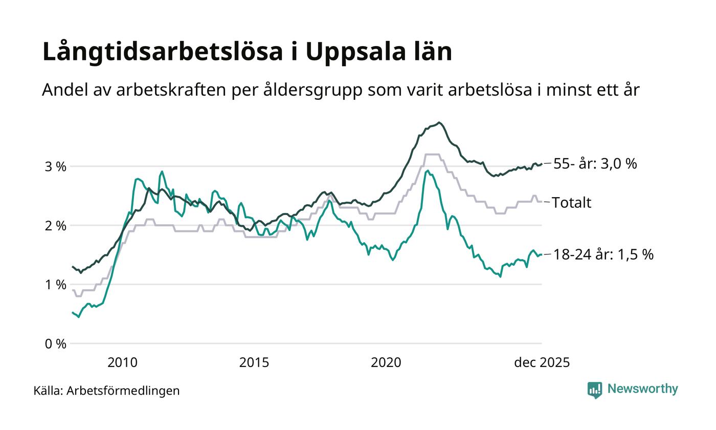 Av de 4 932 personerna som varit arbetslösa i mer än ett år i Uppsala län är 1 231 personer mellan 55 och 651 år och 357 är mellan 18 och 24 år. För den äldre gruppen är andelen arbetslösa 3,0 procent medan den i den yngre gruppen är 1,5 procent. Även i riket som helhet är långtidsarbetslösheten högre i gruppen äldre.