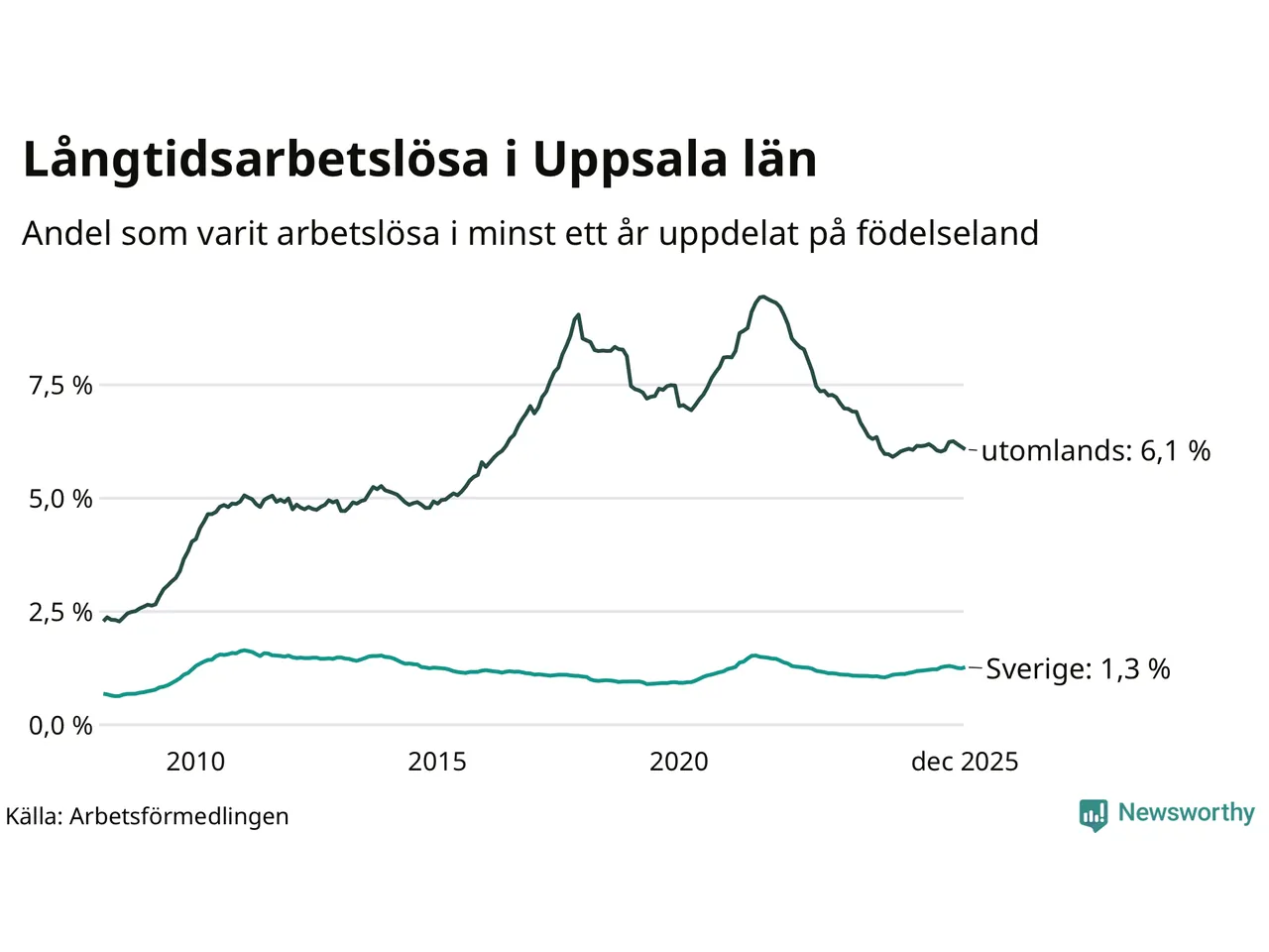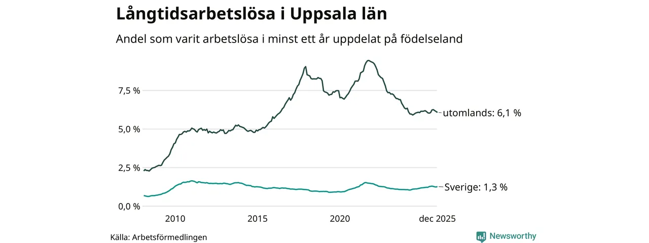 1 984 av de långtidsarbetslösa i Uppsala län är födda i Sverige och mellan 2 949 och 2 952 är födda utomlands. Det innebär att långtidsarbetslösheten bland Sverigefödda är 1,3 procent, medan den ligger på 6,1 procent för utlandsfödda.
