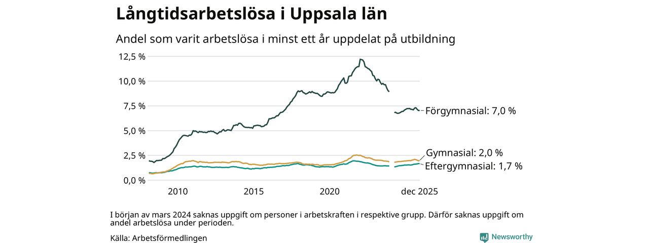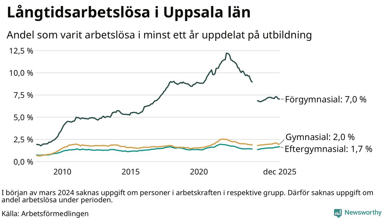 I december hade 4 932 Uppsalabor varit arbetslösa i minst ett år, vilket är 20 fler än månaden innan. 4 932 personer motsvarar 2,4 procent av arbetskraften i länet – andelen långtidsarbetslösa är ungefär på samma nivå som för ett år sedan.