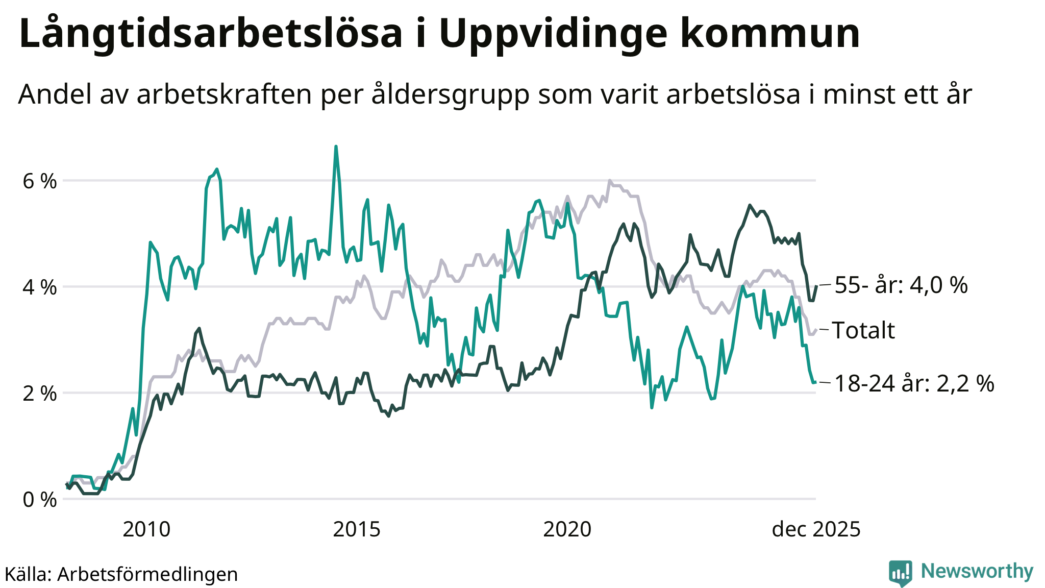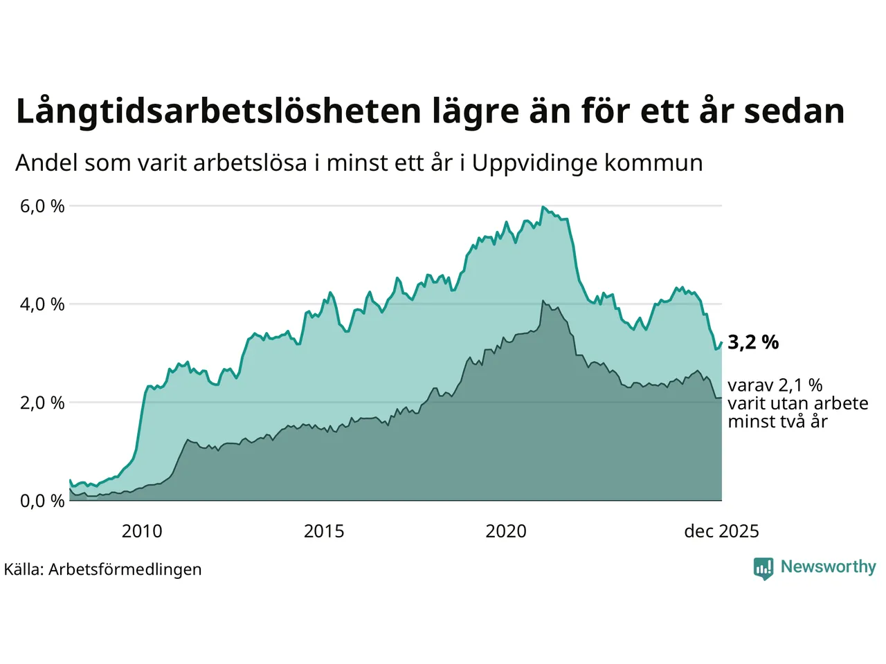 | Andel arbetslösa i minst ett år | 3,2 % | 3,3 % | 2,9 % |