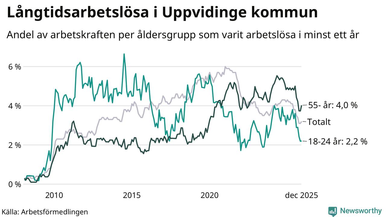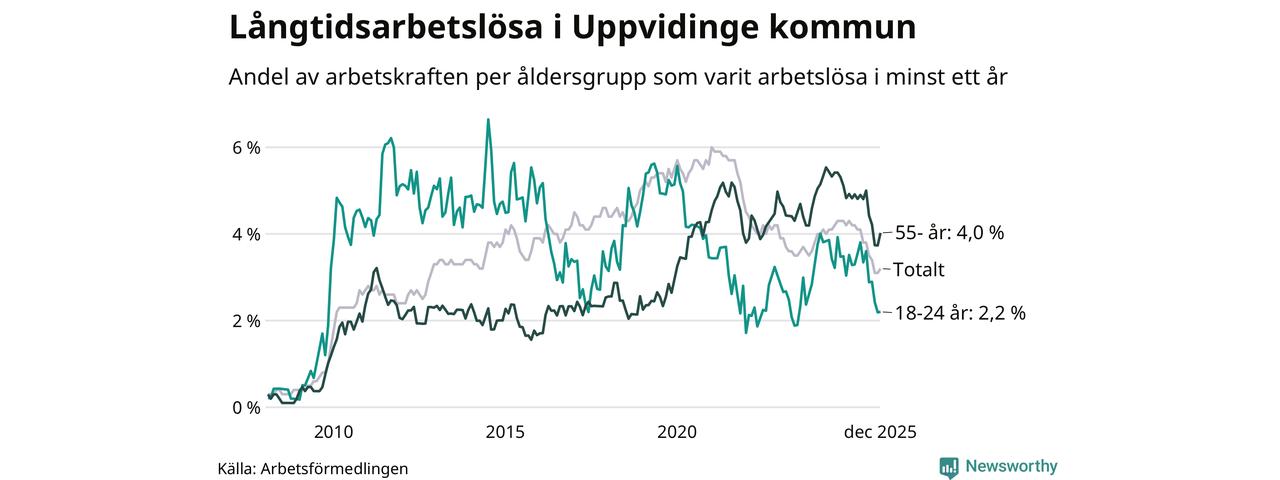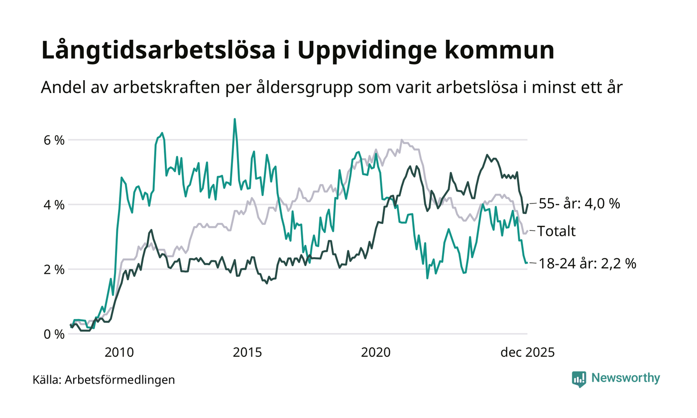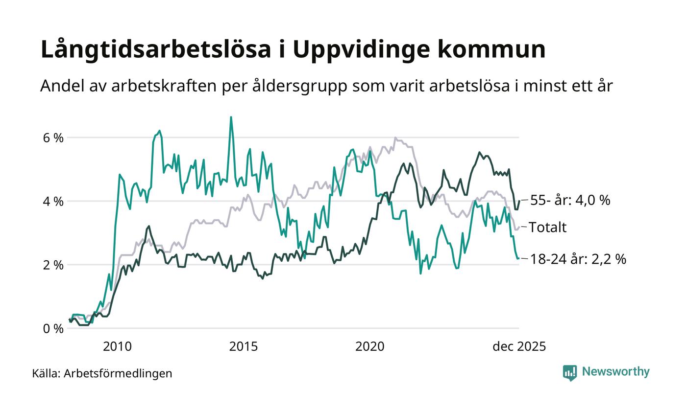 I december hade 136 Uppvidingebor varit arbetslösa i minst ett år, vilket är fem fler än månaden innan. 136 personer motsvarar 3,2 procent av arbetskraften i kommunen – andelen långtidsarbetslösa är 1 procentenheter lägre än samma månad för ett år sedan.