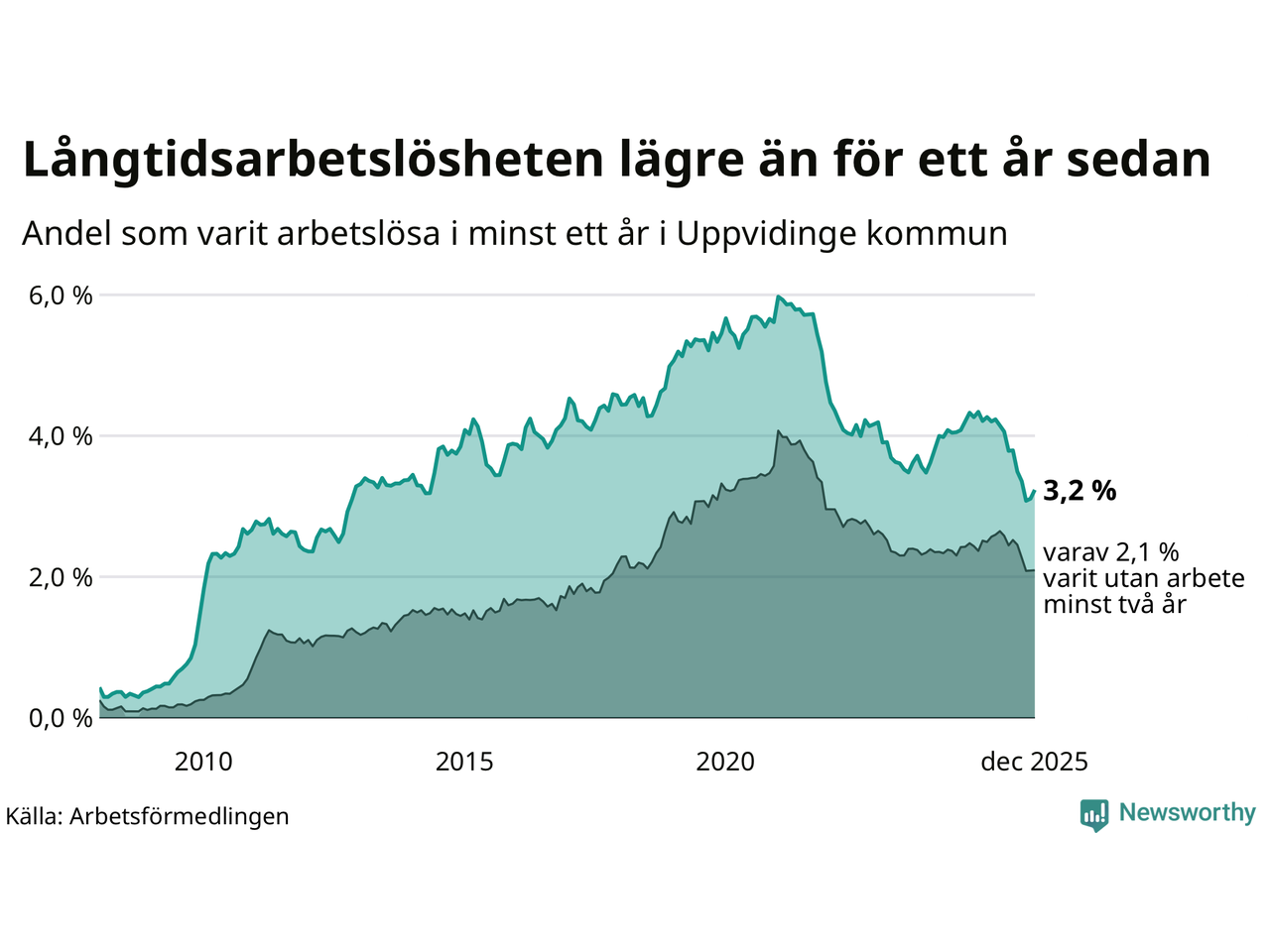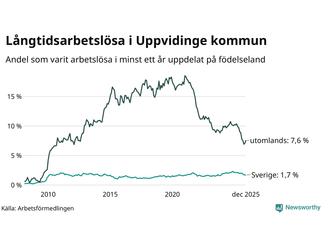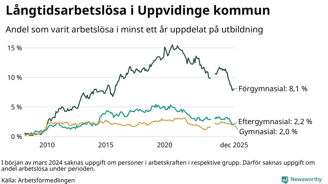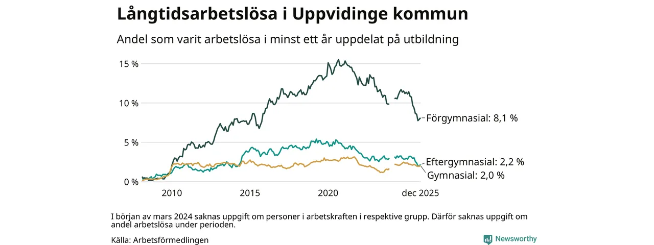 I december hade 136 Uppvidingebor varit arbetslösa i minst ett år, vilket är fem fler än månaden innan. 136 personer motsvarar 3,2 procent av arbetskraften i kommunen – andelen långtidsarbetslösa är 1 procentenheter lägre än samma månad för ett år sedan.