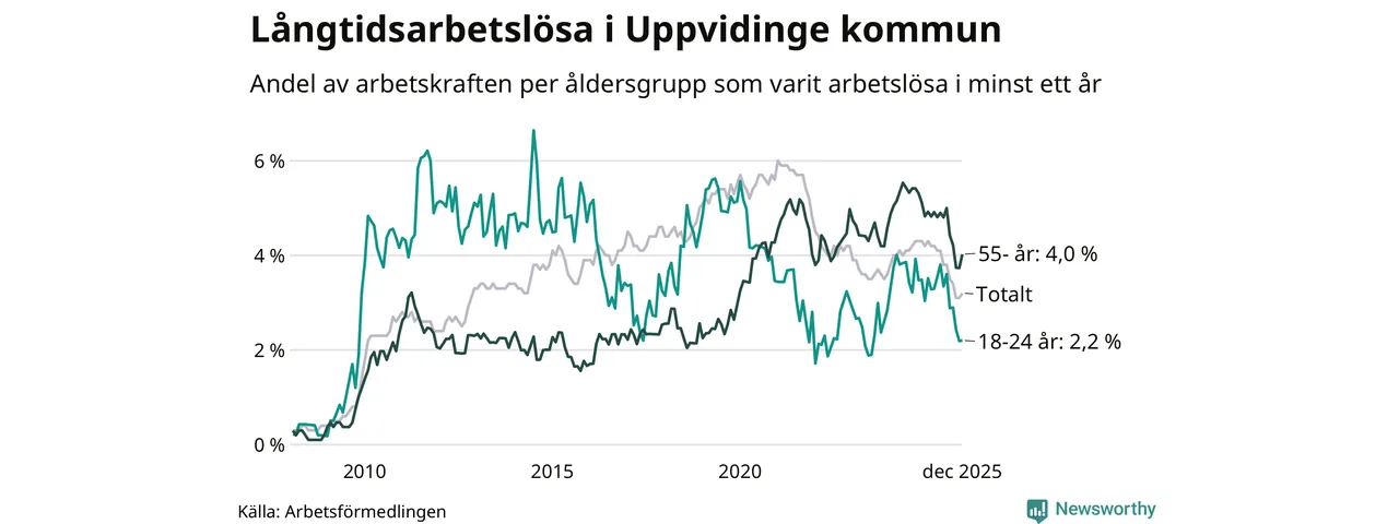 Av de 136 personerna som varit arbetslösa i mer än ett år i Uppvidinge kommun är 42 personer mellan 55 och 651 år och nio är mellan 18 och 24 år. För den äldre gruppen är andelen arbetslösa 4,0 procent medan den i den yngre gruppen är 2,2 procent. Även i riket som helhet är långtidsarbetslösheten högre i gruppen äldre.
