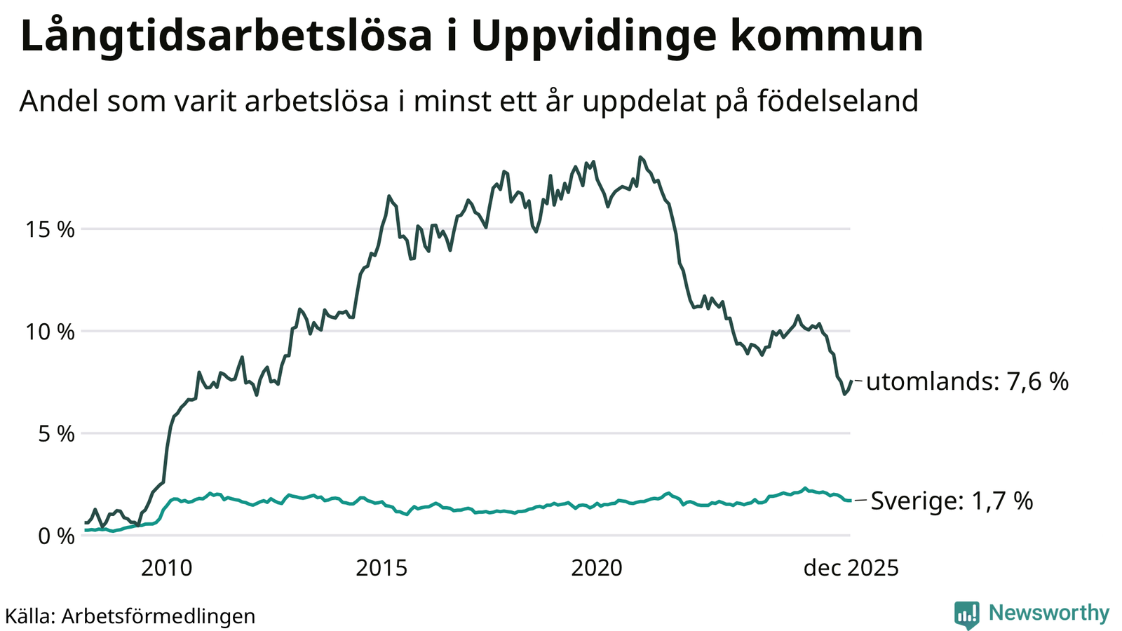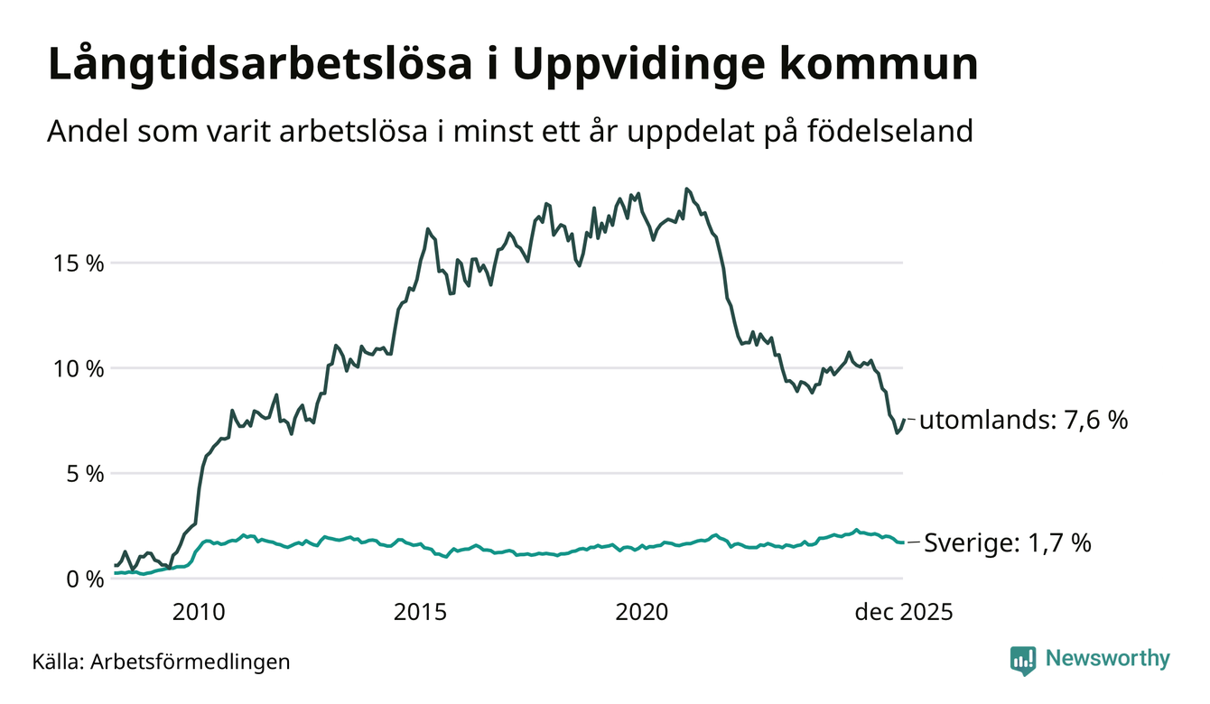 53 av de långtidsarbetslösa i Uppvidinge är födda i Sverige, medan 83 är födda utomlands. Det innebär att långtidsarbetslösheten bland Sverigefödda är 1,7 procent, medan den är fyra gånger så hög – 7,6 procent – bland födda utomlands. Även i riket som helhet är arbetslösheten högre bland utrikesfödda.