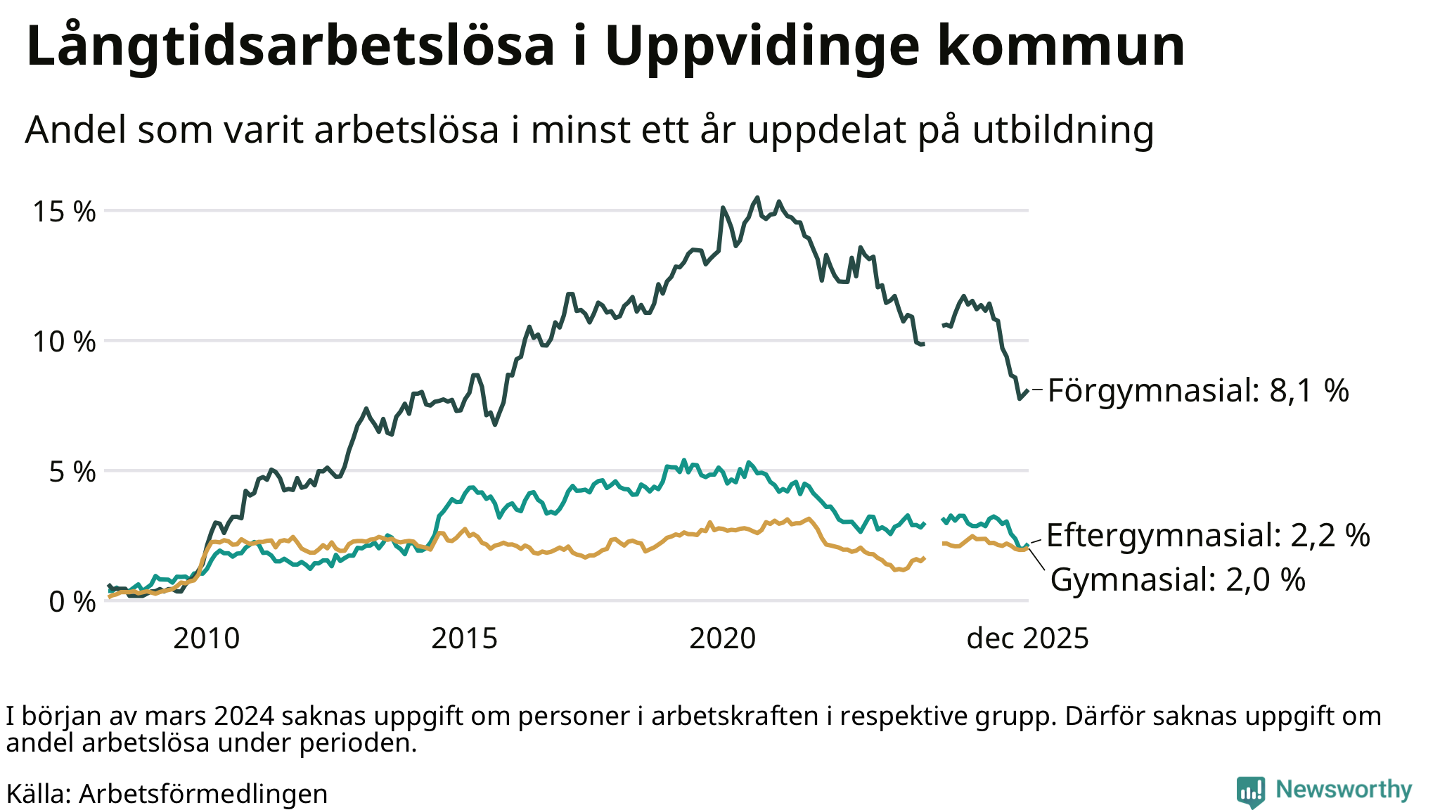 | Bland dem med gymnasieutbildning | 2,0 % | 2,4 % | 2,4 % |