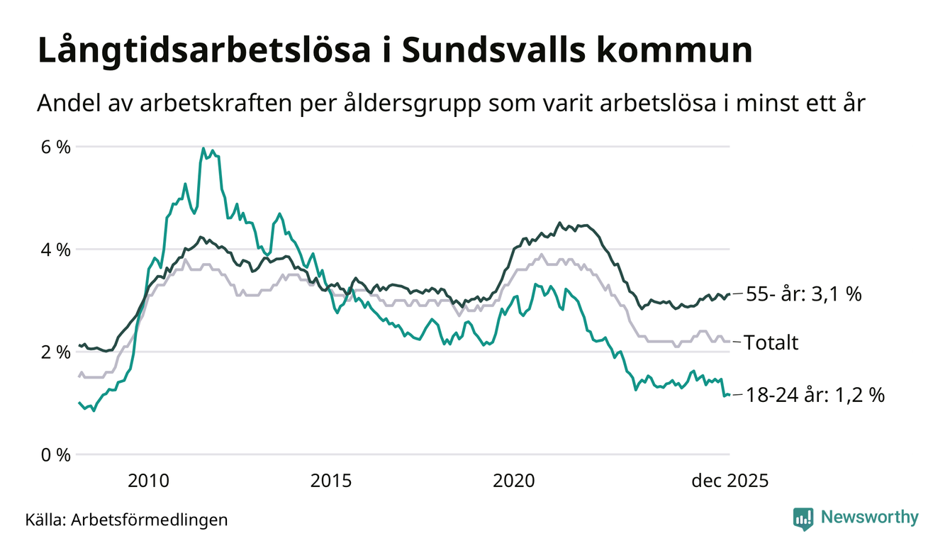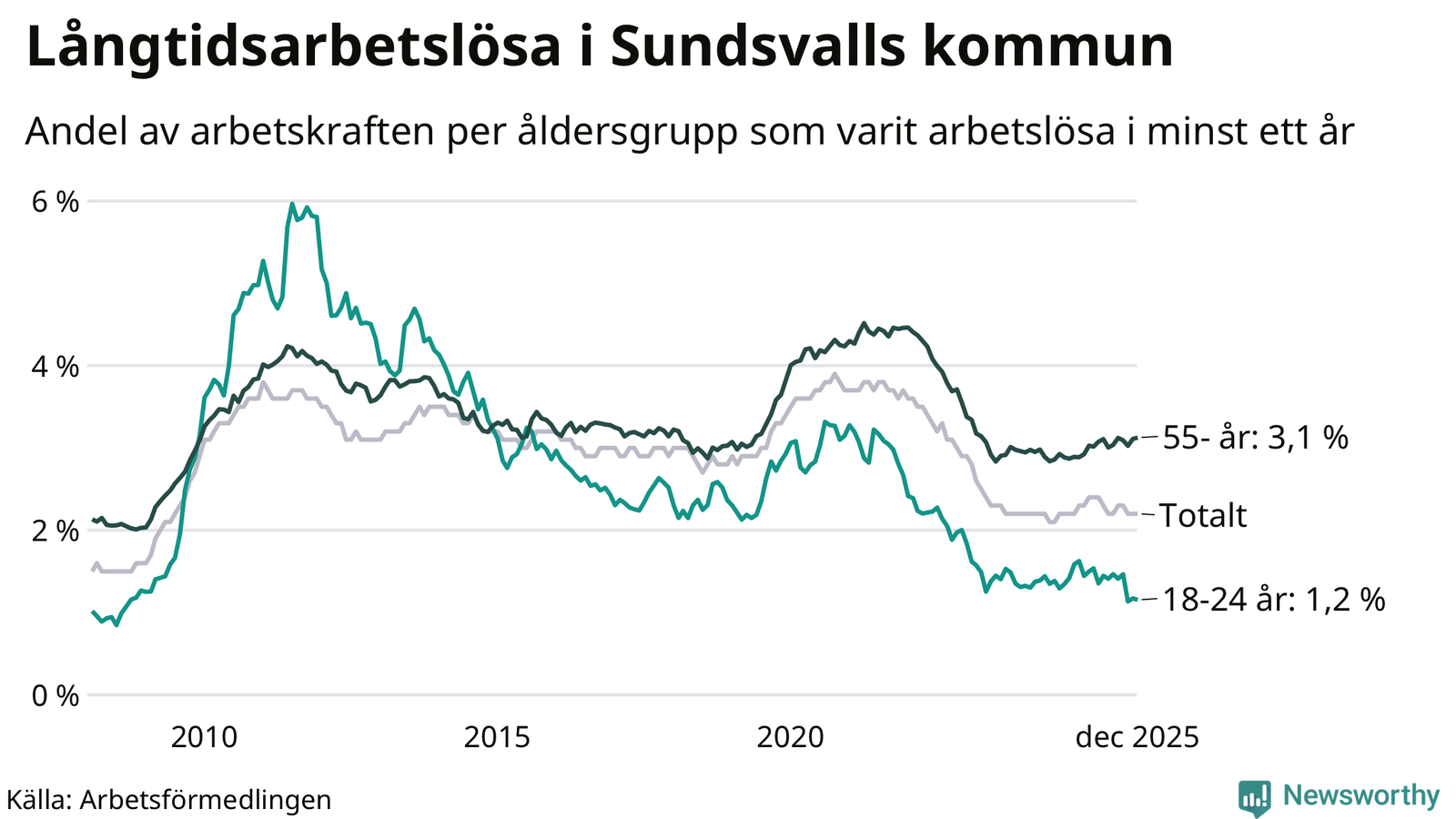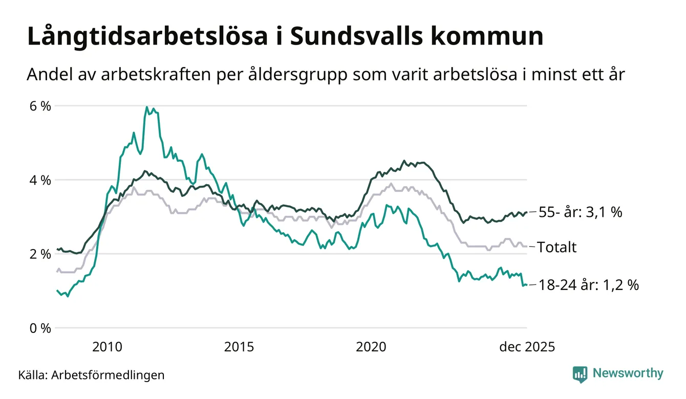 Av de 1 084 personerna som varit arbetslösa i mer än ett år i Sundsvalls kommun är 352 personer mellan 55 och 651 år och 63 är mellan 18 och 24 år. För den äldre gruppen är andelen arbetslösa 3,1 procent medan den i den yngre gruppen är 1,2 procent. Även i riket som helhet är långtidsarbetslösheten högre i gruppen äldre.