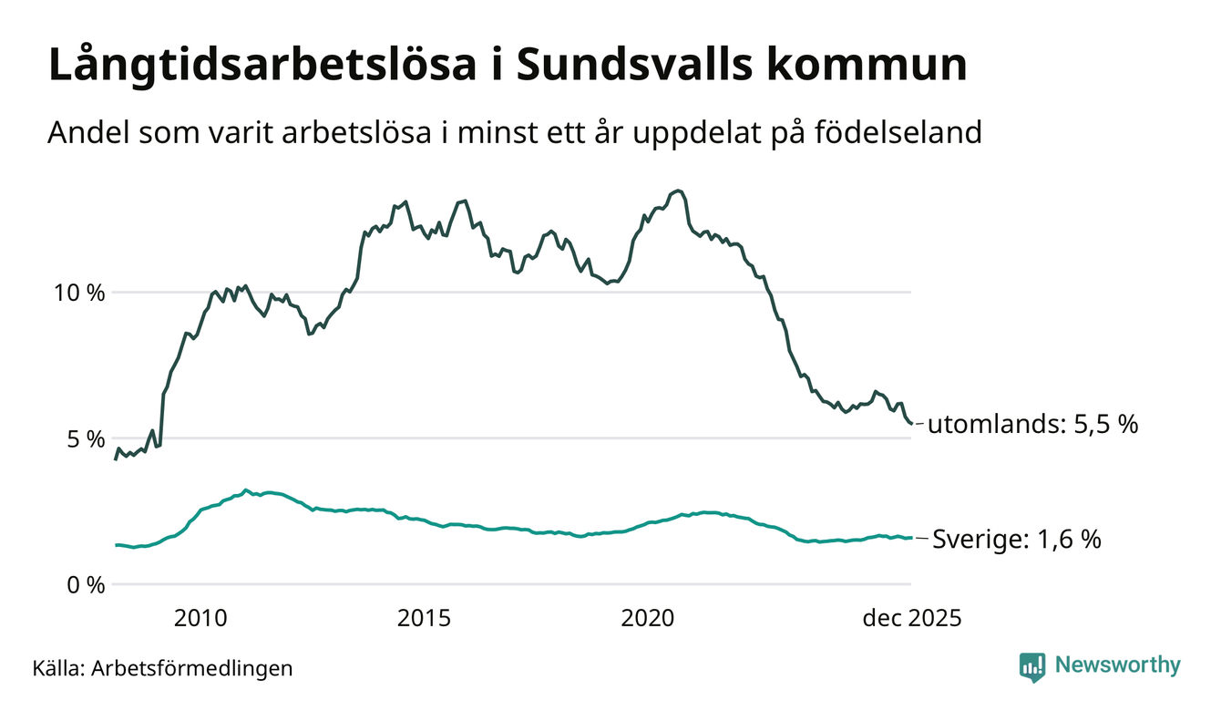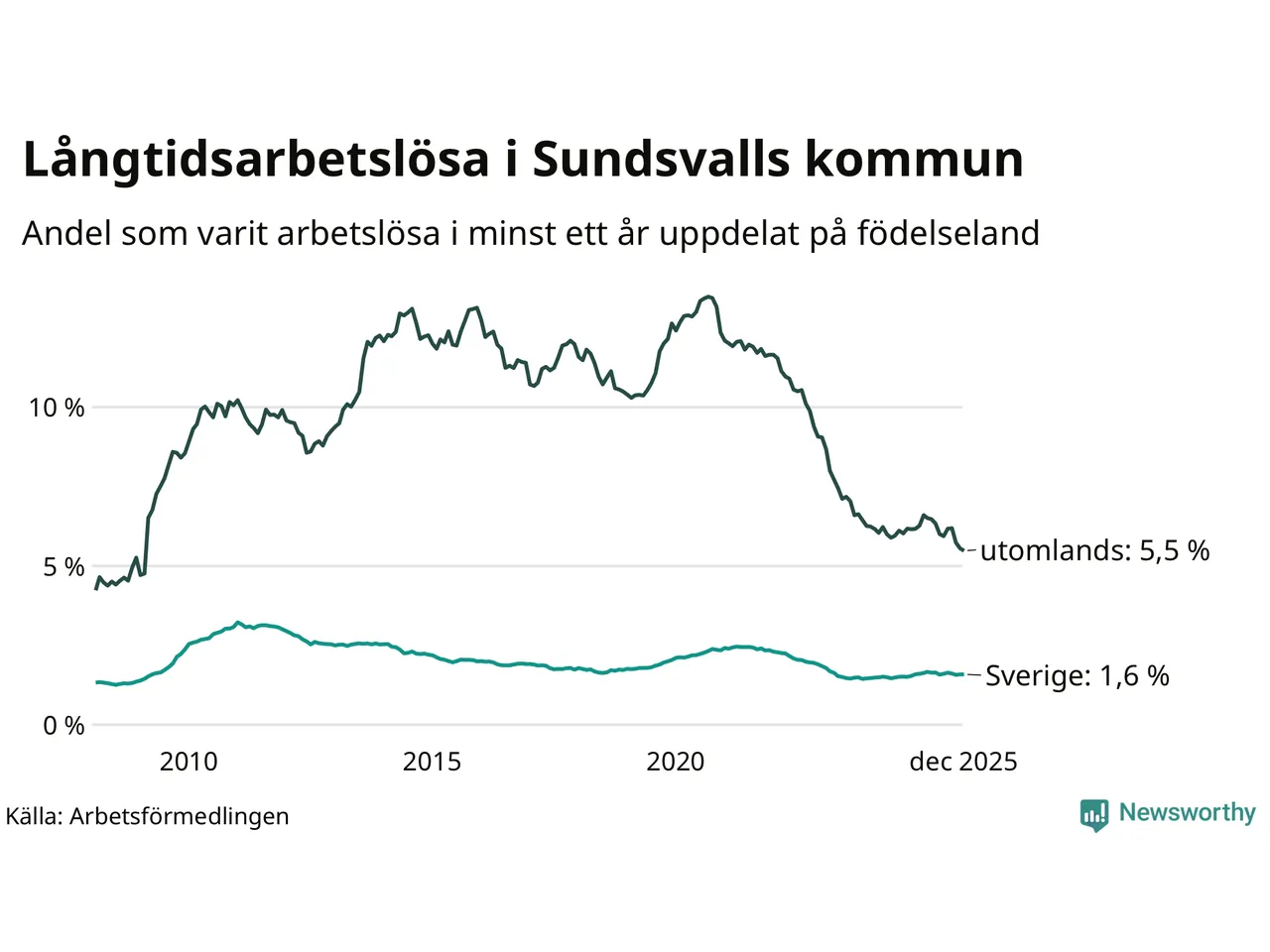 674 av de långtidsarbetslösa i Sundsvall är födda i Sverige, medan 410 är födda utomlands. Det innebär att långtidsarbetslösheten bland Sverigefödda är 1,6 procent, medan den är tre gånger så hög – 5,5 procent – bland födda utomlands. Även i riket som helhet är arbetslösheten högre bland utrikesfödda.