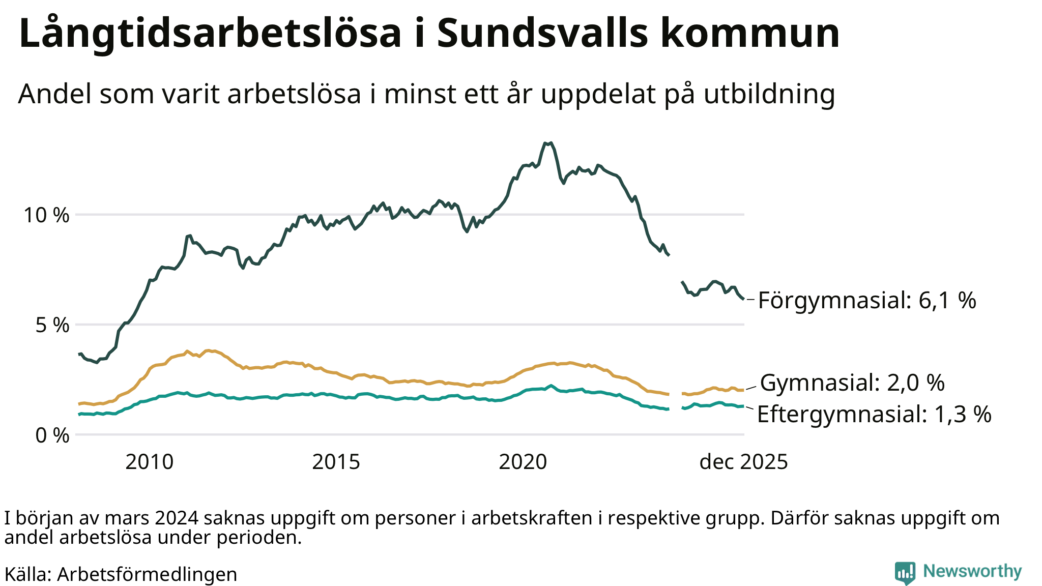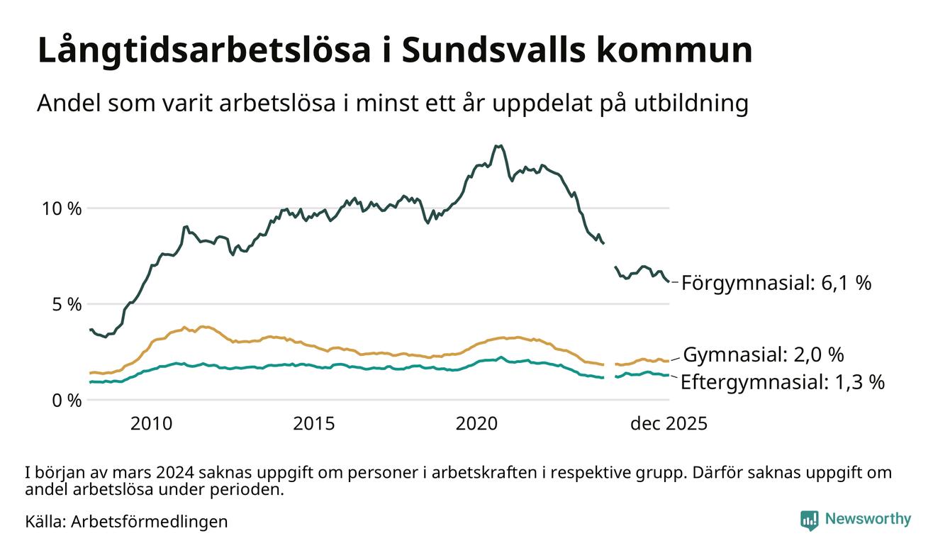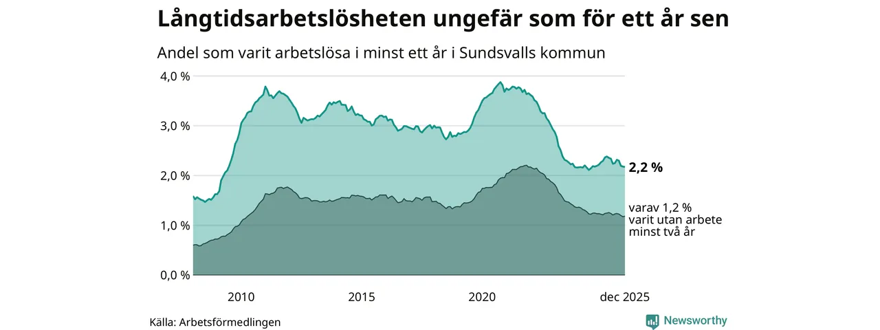 I december hade 1 084 Sundsvallsbor varit arbetslösa i minst ett år, vilket är fyra färre än månaden innan. Det är den fjärde månaden i rad med minskande antal långtidsarbetslösa. 1 084 personer motsvarar 2,2 procent av arbetskraften i kommunen – andelen långtidsarbetslösa är ungefär på samma nivå som för ett år sedan.