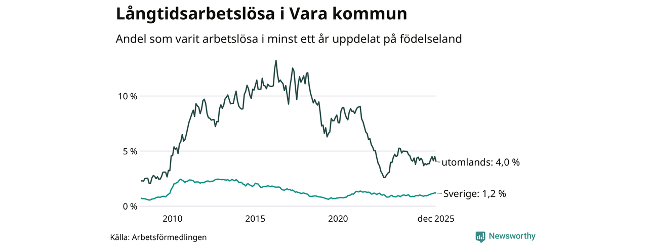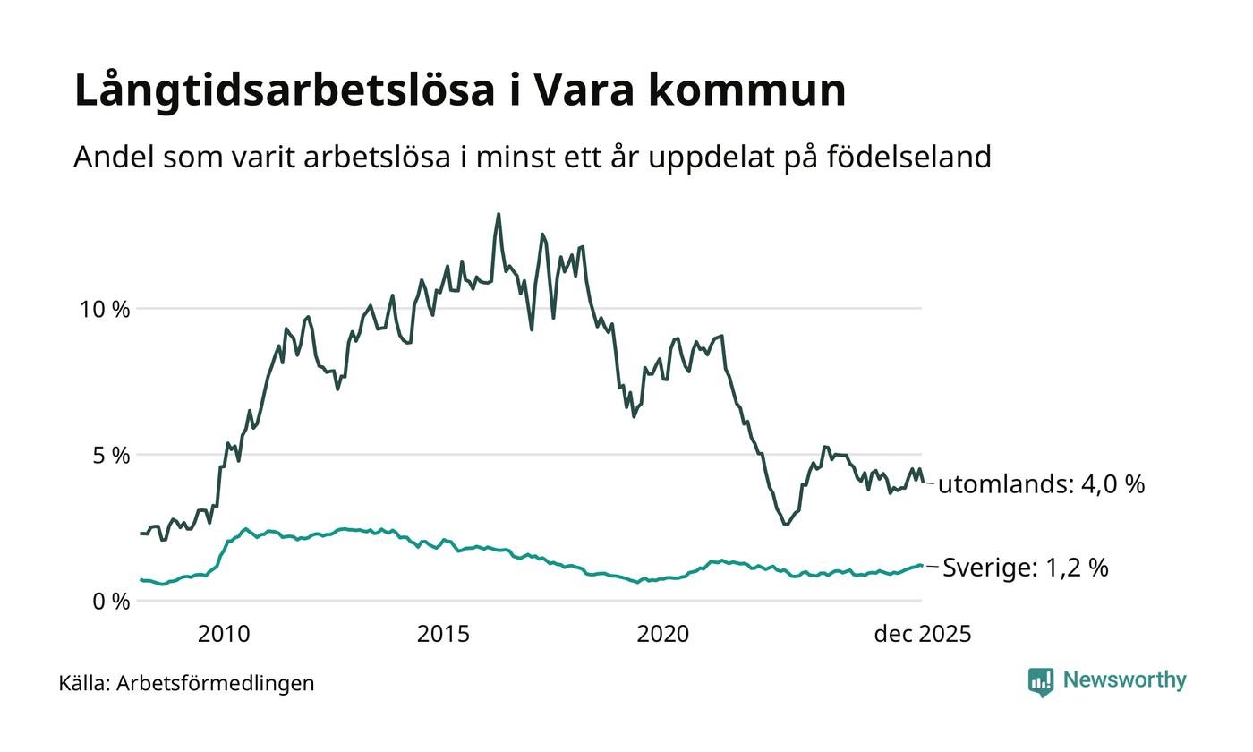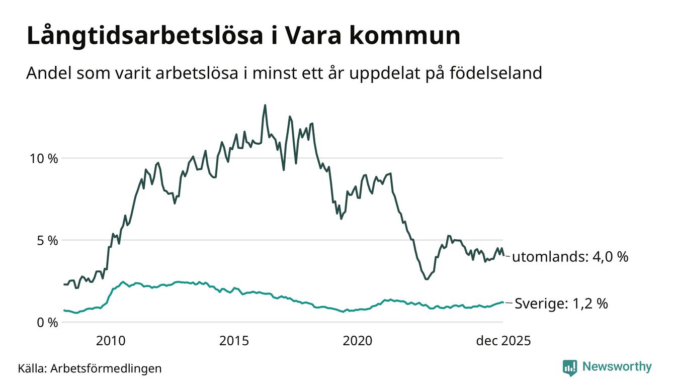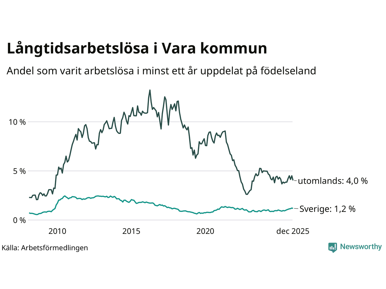 77 av de långtidsarbetslösa i Vara är födda i Sverige, medan 43 är födda utomlands. Det innebär att långtidsarbetslösheten bland Sverigefödda är 1,2 procent, medan den är tre gånger så hög – 4,0 procent – bland födda utomlands. Även i riket som helhet är arbetslösheten högre bland utrikesfödda.