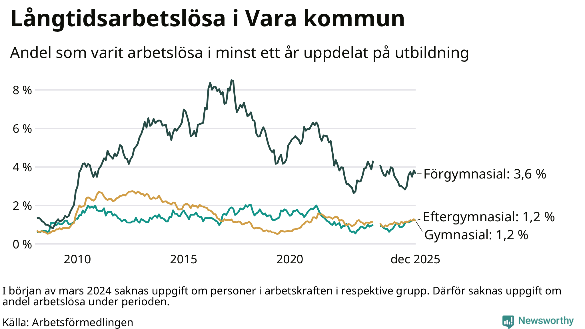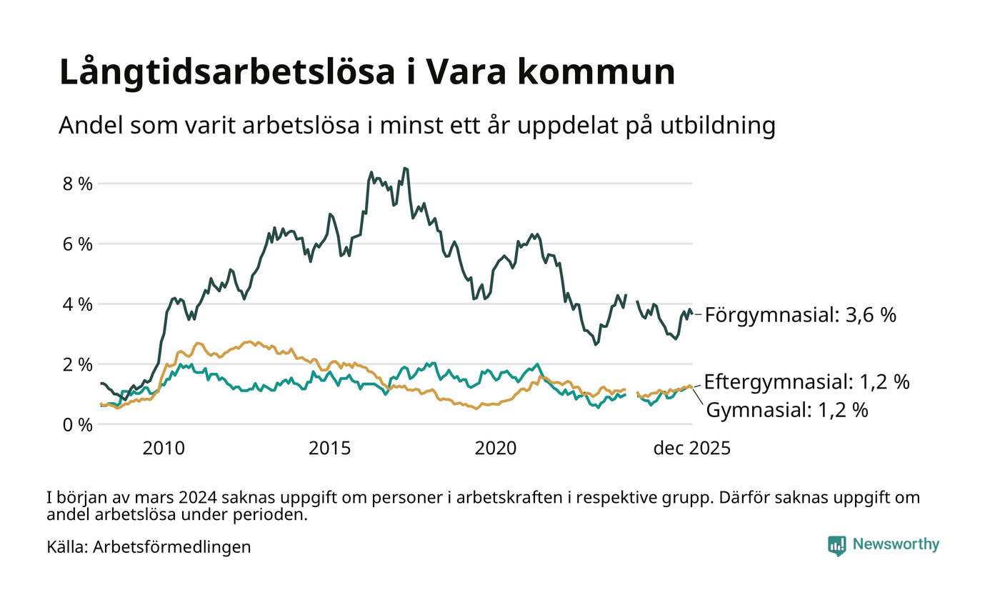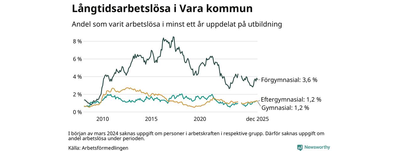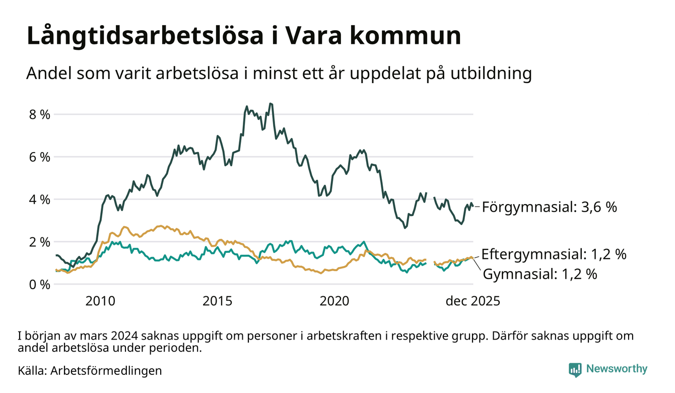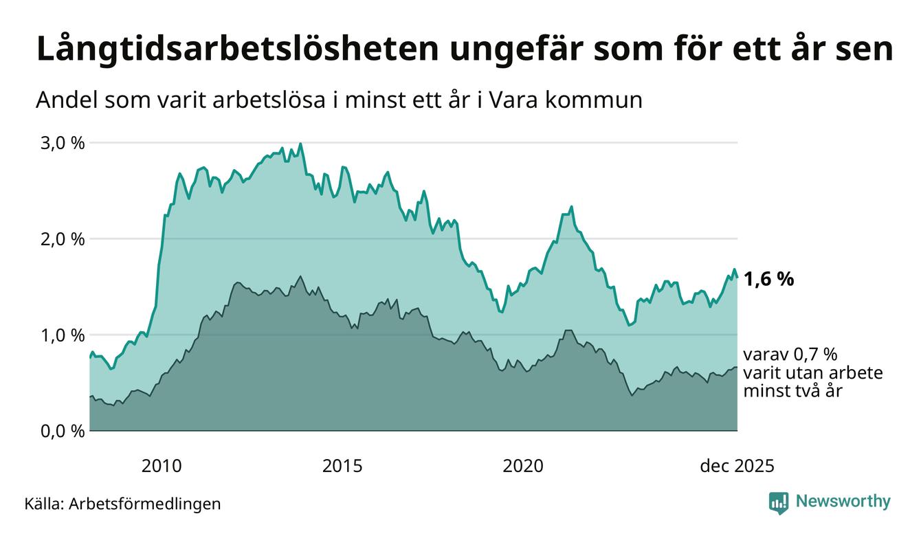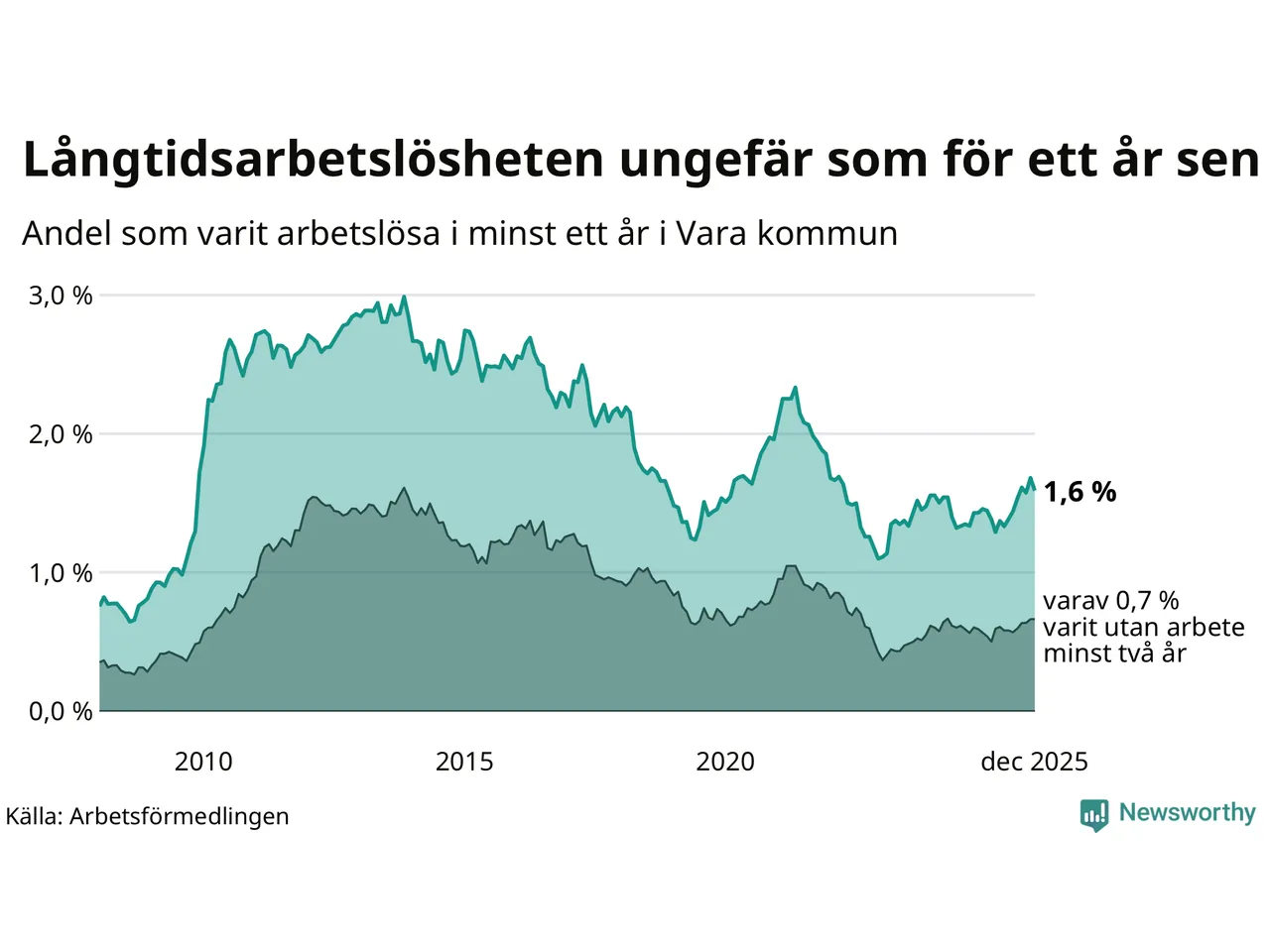 Andelen som varit utan arbete i minst ett år i Vara var ungefär lika stor i december jämfört med samma månad för ett år sedan. Det visar Arbetsfömedlingens senaste månadsstatistik.