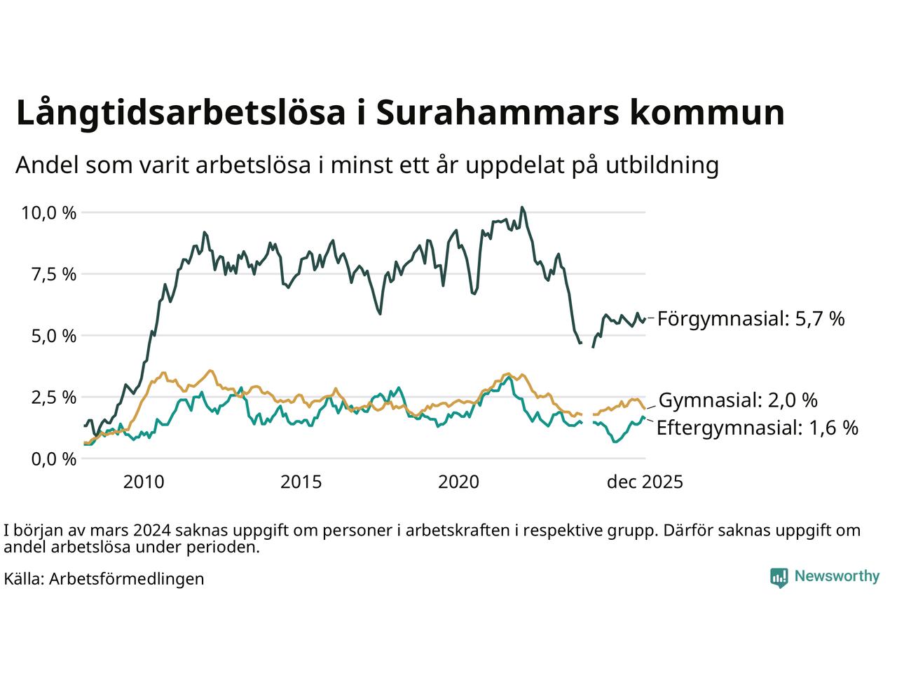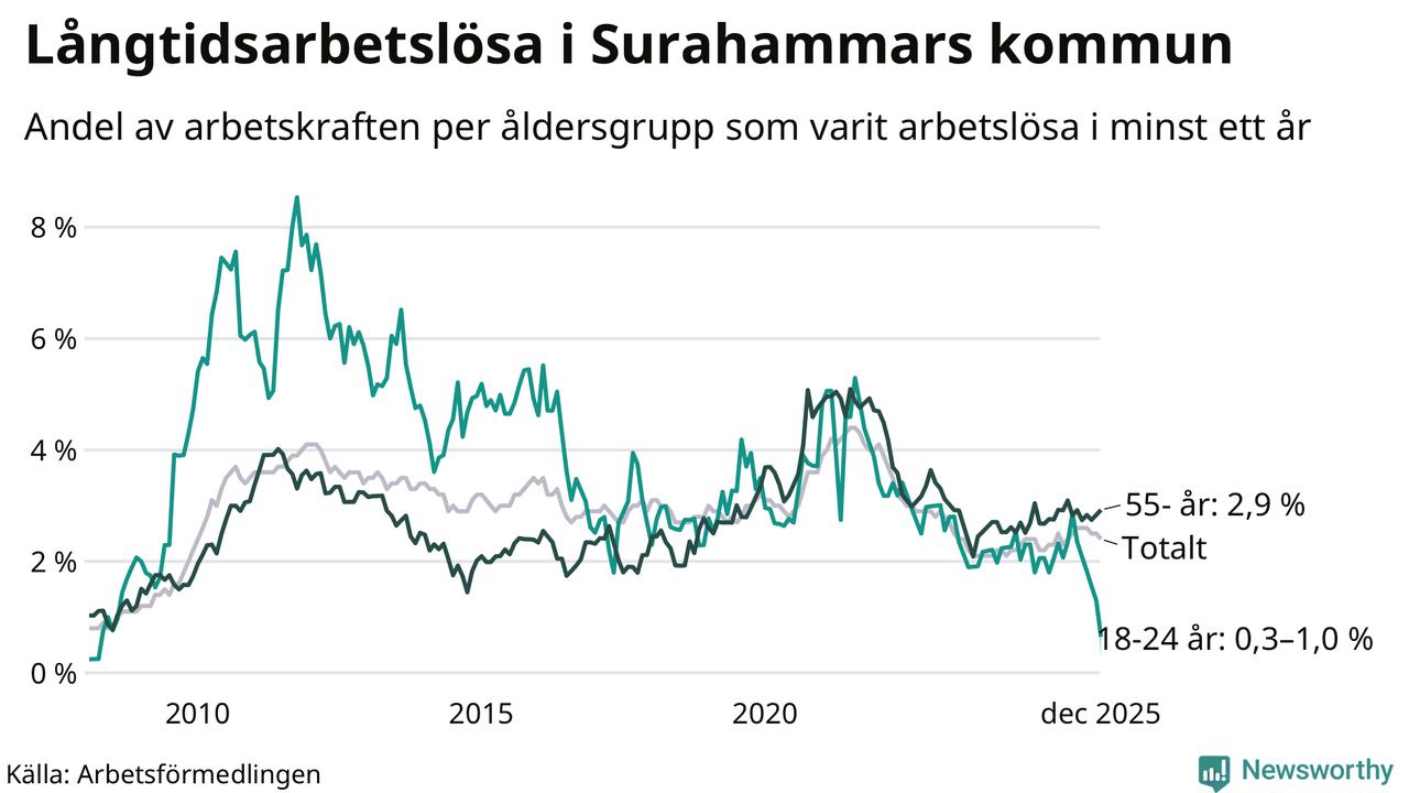 Av de 110 personerna som varit arbetslösa i mer än ett år i Surahammars kommun är 33 personer mellan 55 och 651 år och mellan en och fyra är mellan 18 och 24 år. För den äldre gruppen är andelen arbetslösa 2,9 procent medan den i den yngre gruppen är mellan 0,3 och 1,0 procent. Även i riket som helhet är långtidsarbetslösheten högre i gruppen äldre.